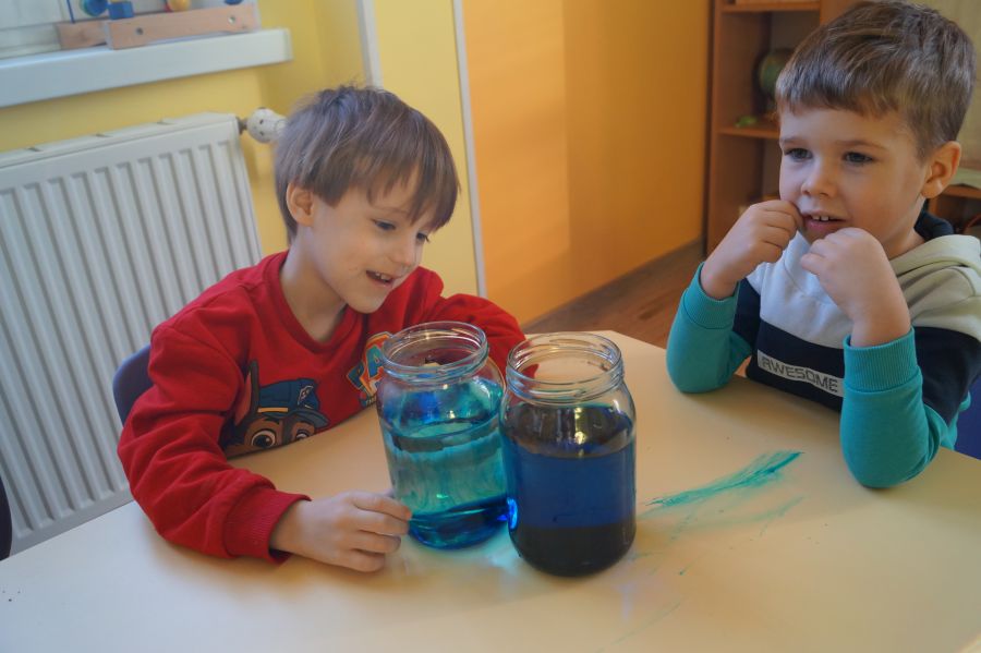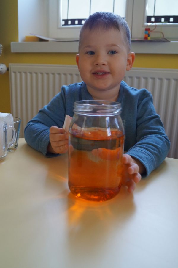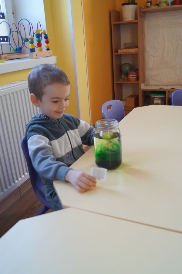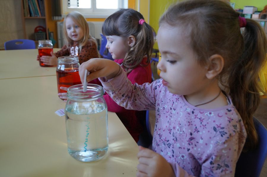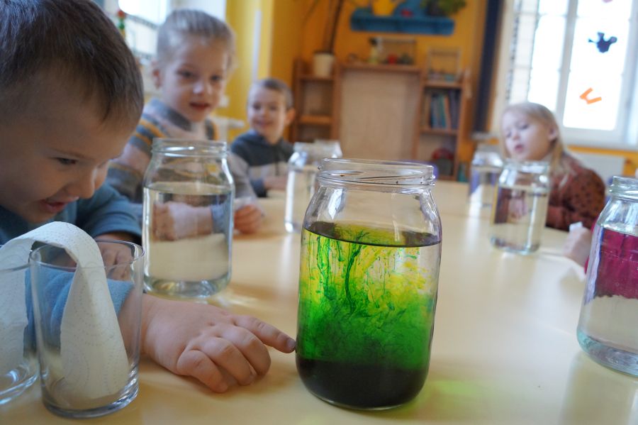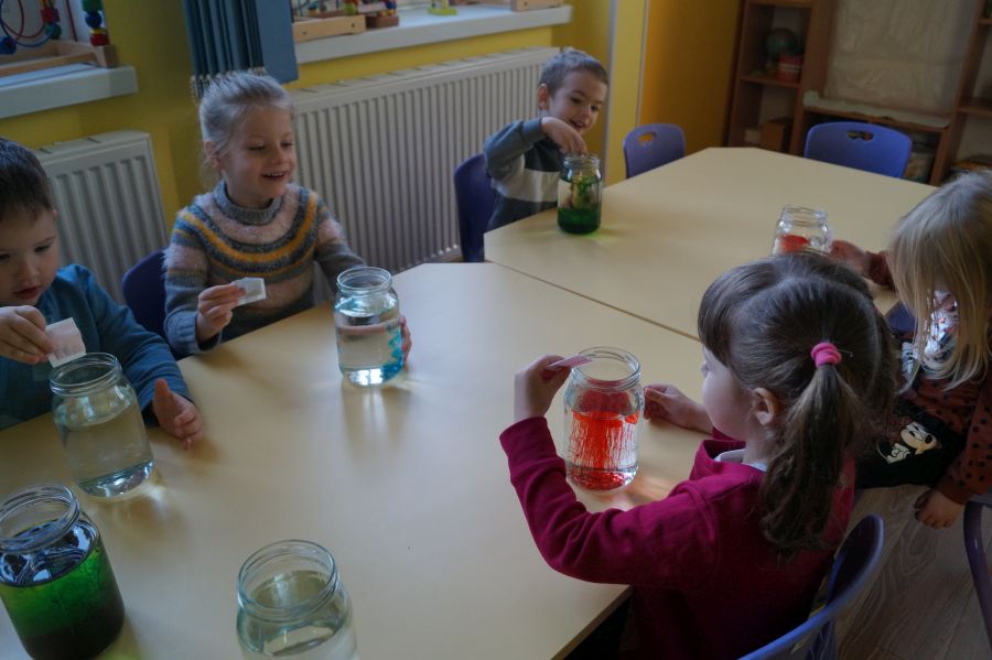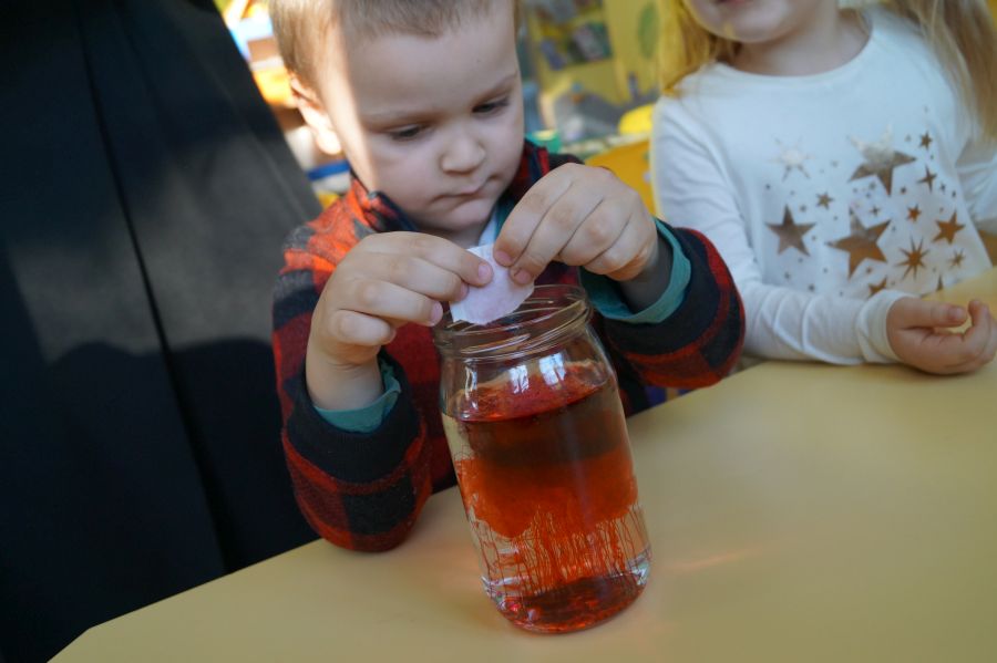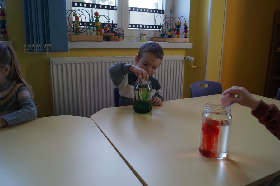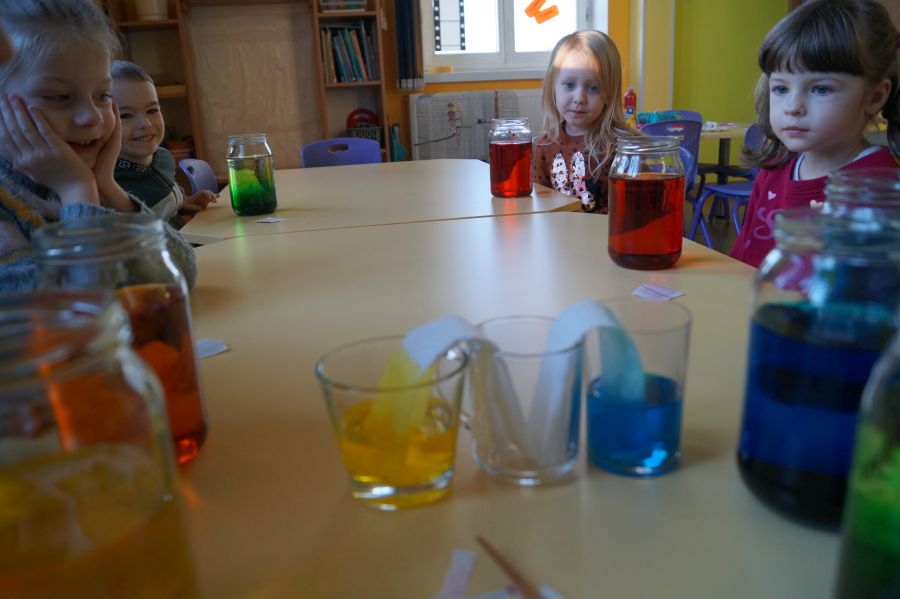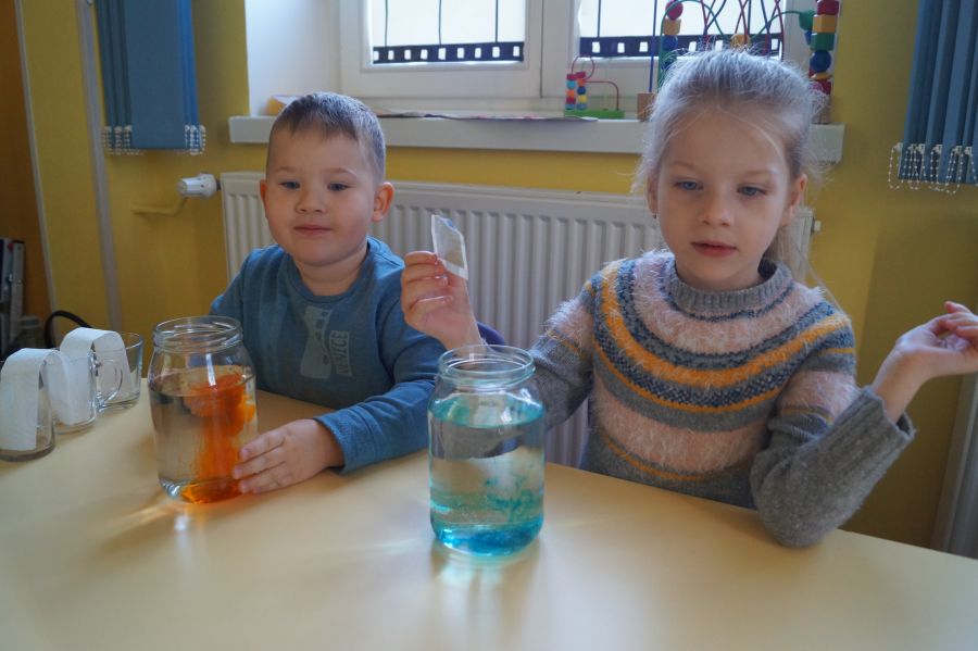 Wszystkie dzieci kochają zabawy badawcze. Nasze maluchy bawiły się kolorami i wywoływało to zachwyt na ich twarzach. Bardzo interesująca okazała się także „wędrująca woda.”
