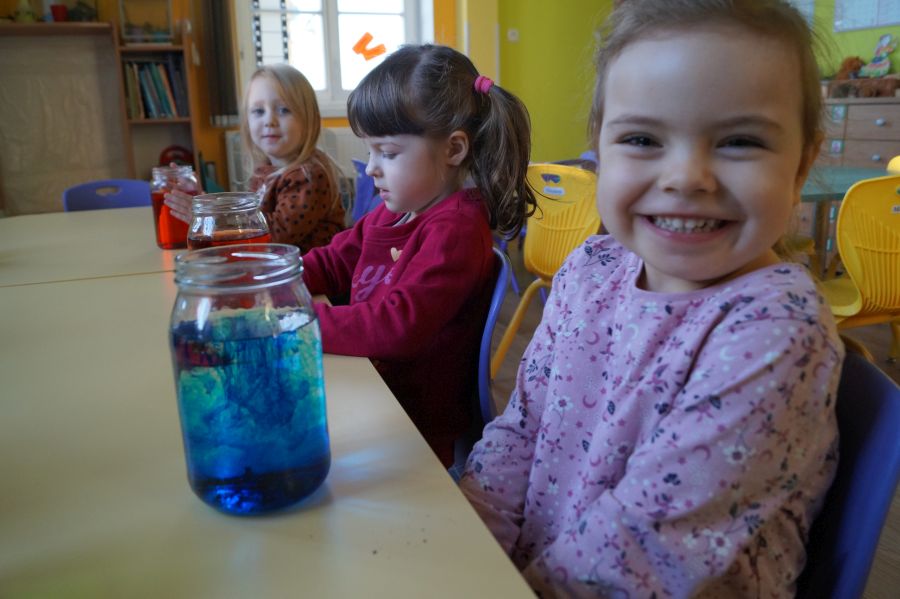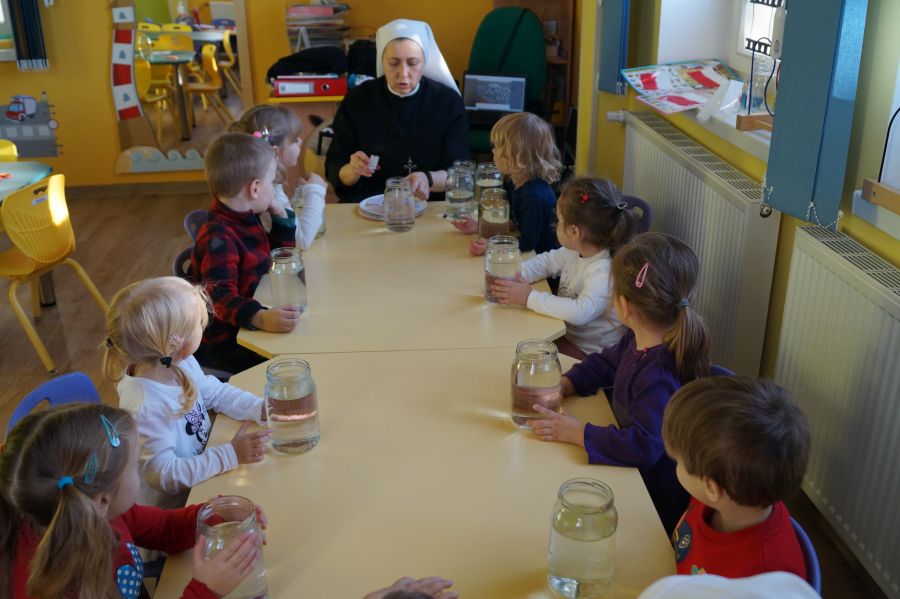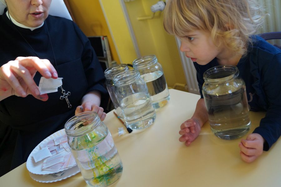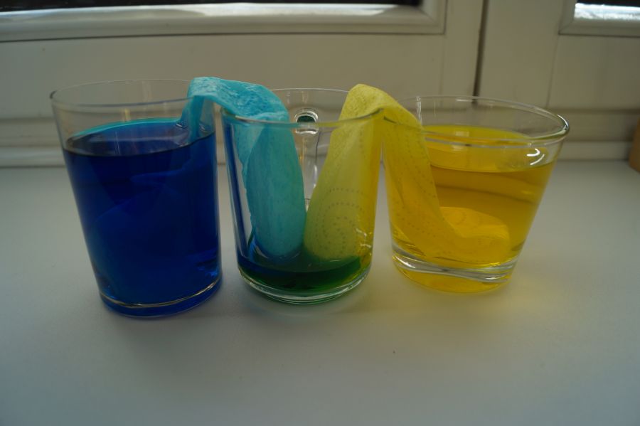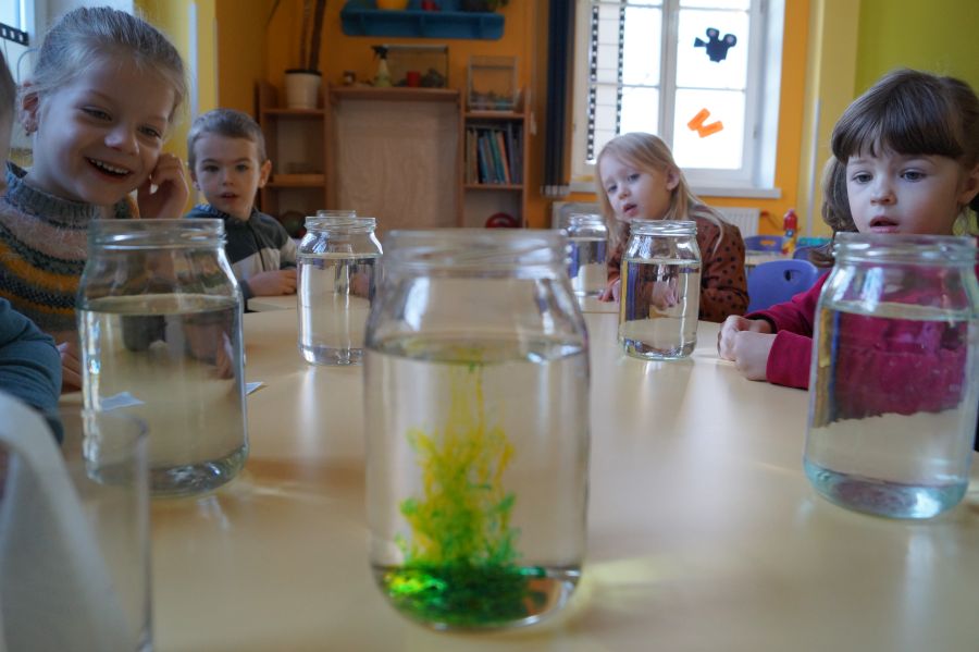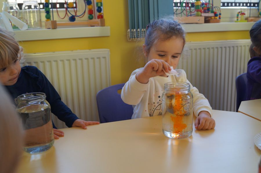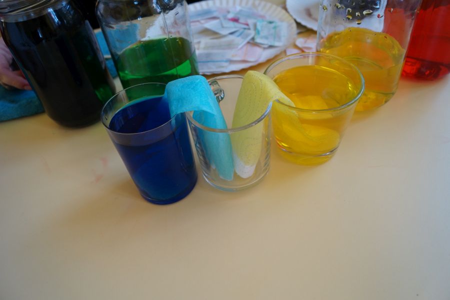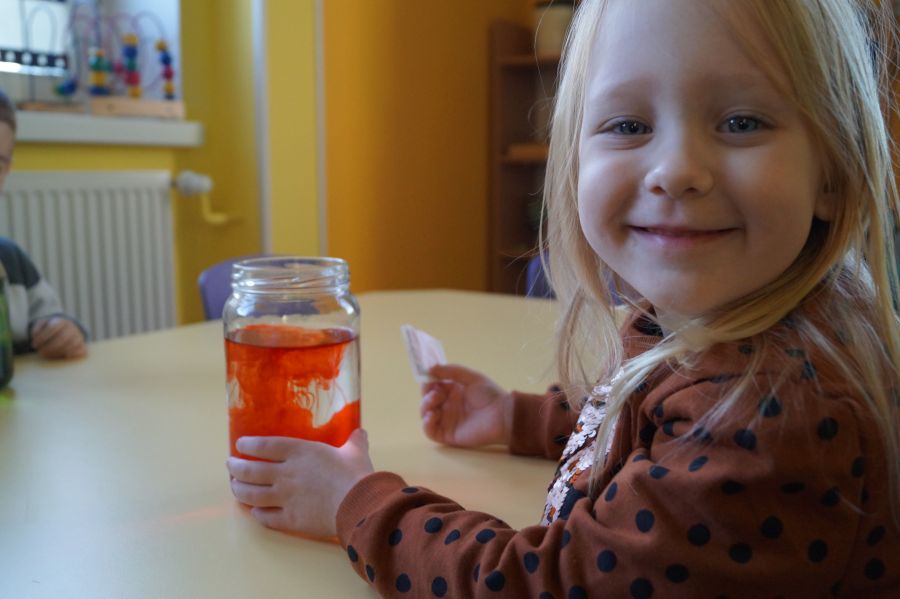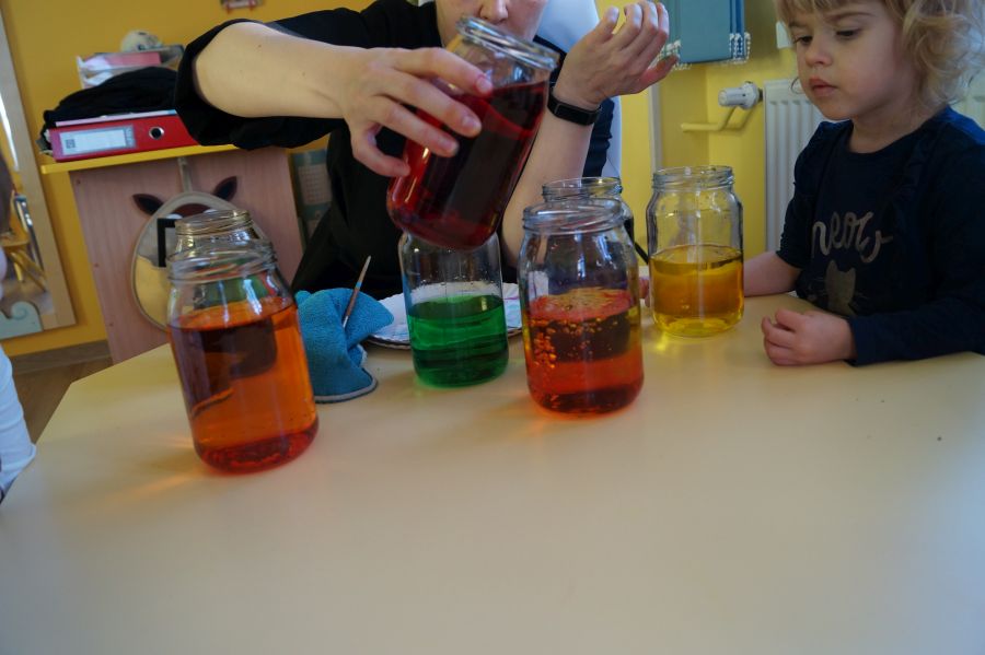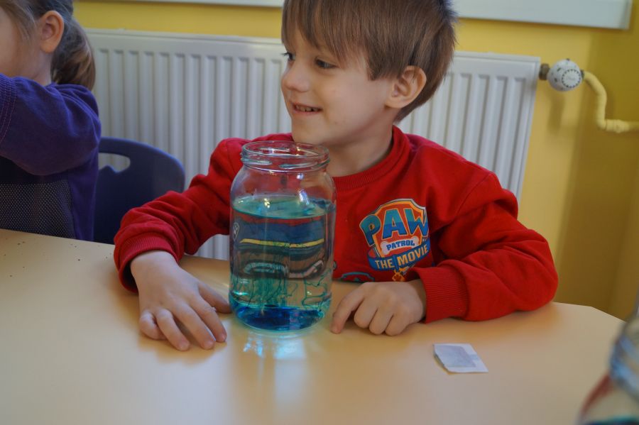Wszystkie dzieci kochają zabawy badawcze. Nasze maluchy bawiły się kolorami i wywoływało to zachwyt na ich twarzach. Bardzo interesująca okazała się także „wędrująca woda.”