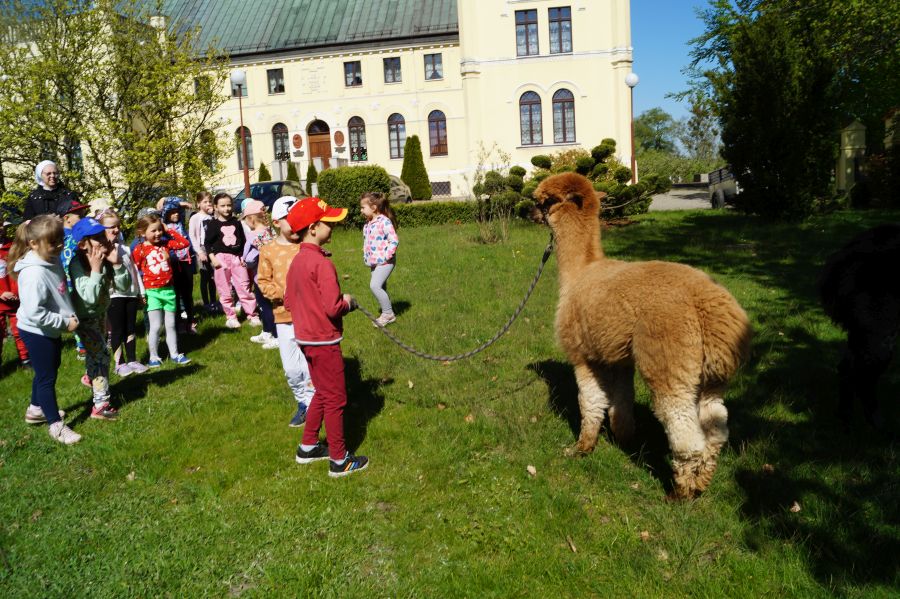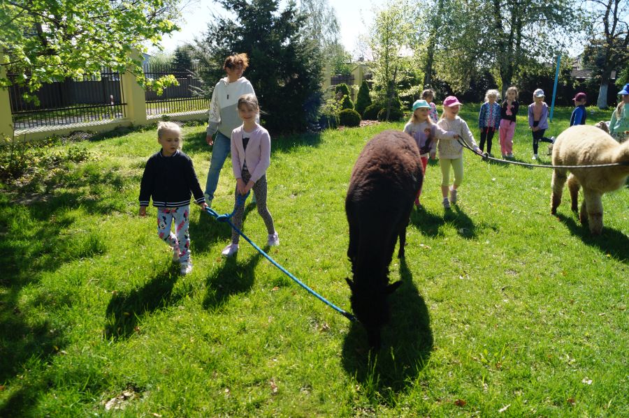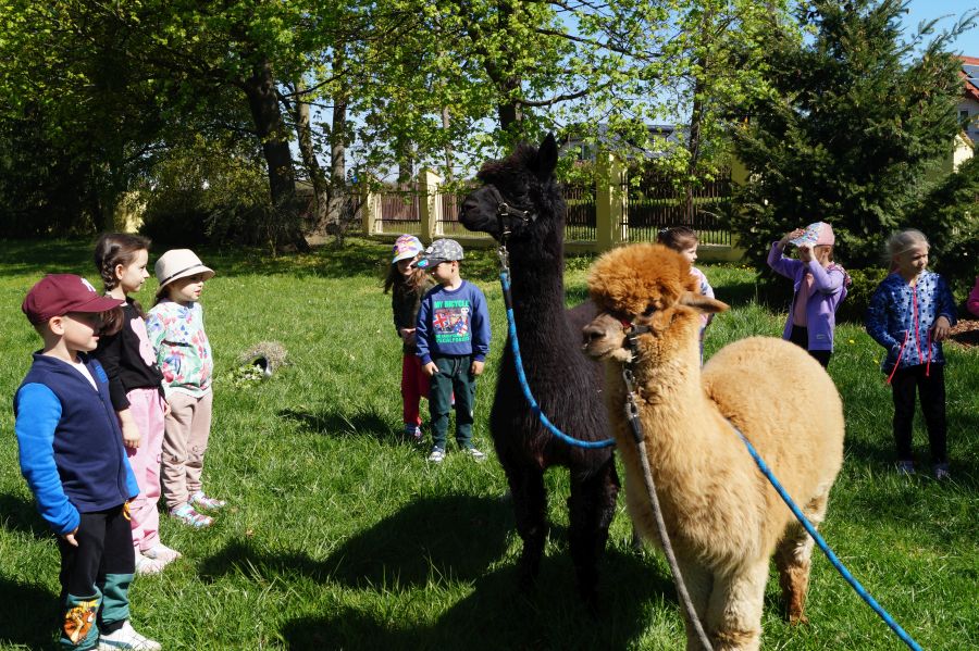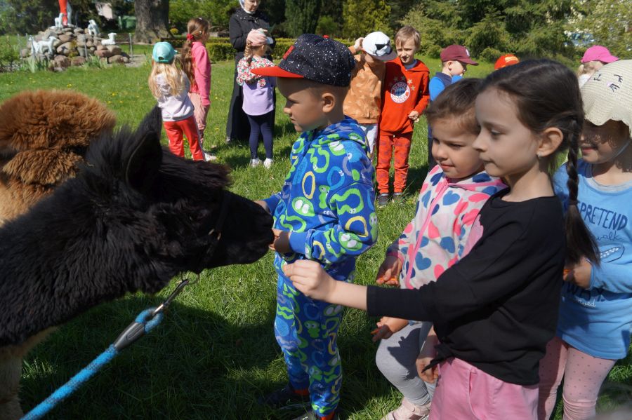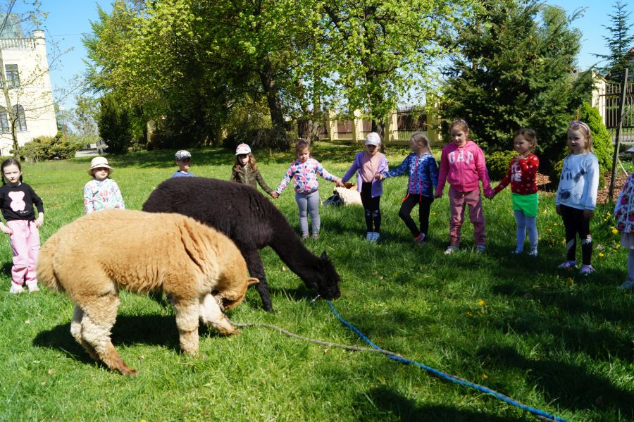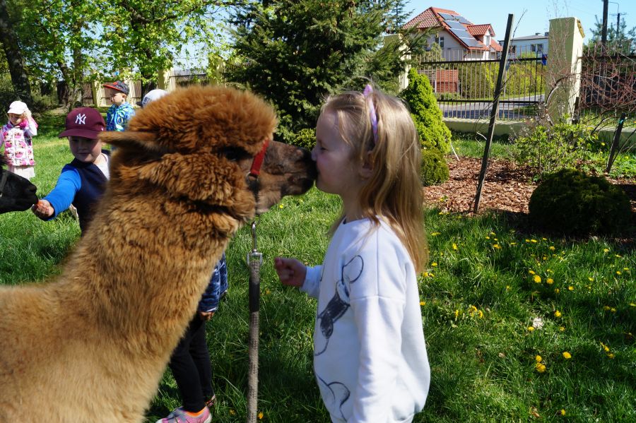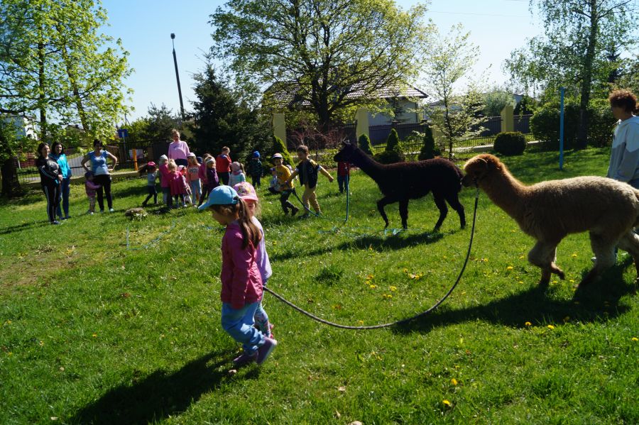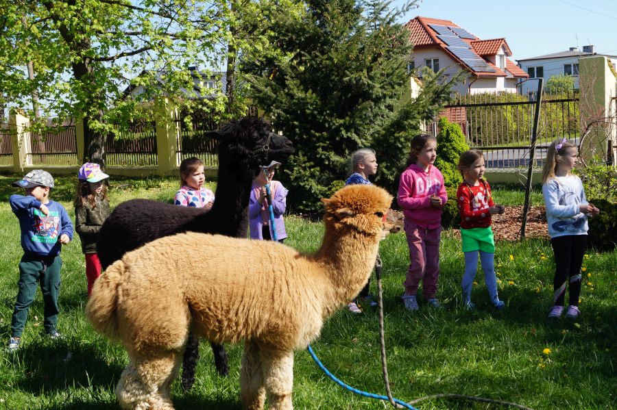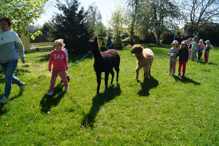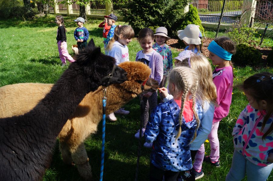 Dziś w przedszkolu niecodzienni goście, maluchy mówiły, że koniki, ale nie mogły na nich jeździć… Odwiedziły nas alpaki- Groszek i Cynamon, wraz z opiekunką ze „Stacji Alpaki” z Kruszyńca. Dzieci dowiedziały się wielu ciekawostek, mogły nakarmić i oprowadzać zwierzęta.