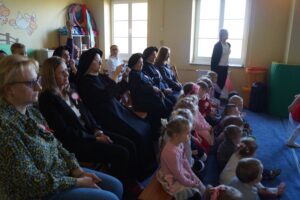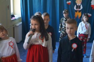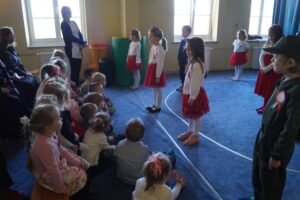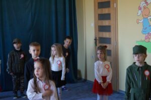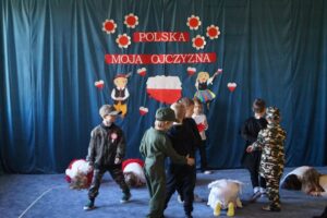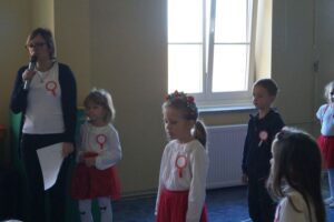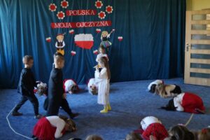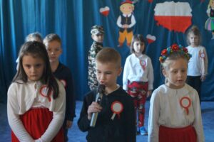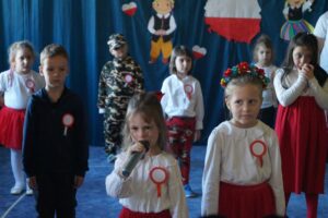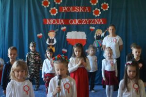 Z okazji Święta Niepodległości naszej Ojczyzny dzieci z grupy starszej, pod kierunkiem p. Katarzyny i p. Michaliny przygotowały montaż słowno- muzyczny. Było to bardzo wzruszające przedstawienie…pełne zadumy…Cała społeczność przedszkola wspólnie odśpiewała również Hymn Narodowy.