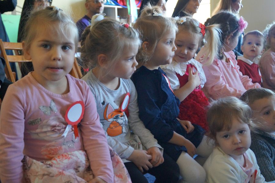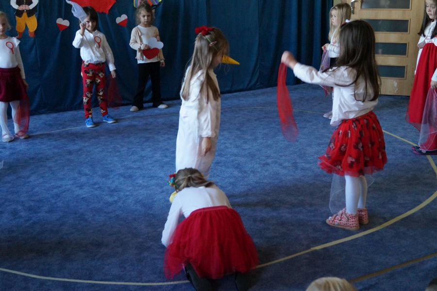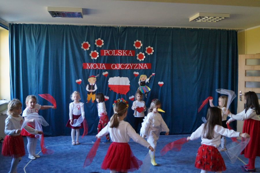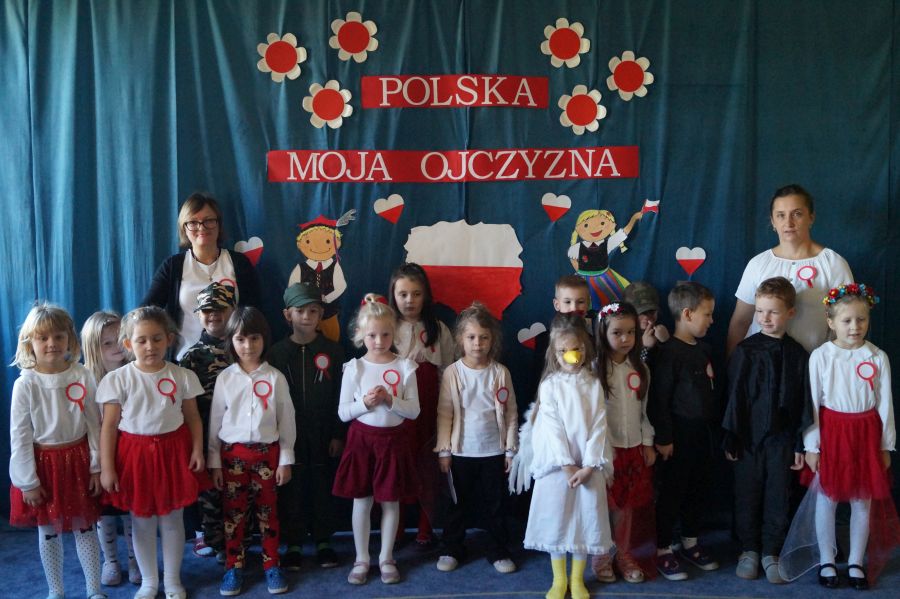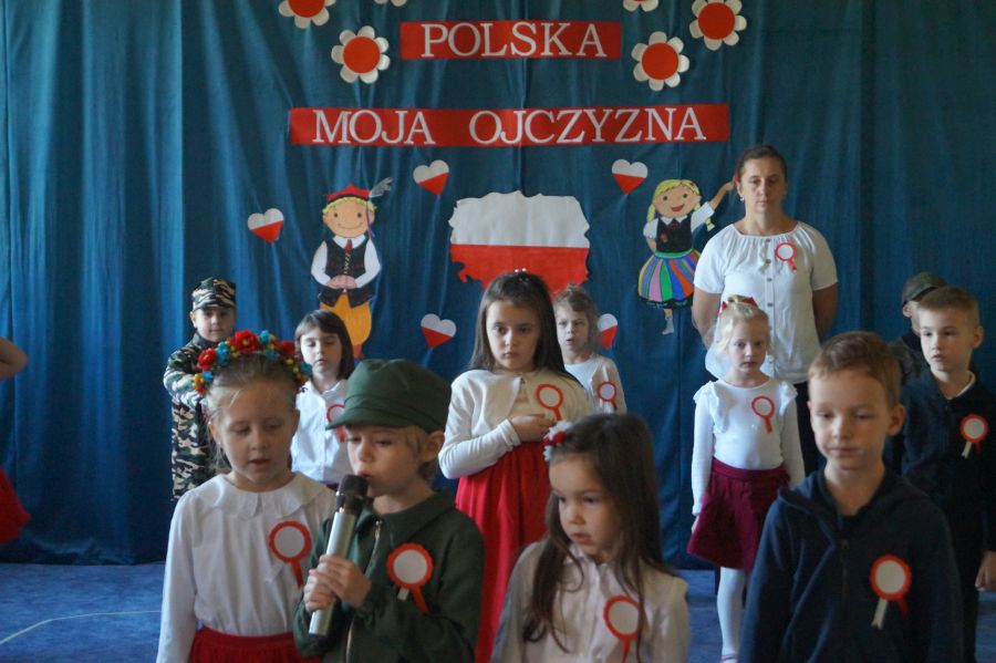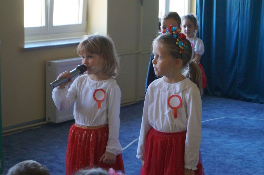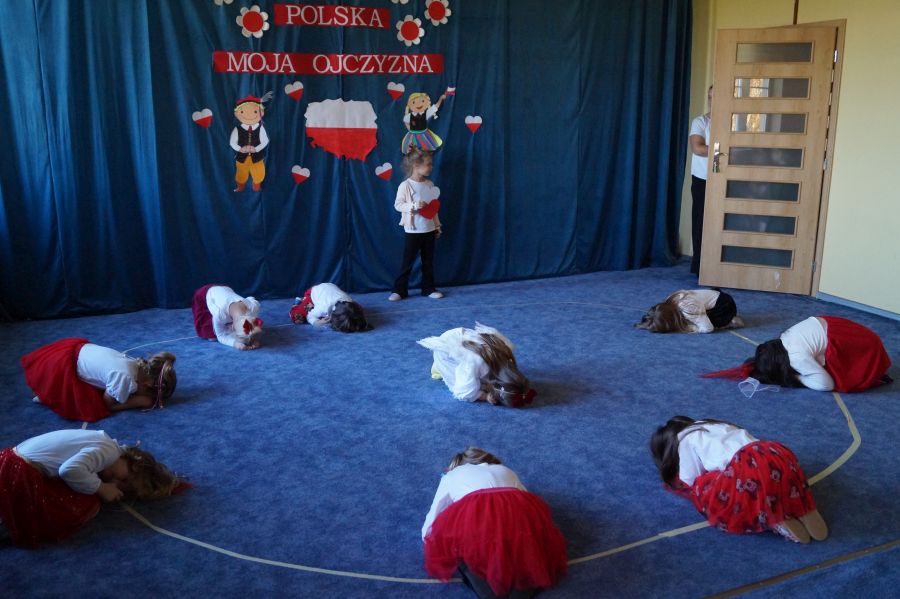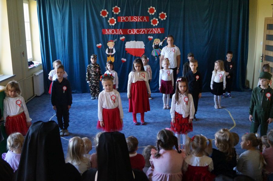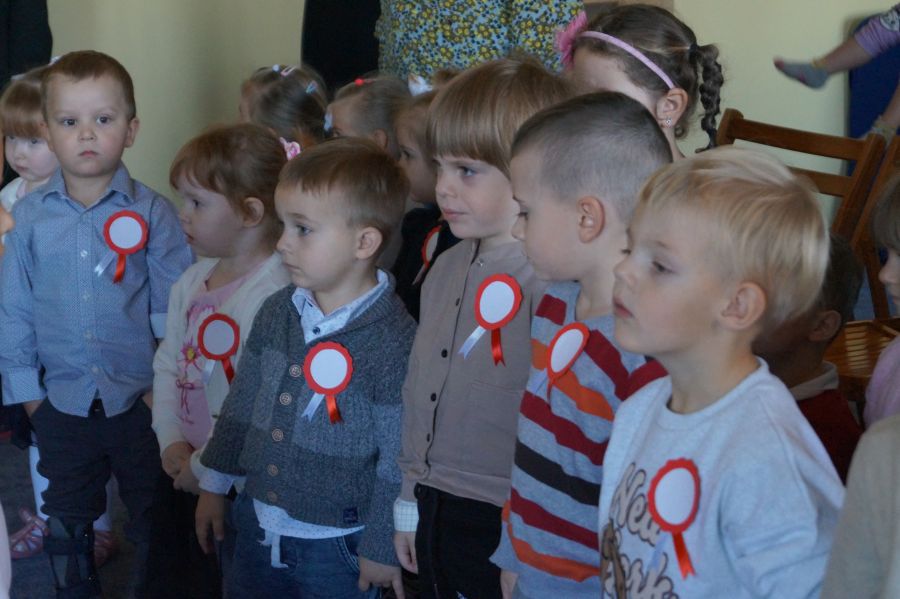 Z okazji Święta Niepodległości naszej Ojczyzny dzieci z grupy starszej, pod kierunkiem p. Katarzyny i p. Michaliny przygotowały montaż słowno- muzyczny. Było to bardzo wzruszające przedstawienie…pełne zadumy…Cała społeczność przedszkola wspólnie odśpiewała również Hymn Narodowy.