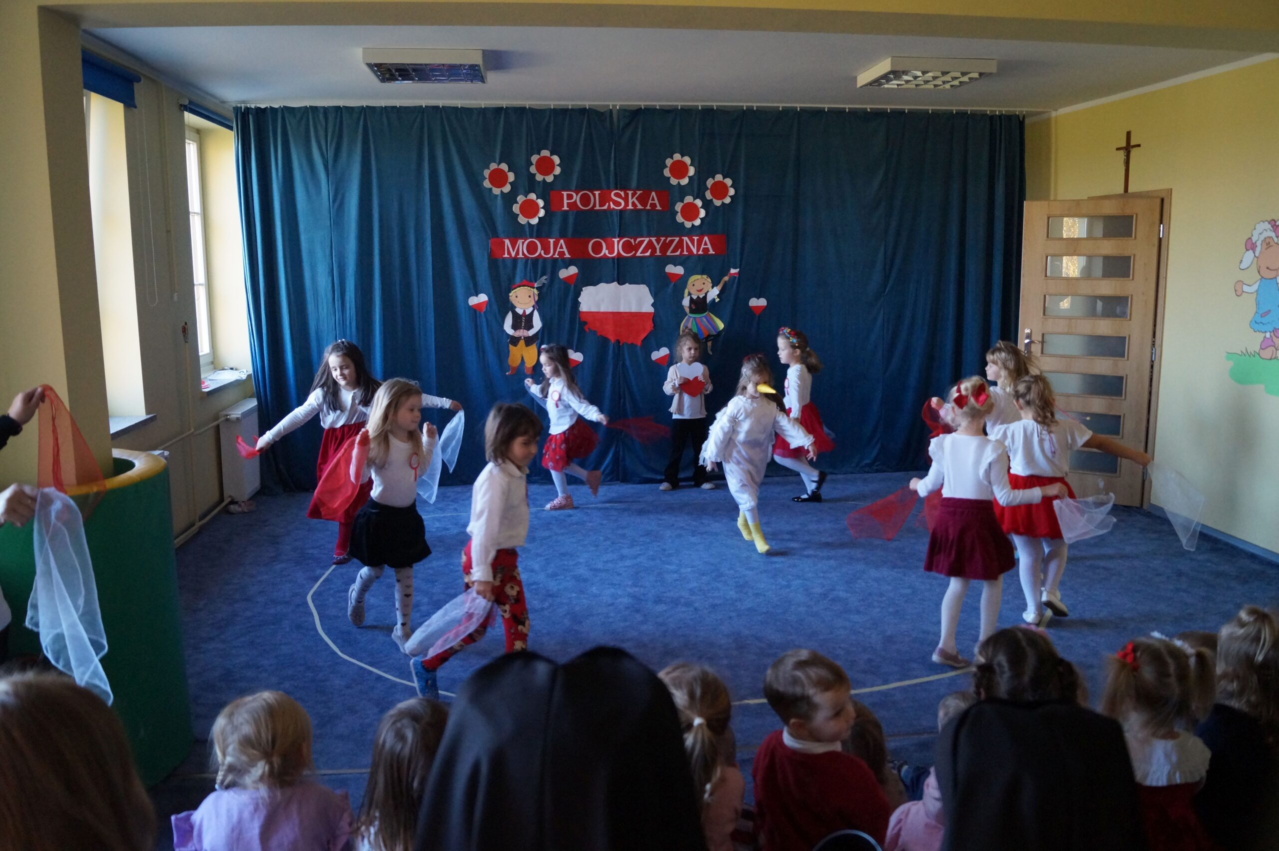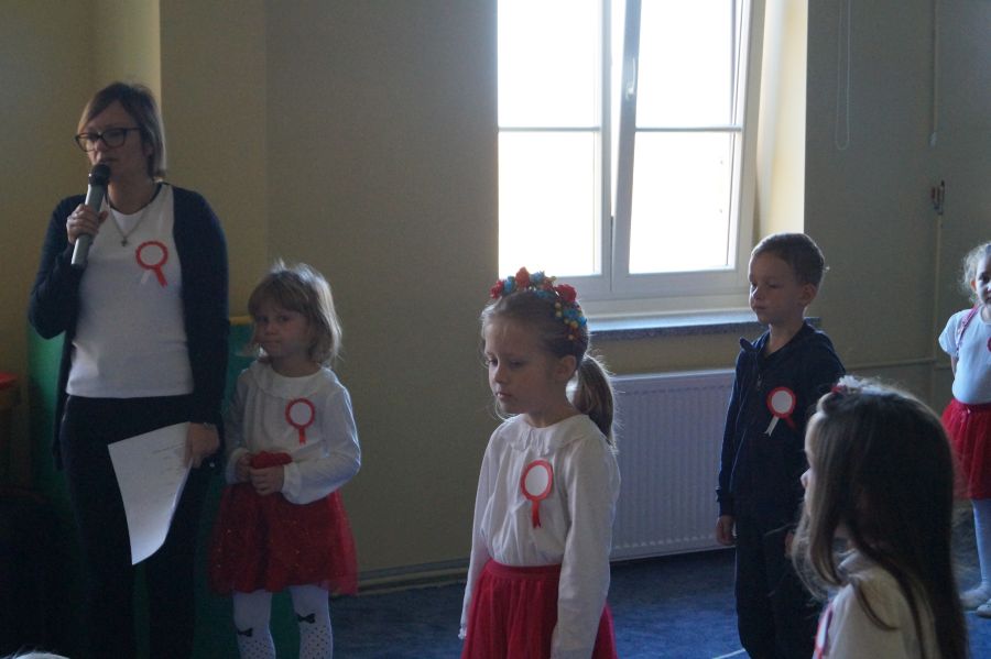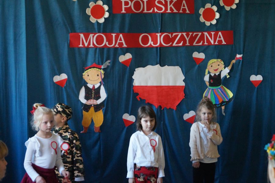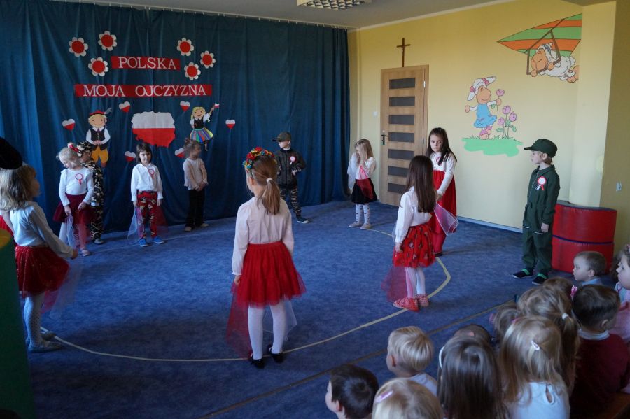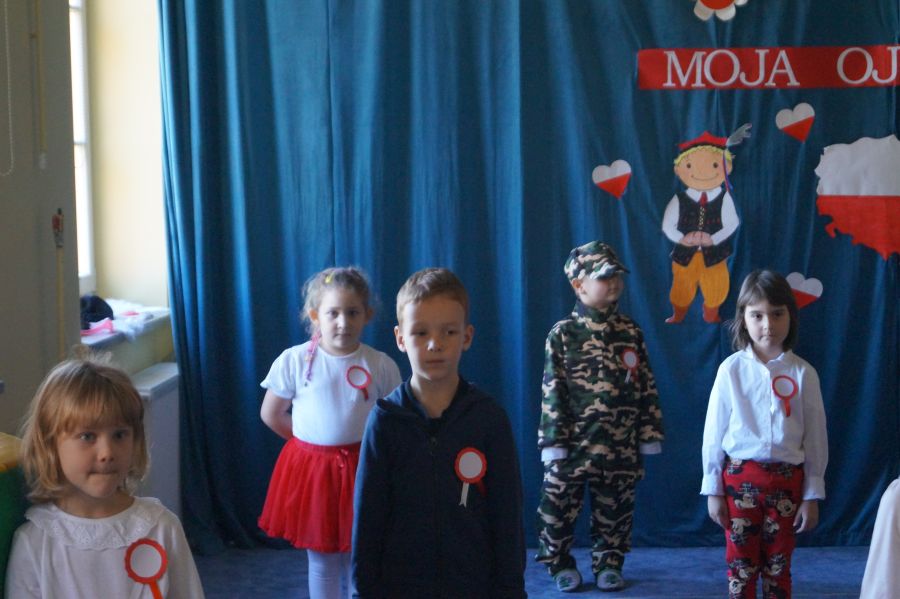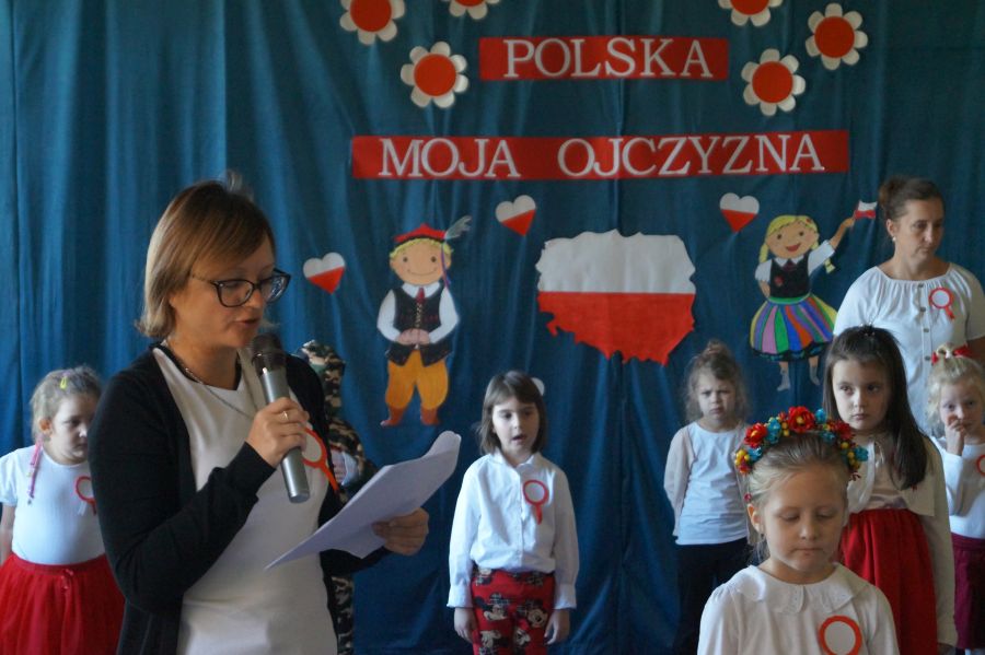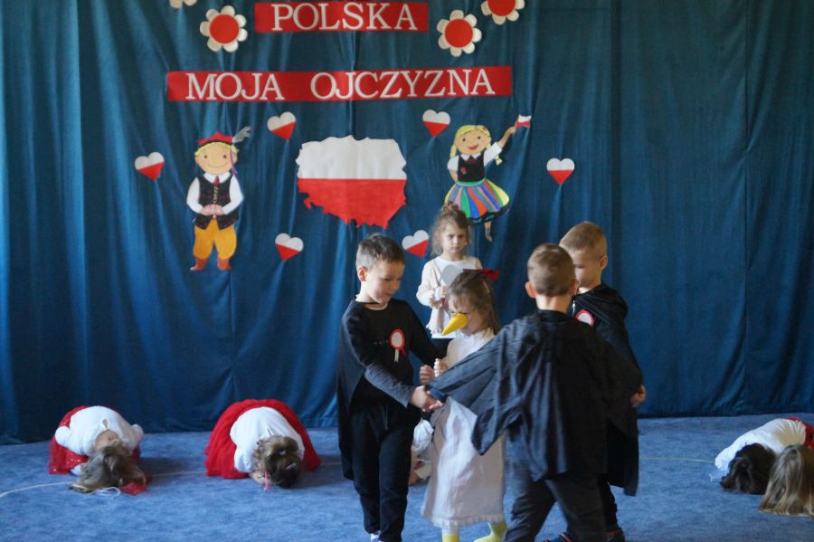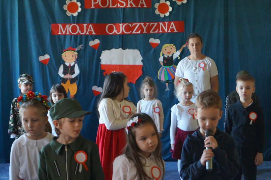 Z okazji Święta Niepodległości naszej Ojczyzny dzieci z grupy starszej, pod kierunkiem p. Katarzyny i p. Michaliny przygotowały montaż słowno- muzyczny. Było to bardzo wzruszające przedstawienie…pełne zadumy…Cała społeczność przedszkola wspólnie odśpiewała również Hymn Narodowy.