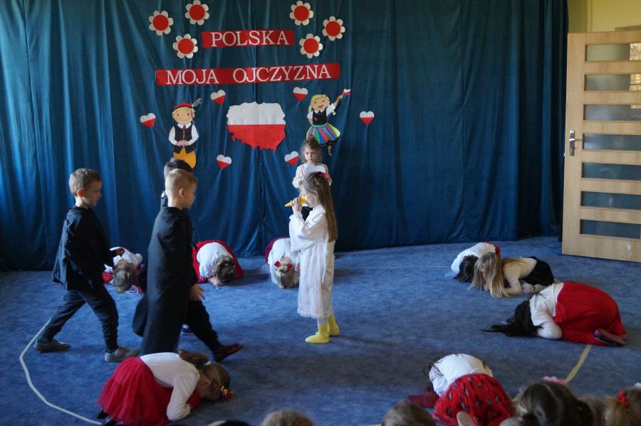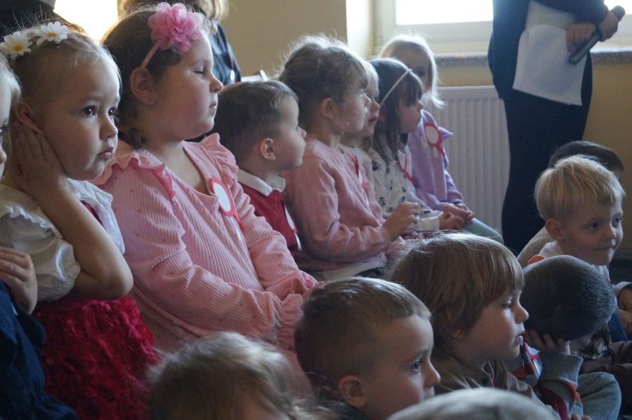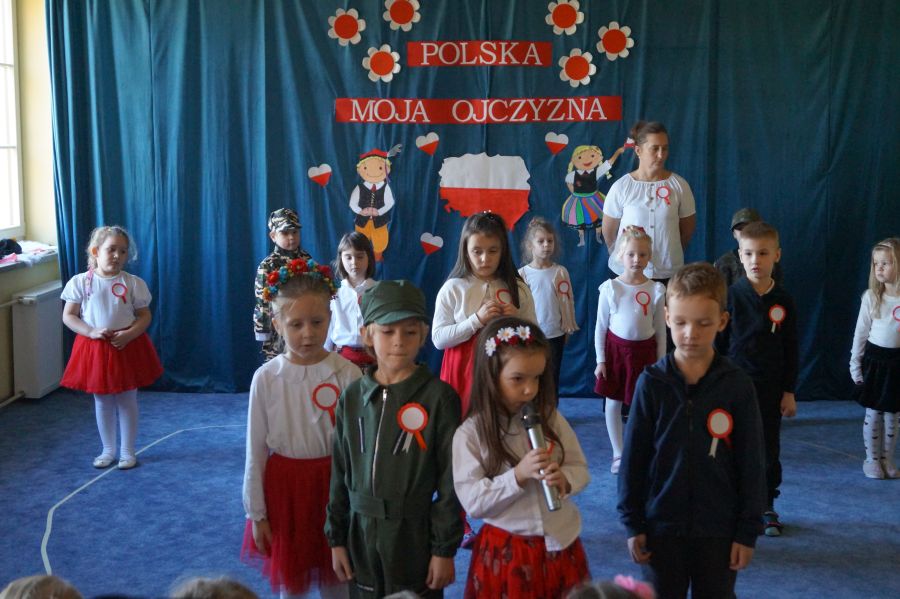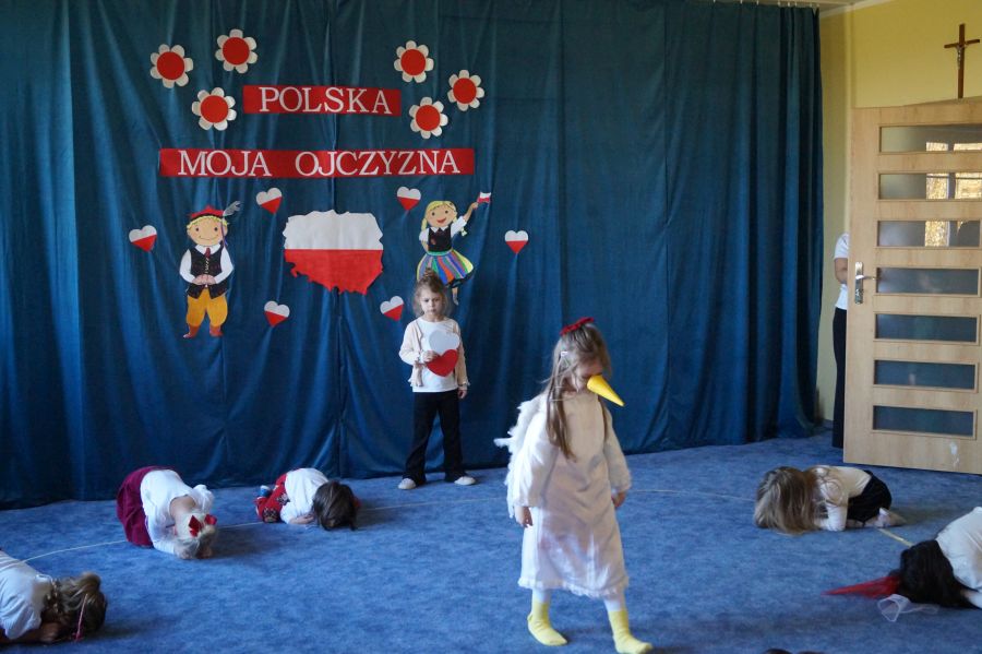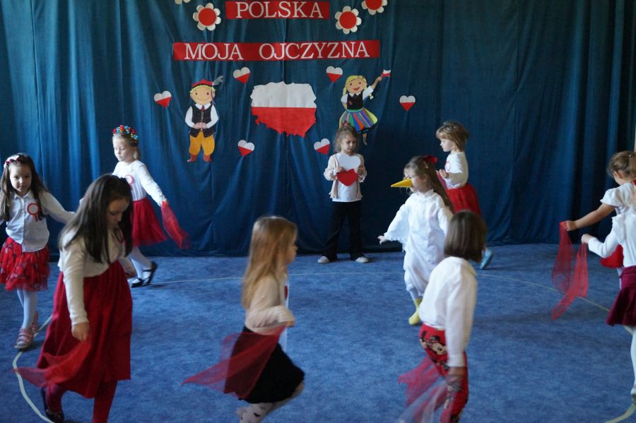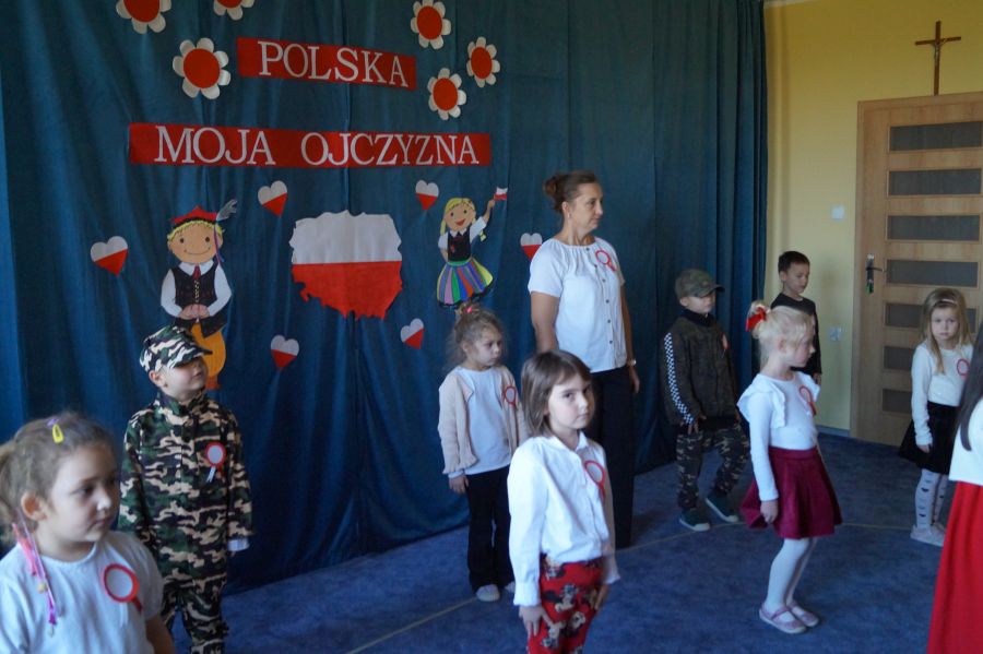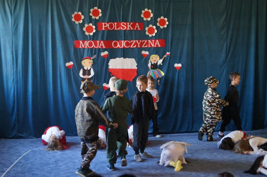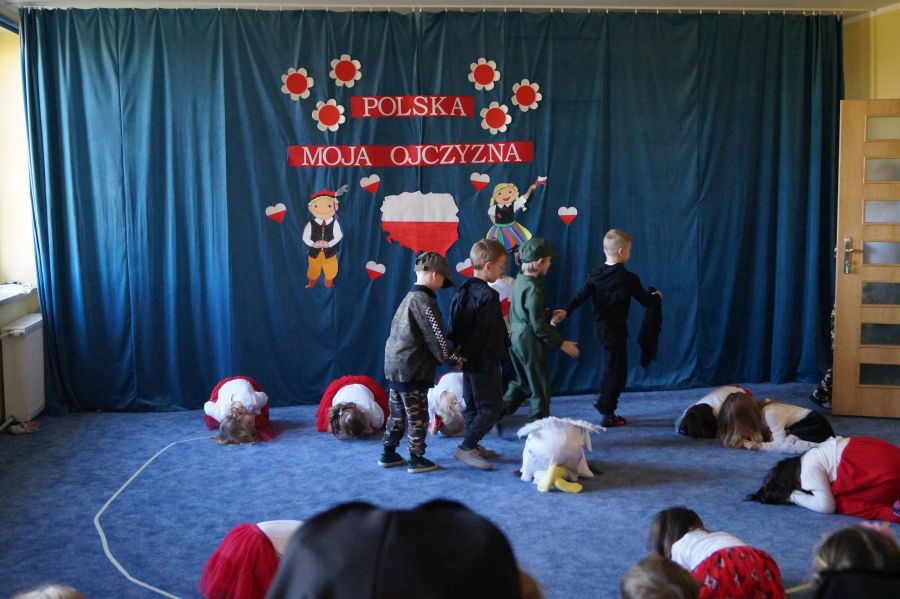 Z okazji Święta Niepodległości naszej Ojczyzny dzieci z grupy starszej, pod kierunkiem p. Katarzyny i p. Michaliny przygotowały montaż słowno- muzyczny. Było to bardzo wzruszające przedstawienie…pełne zadumy…Cała społeczność przedszkola wspólnie odśpiewała również Hymn Narodowy.