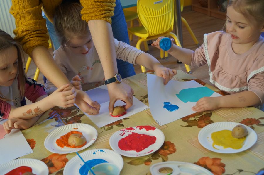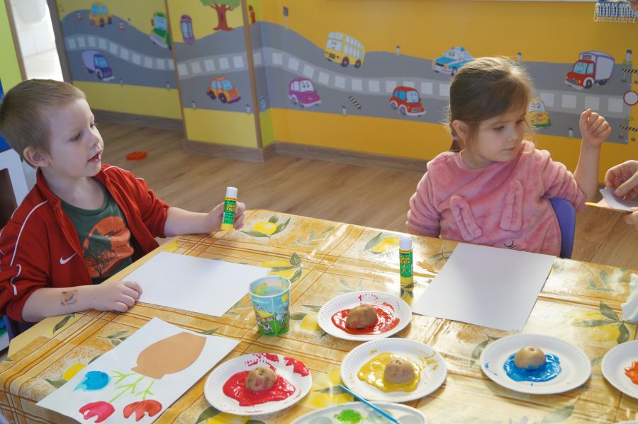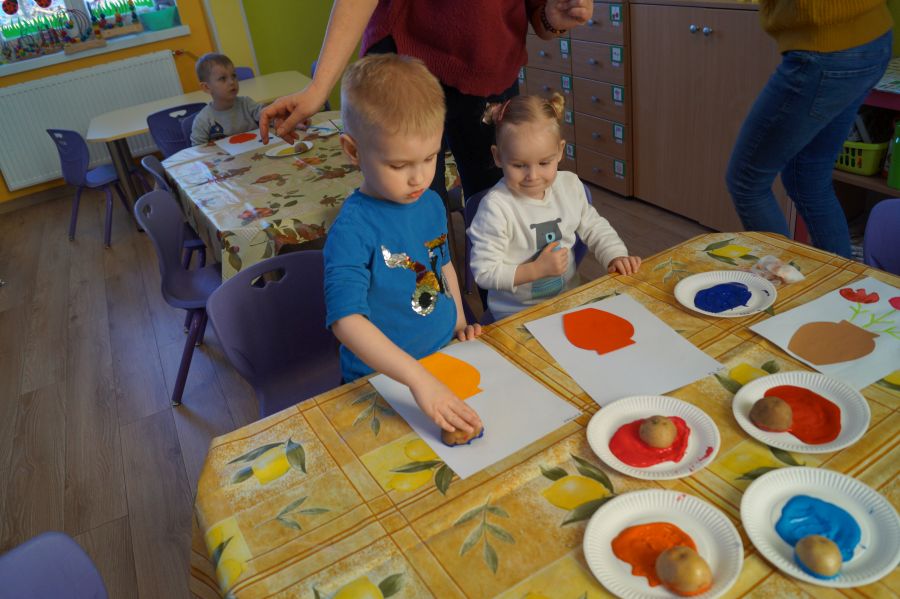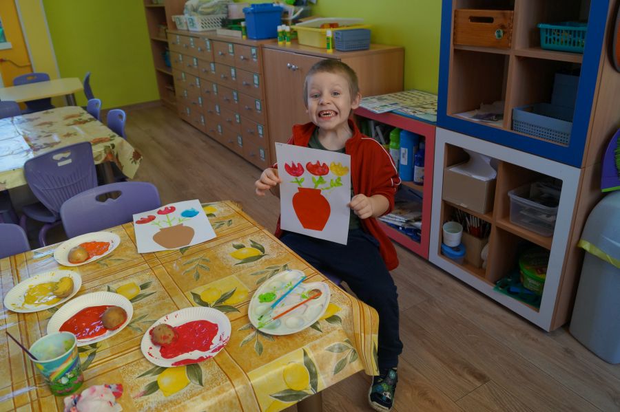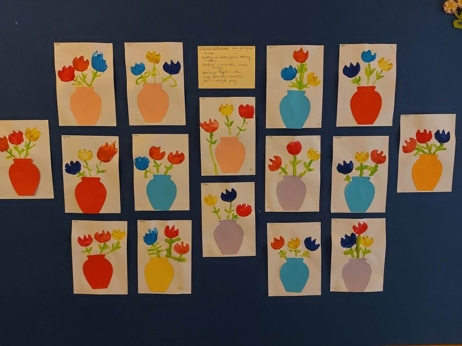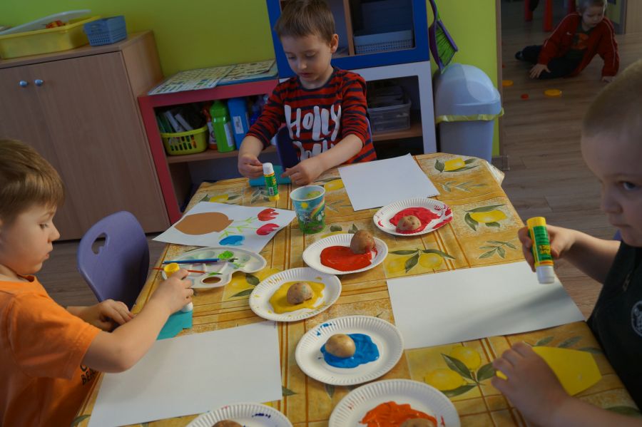 W grupie młodszej wiosenne zajęcia z arteterapii. Tym razem dzieci wykonały tulipany przy pomocy stempli z ziemniaków. Powstały naprawdę ładne prace.