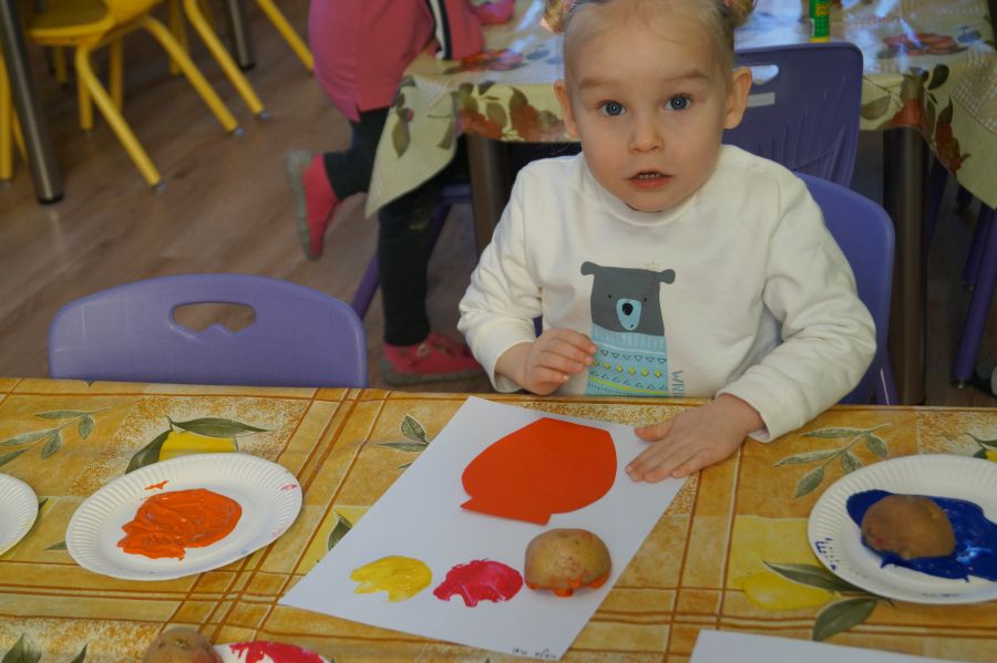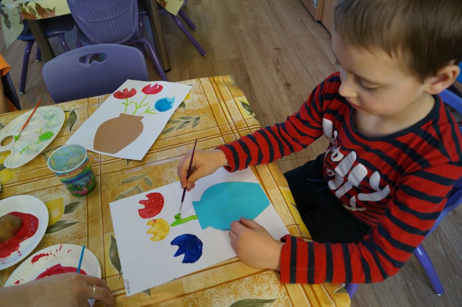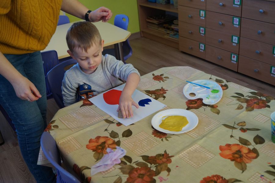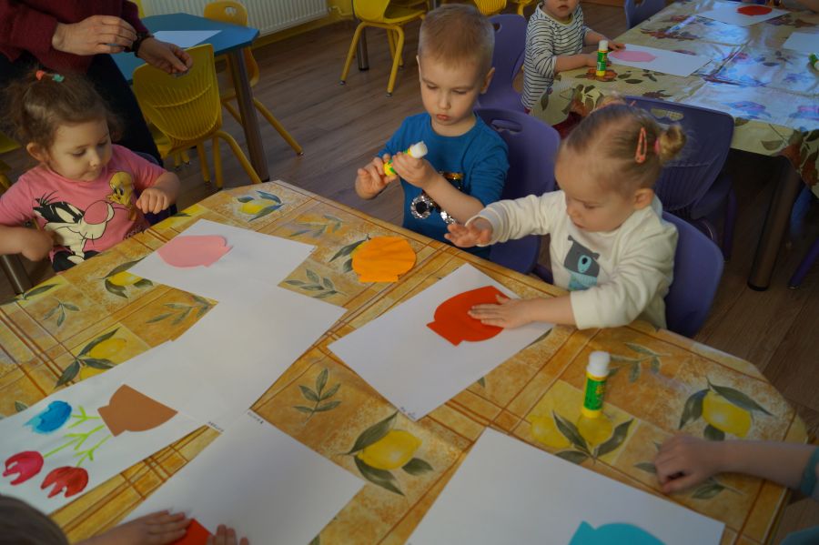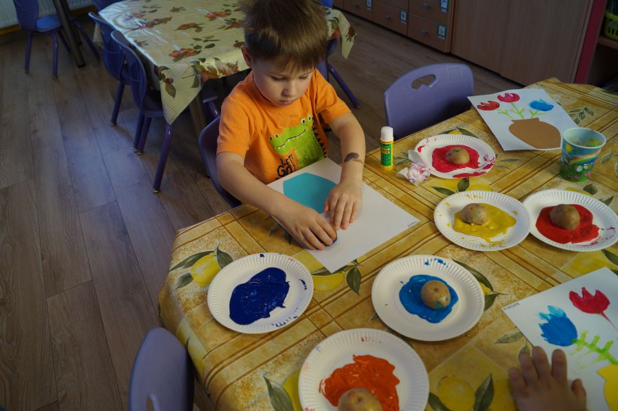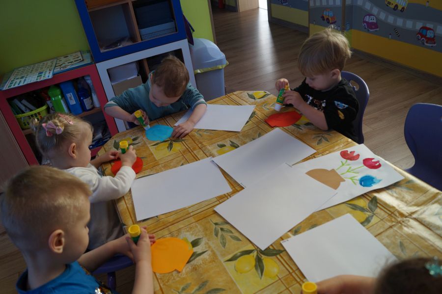 W grupie młodszej wiosenne zajęcia z arteterapii. Tym razem dzieci wykonały tulipany przy pomocy stempli z ziemniaków. Powstały naprawdę ładne prace.