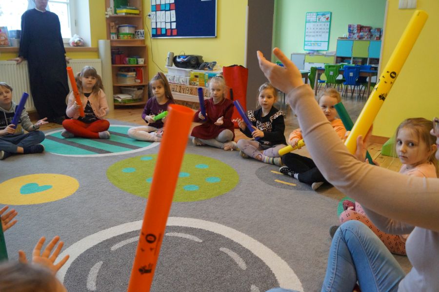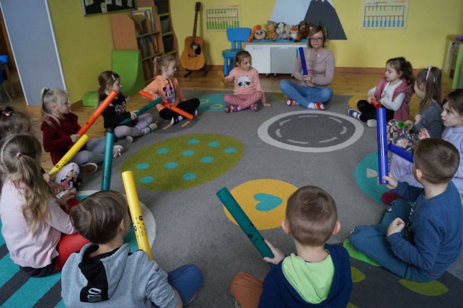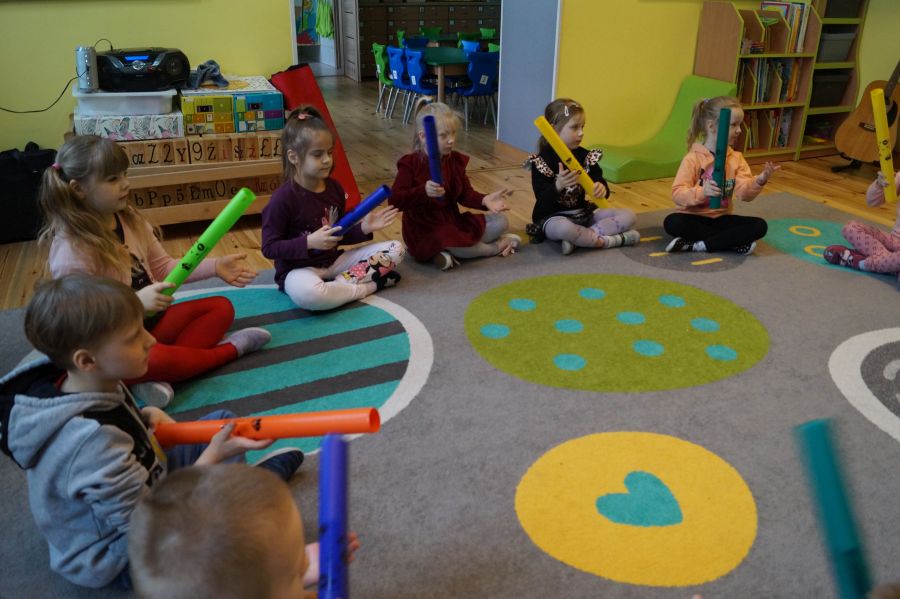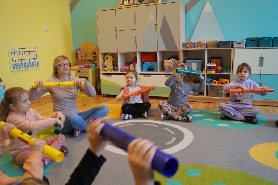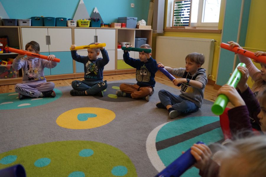 W grupie starszej odbyły się kolejne zajęcia z arteterapii, tym razem w odsłonie zabaw muzycznych. Dzieci zagrały na bumbumrurkach utwory „Bingo” i „Trzy kurki”.