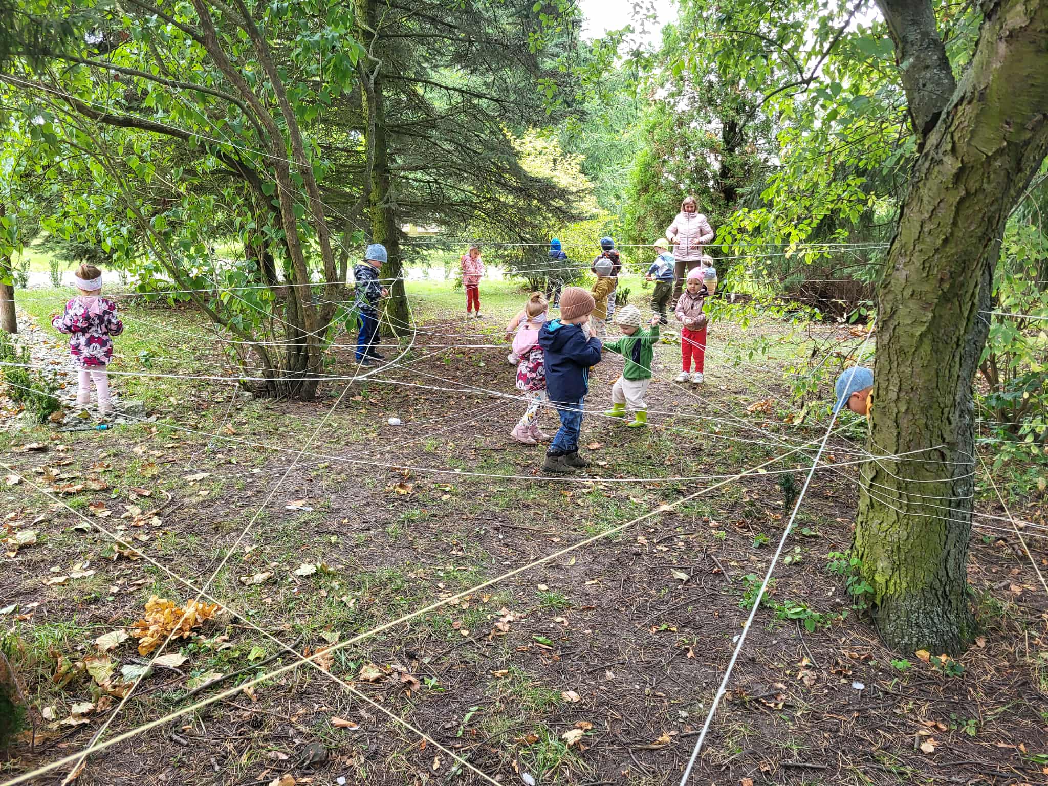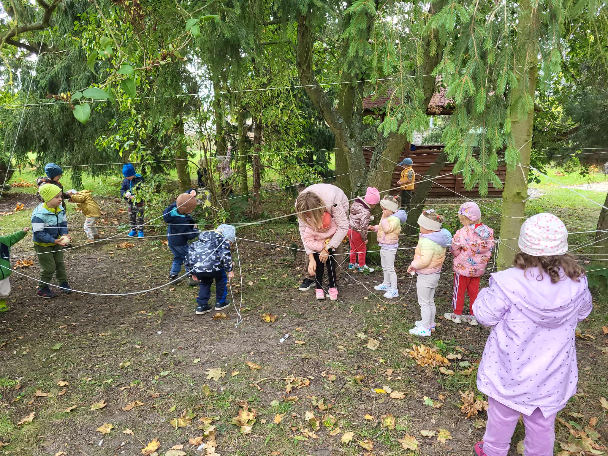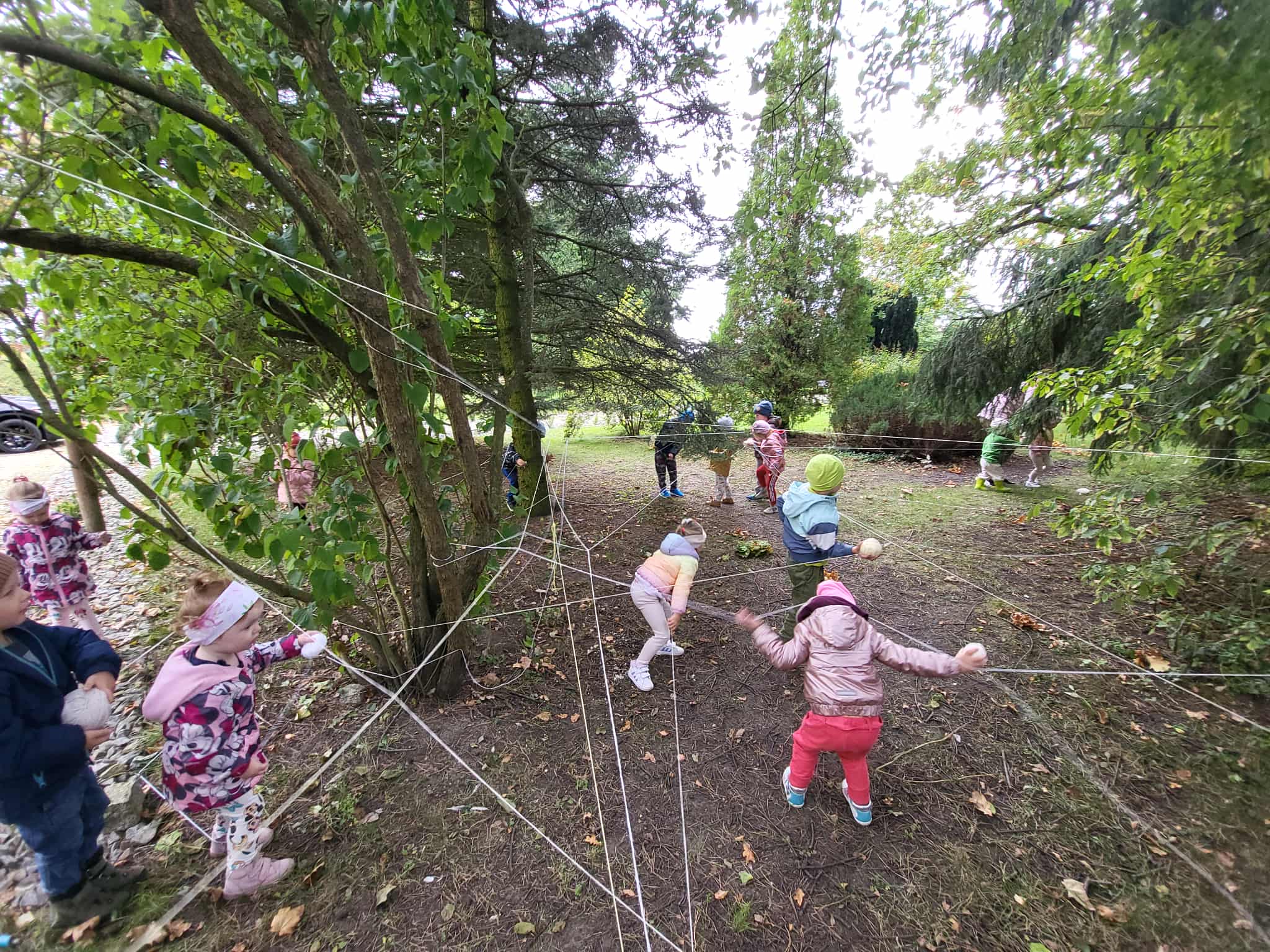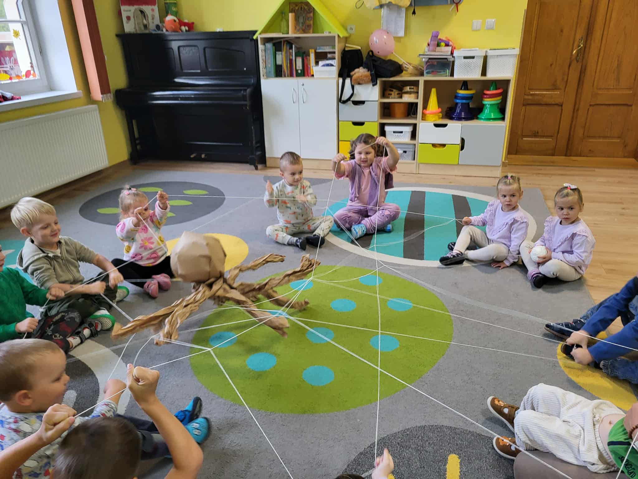 Dzieci młodsze „zamieniły się ” dzisiaj w małe pająki, które tkały sieci w przedszkolnym ogrodzie. Dzięki temu poznaliśmy termin „babie lato”, dzieci ćwiczyły też koordynację wzrokowo- ruchową i ogólną sprawność. Nasz ogród wzbogacił się o nowego mieszkańca- dużego pająka zrobionego przez dzieci. 😉