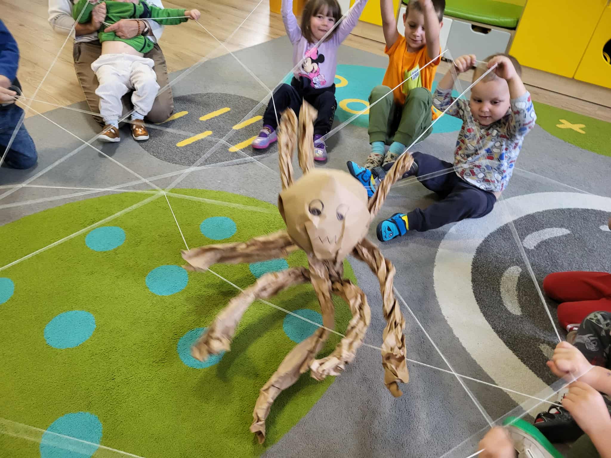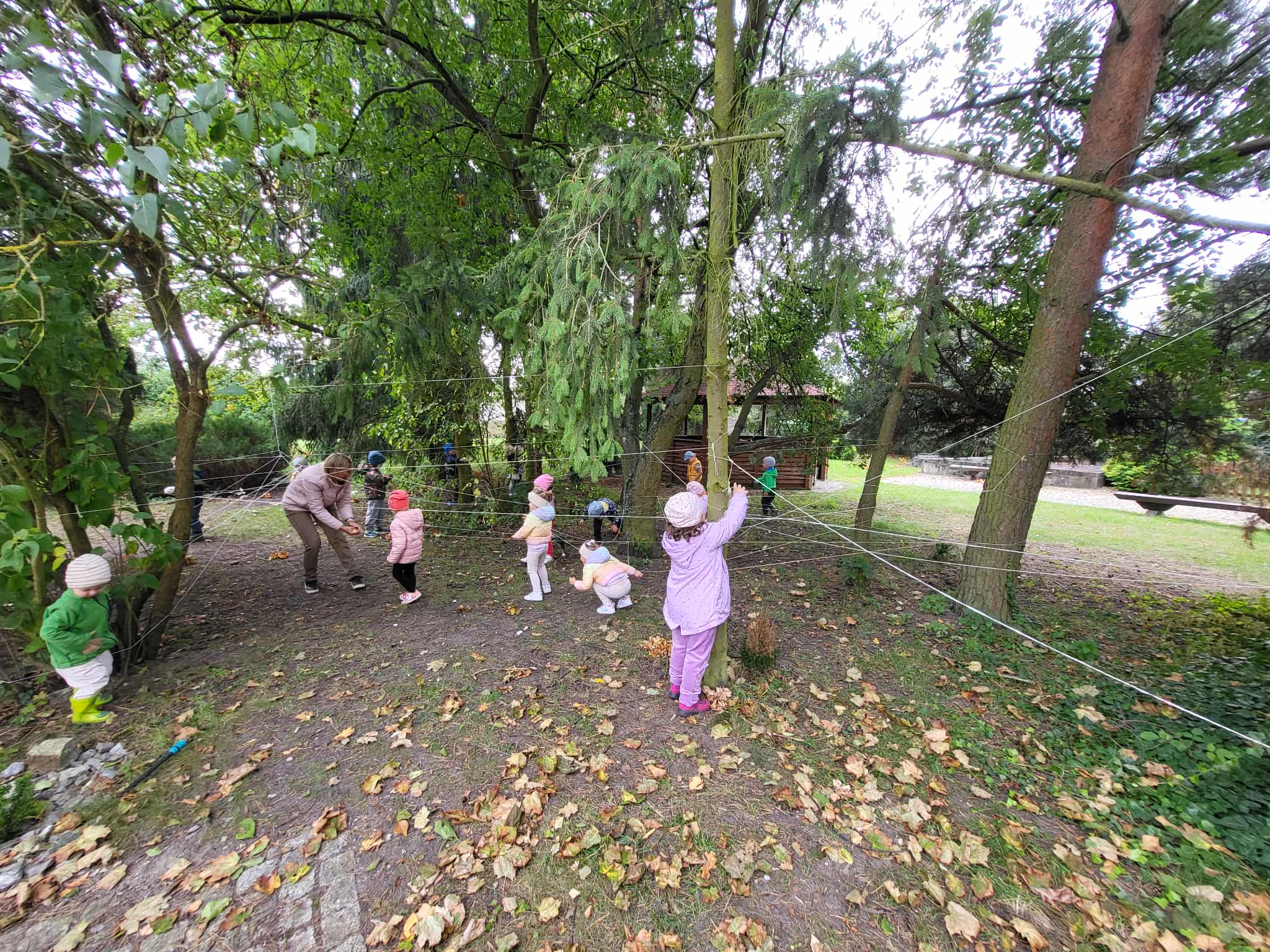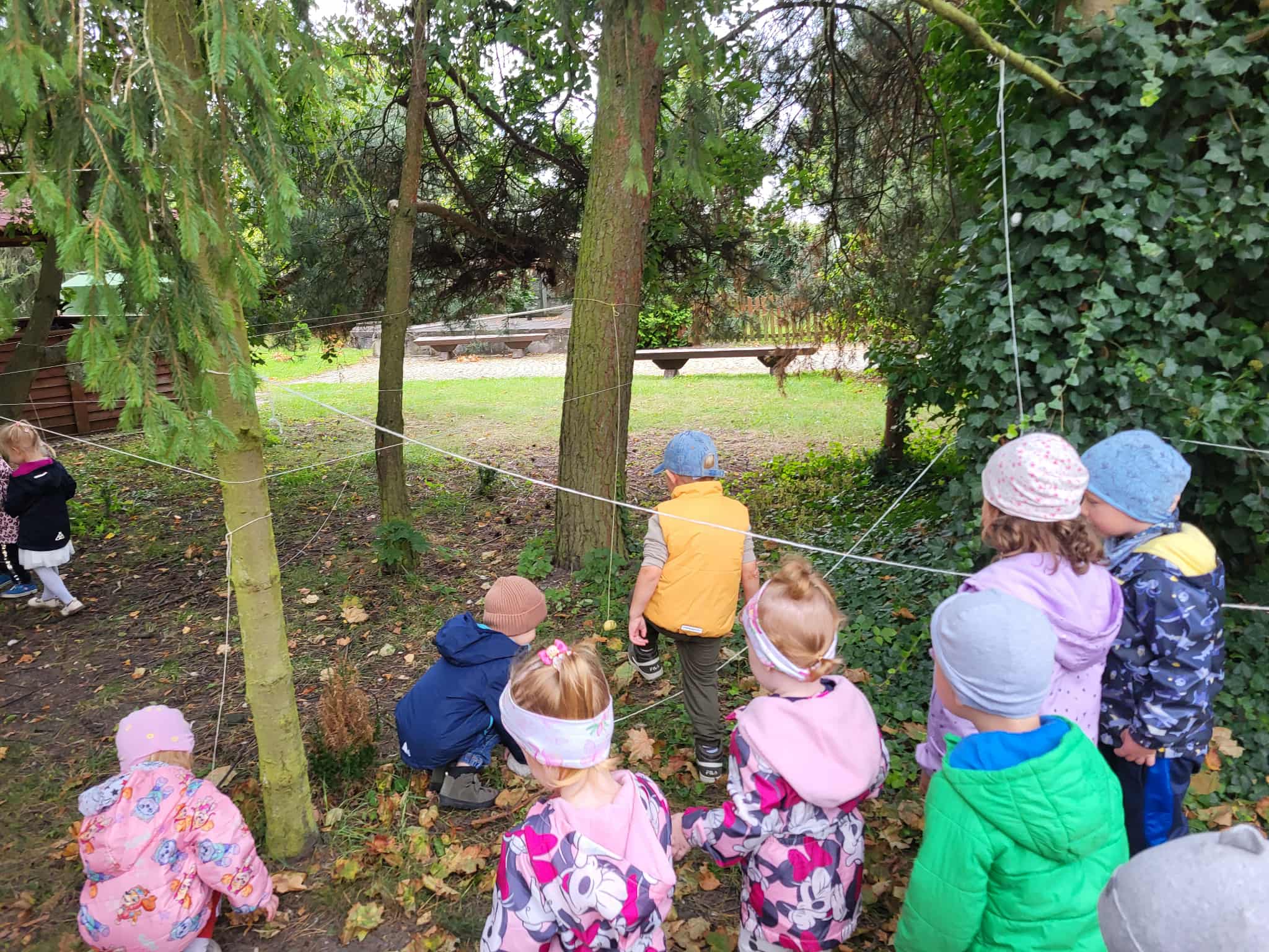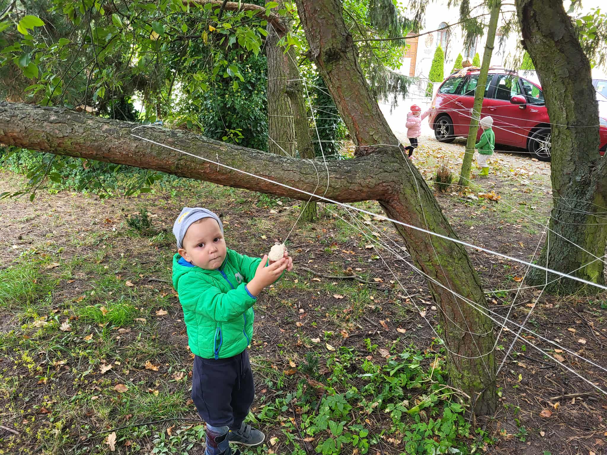 Dzieci młodsze „zamieniły się ” dzisiaj w małe pająki, które tkały sieci w przedszkolnym ogrodzie. Dzięki temu poznaliśmy termin „babie lato”, dzieci ćwiczyły też koordynację wzrokowo- ruchową i ogólną sprawność. Nasz ogród wzbogacił się o nowego mieszkańca- dużego pająka zrobionego przez dzieci. 😉