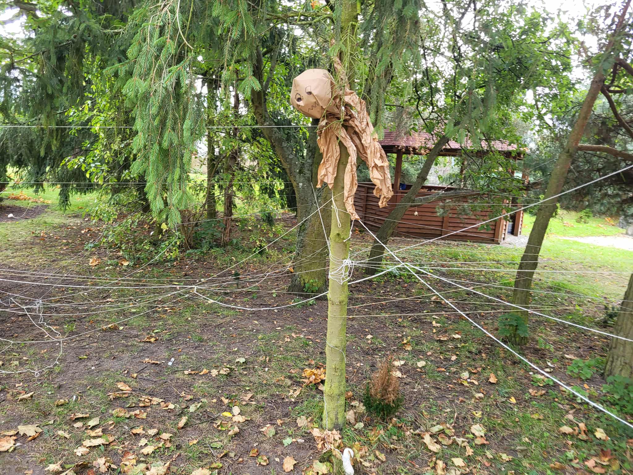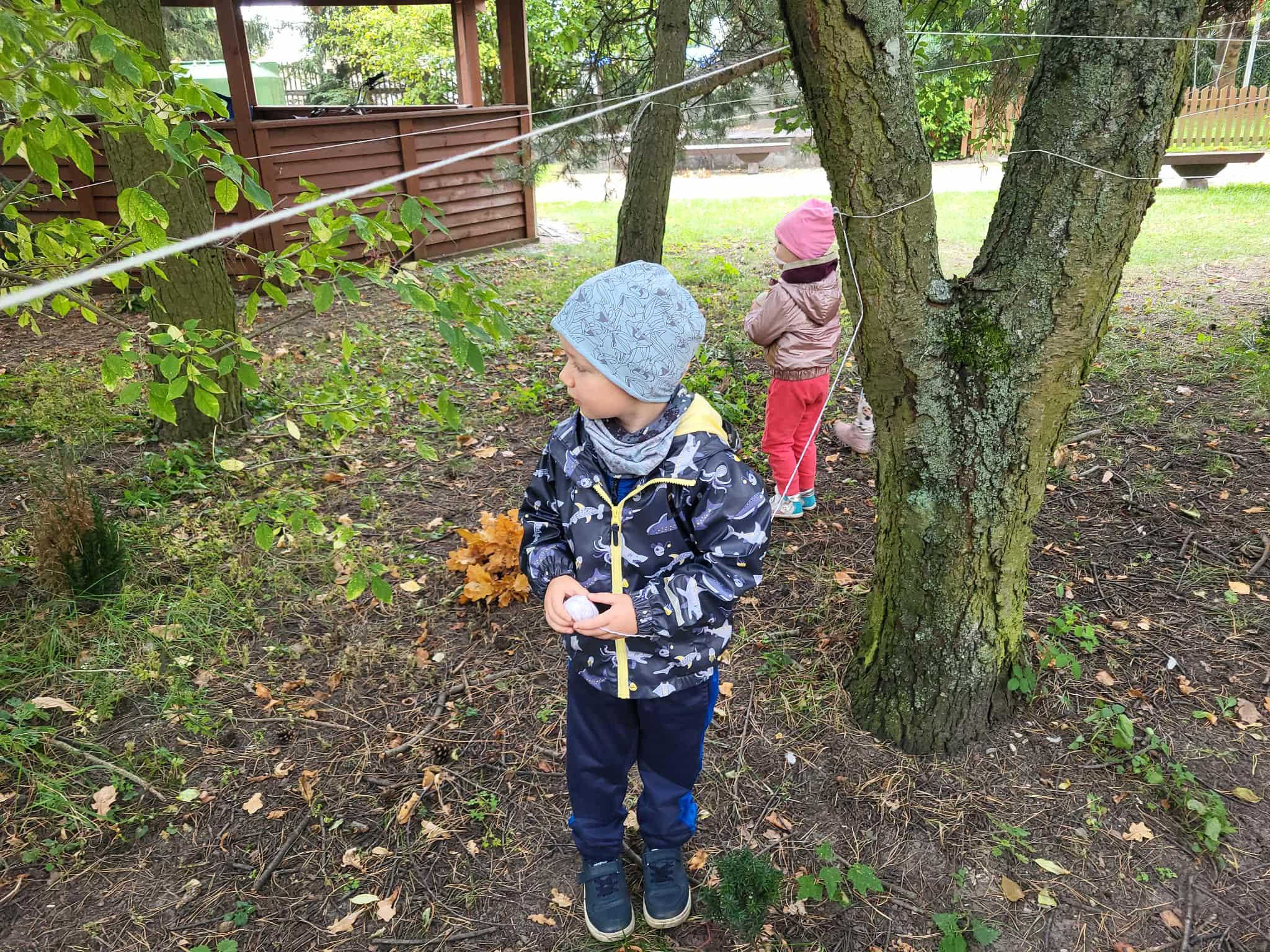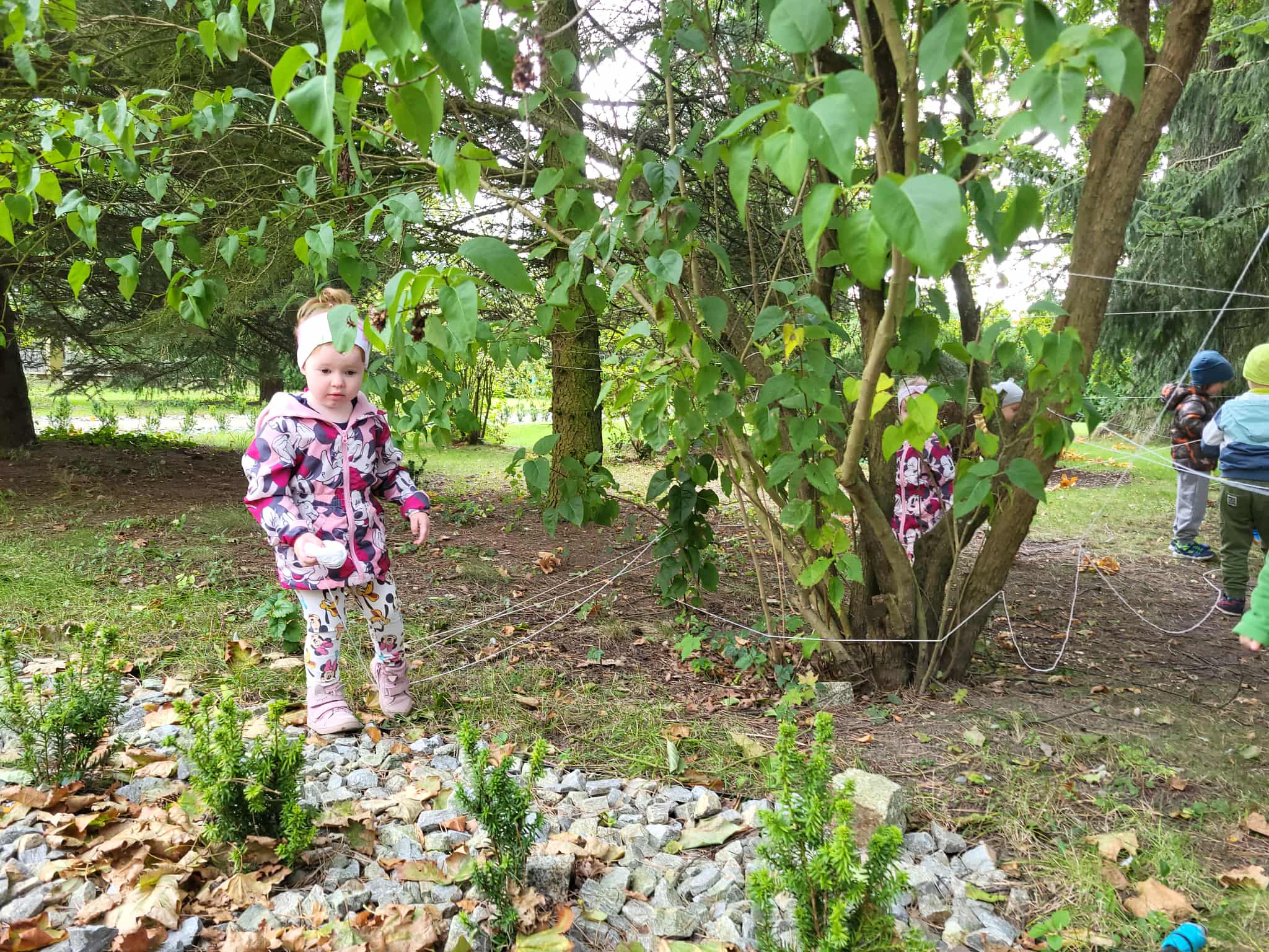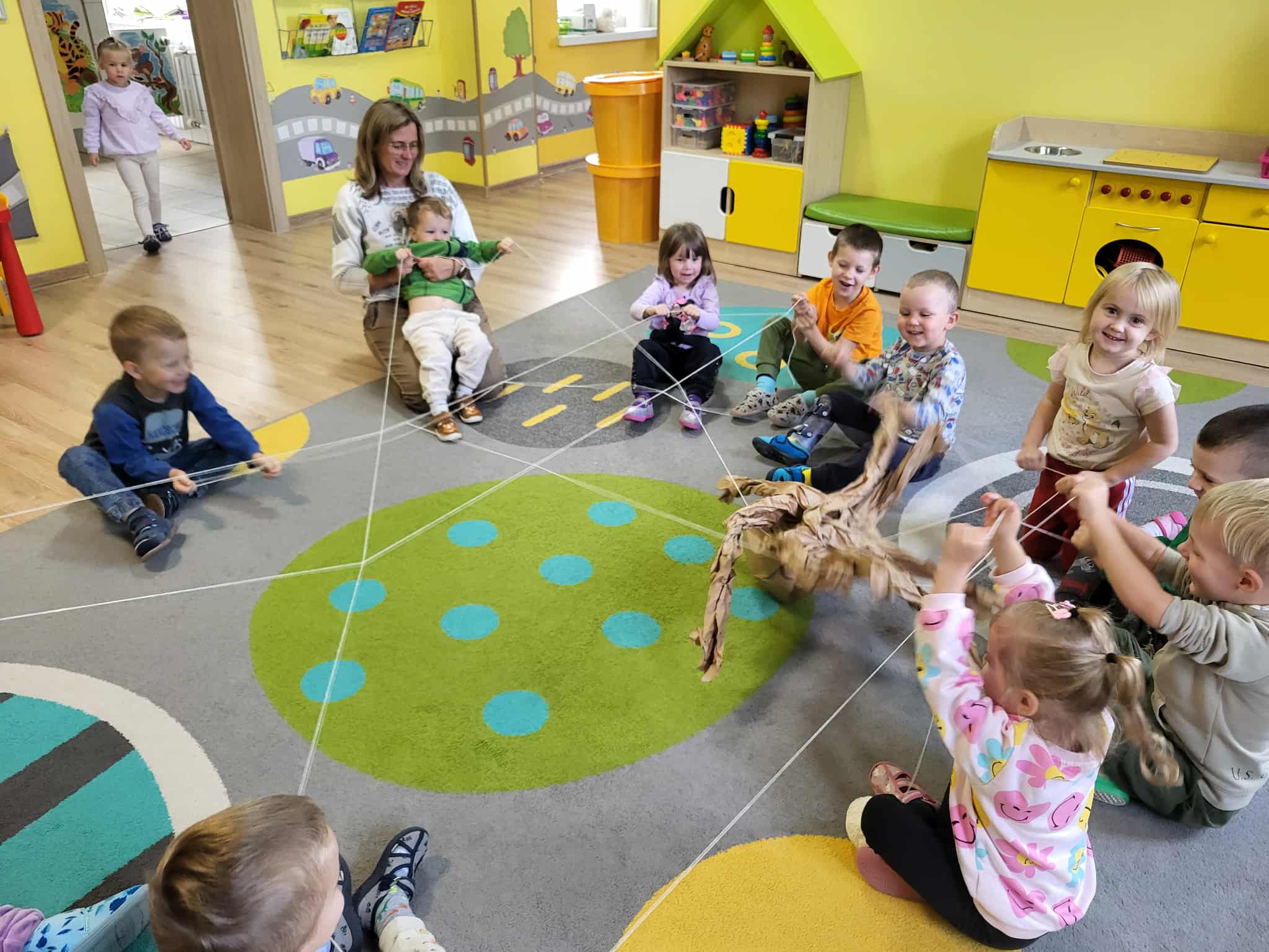 Dzieci młodsze „zamieniły się ” dzisiaj w małe pająki, które tkały sieci w przedszkolnym ogrodzie. Dzięki temu poznaliśmy termin „babie lato”, dzieci ćwiczyły też koordynację wzrokowo- ruchową i ogólną sprawność. Nasz ogród wzbogacił się o nowego mieszkańca- dużego pająka zrobionego przez dzieci. 😉