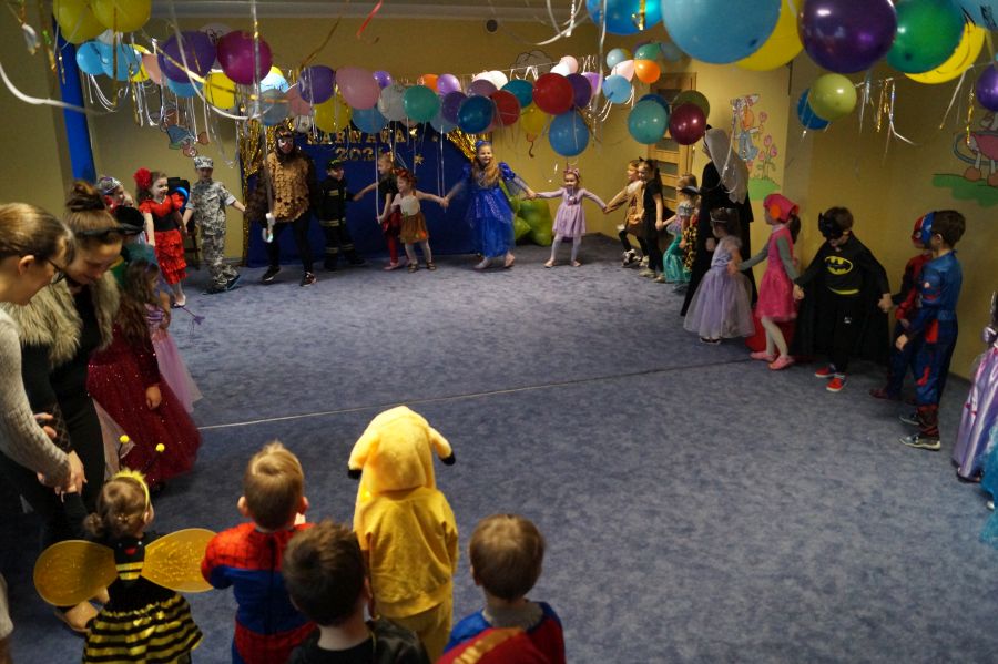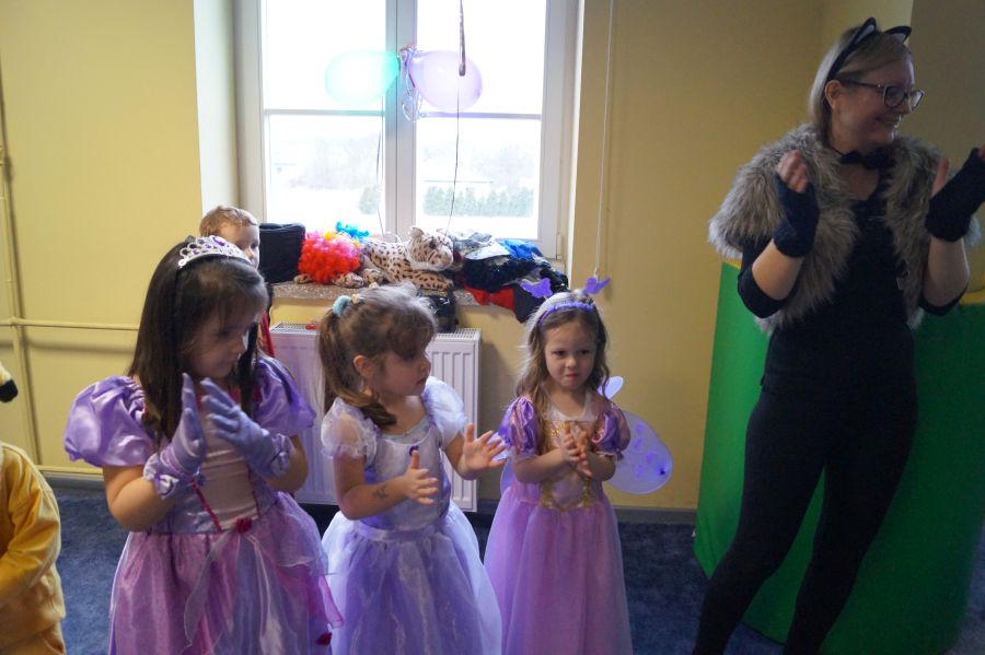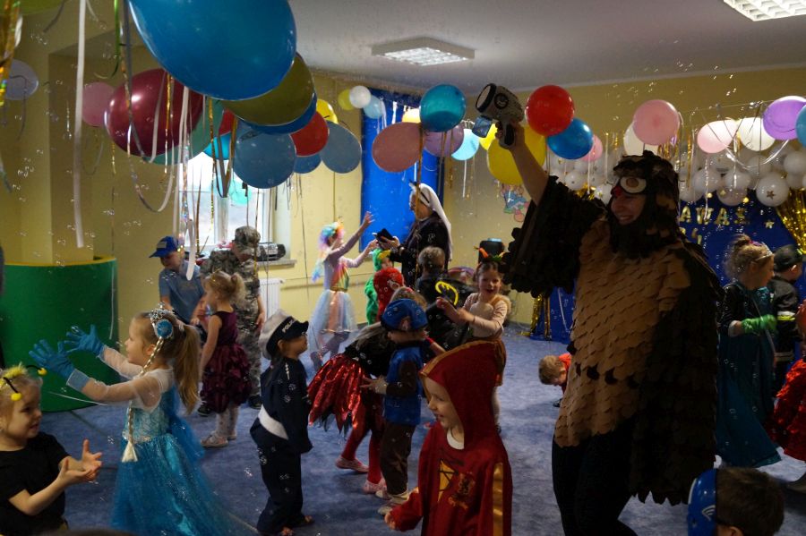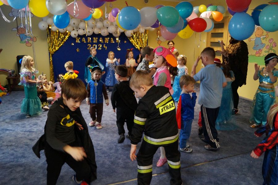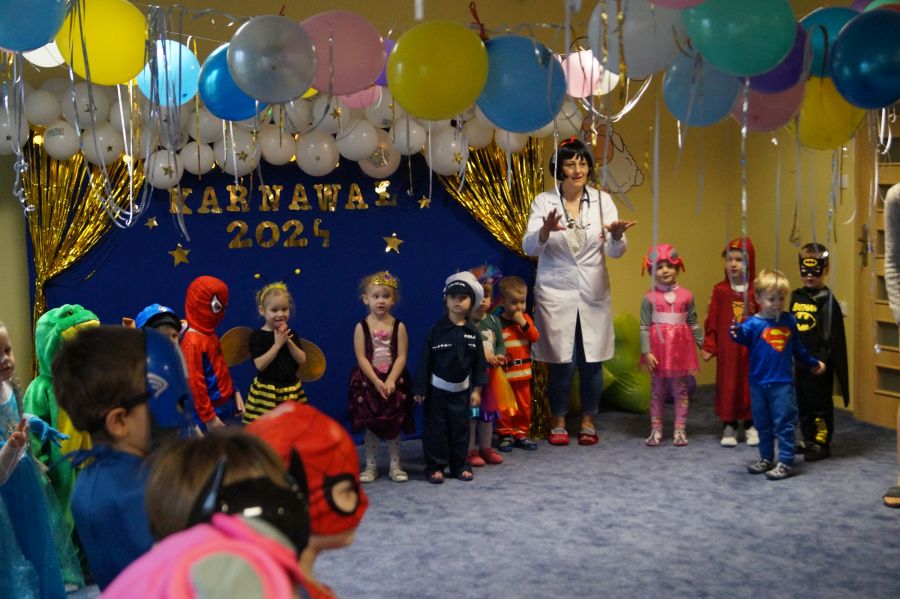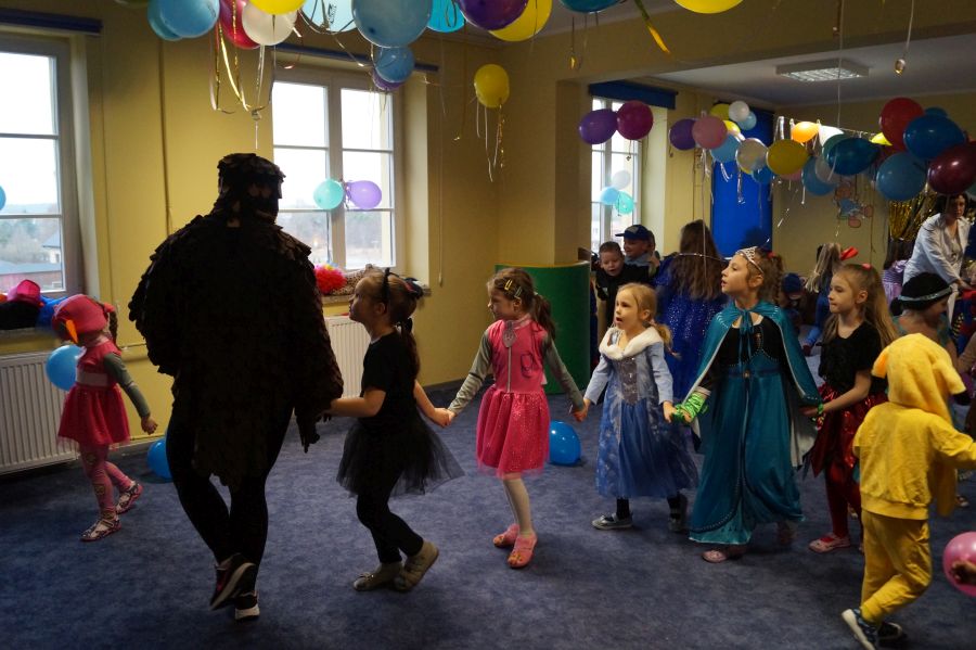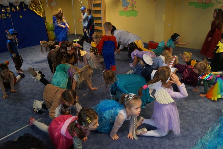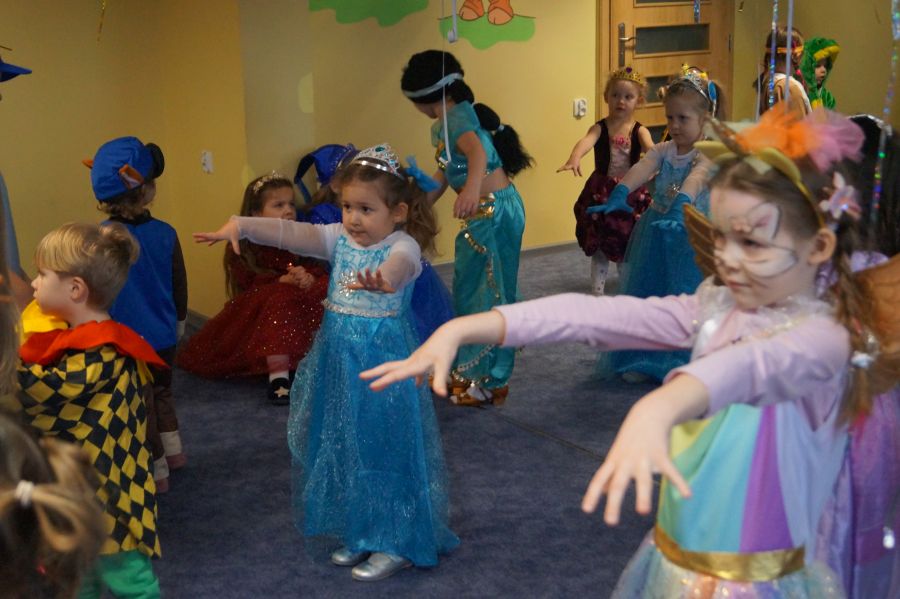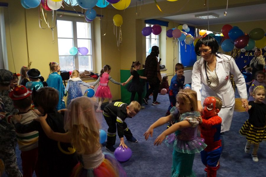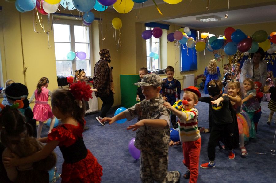 Wszystkie dzieci czekały na zabawę karnawałową, obmyślając kostiumy wraz z rodzicami. Tradycyjnie przybyło wielu super bohaterów, księżniczki, zwierzątka oraz inne bajkowe postacie. Bawiliśmy się świetnie, a to dzięki pani Martynie ze „Szkoły Tańca Vamos”, która poprowadziła całą imprezę.