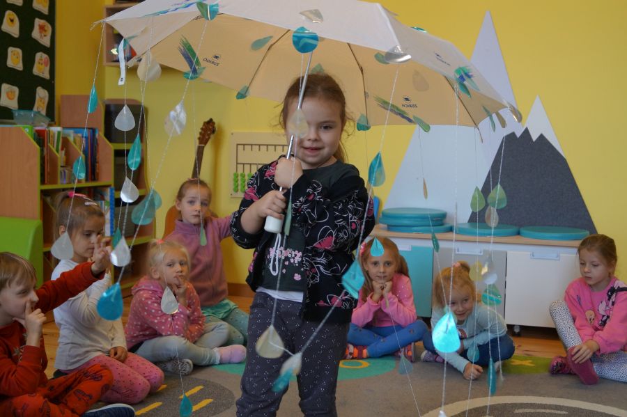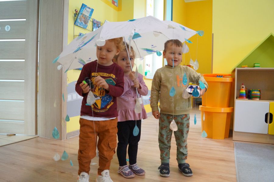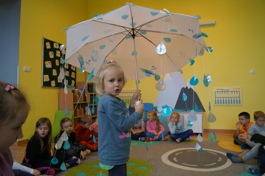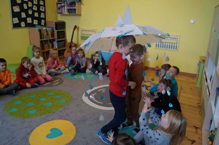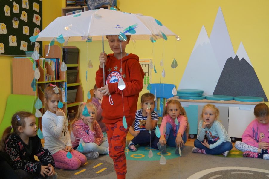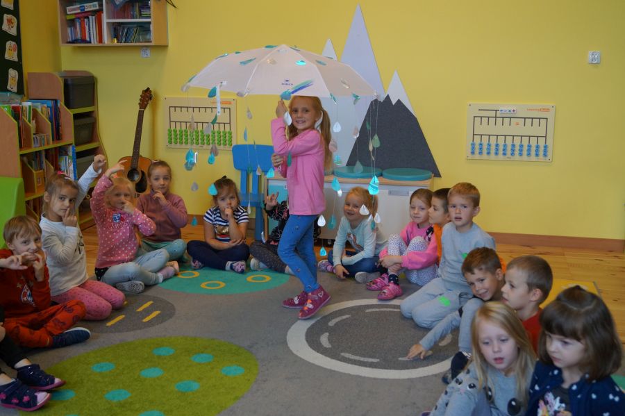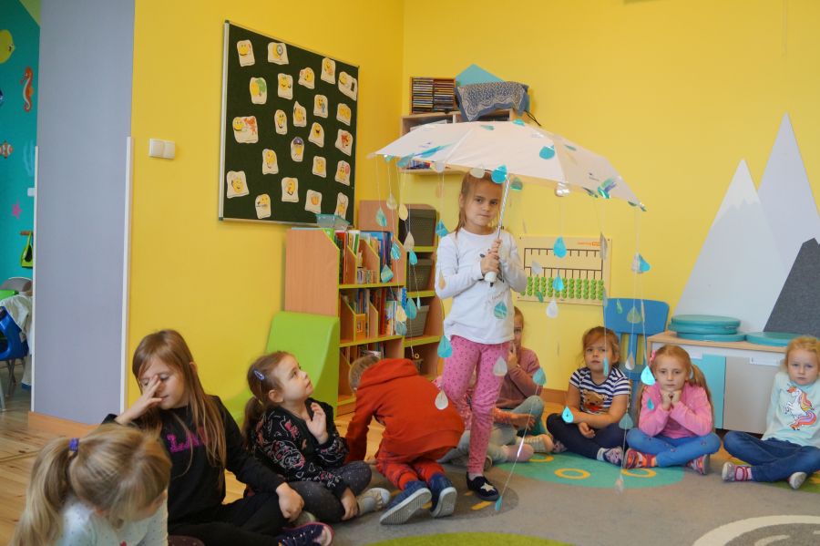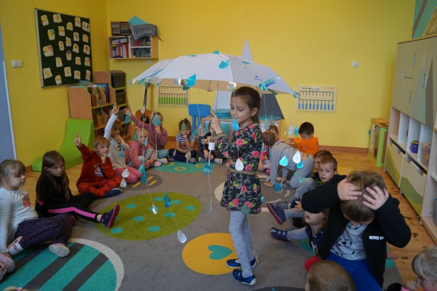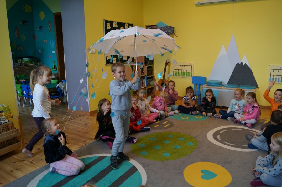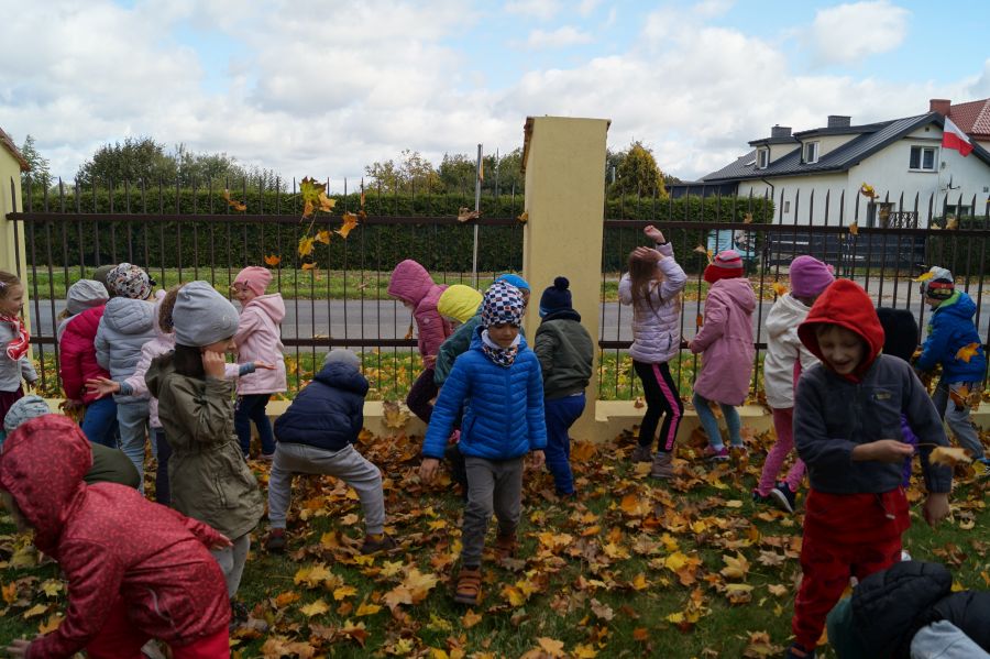 Polska jesień bywa kapryśna, czasem bardzo mokra, innym razem mieniąca się kolorami, bogata w różne dary przyrody. Obie grupy dzieci mogły doświadczyć różnych jej oblicz podczas zabaw oraz spaceru.