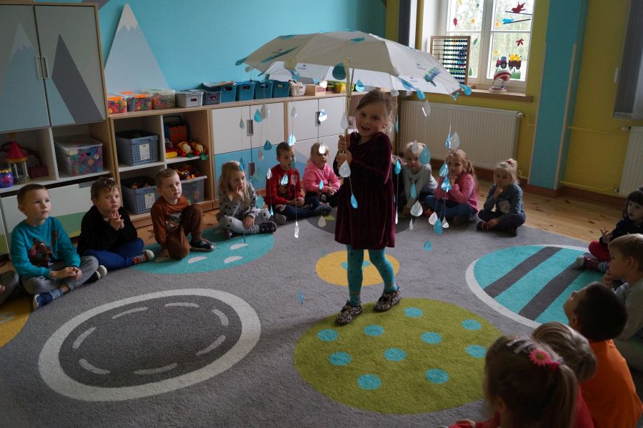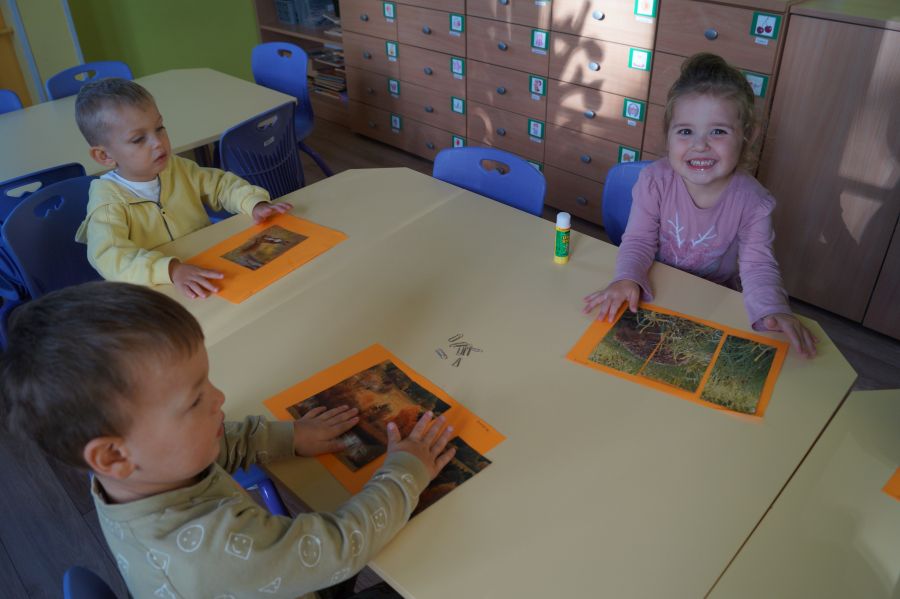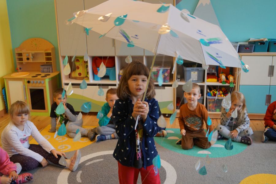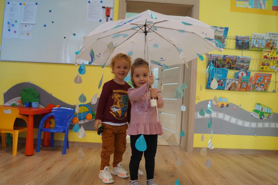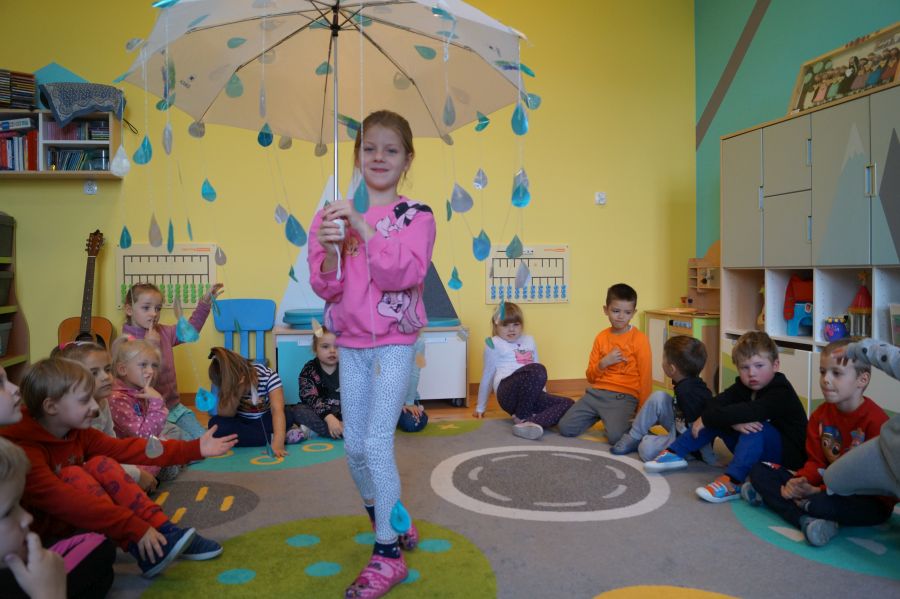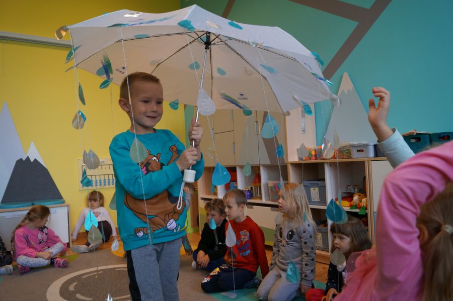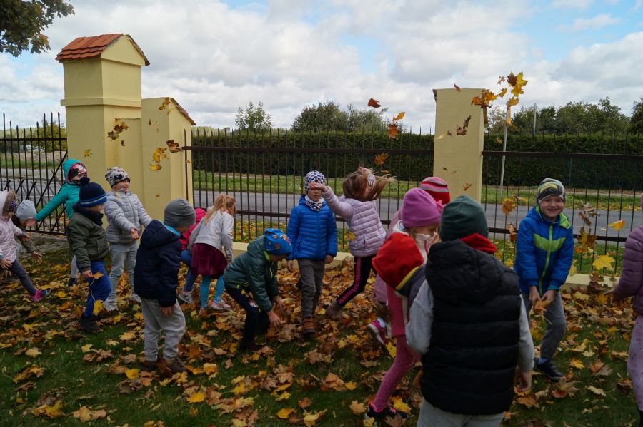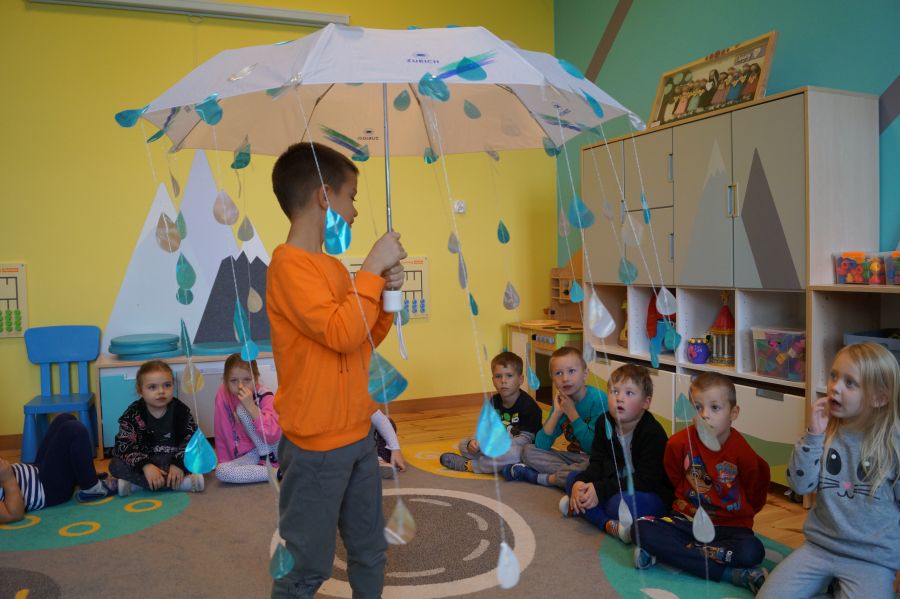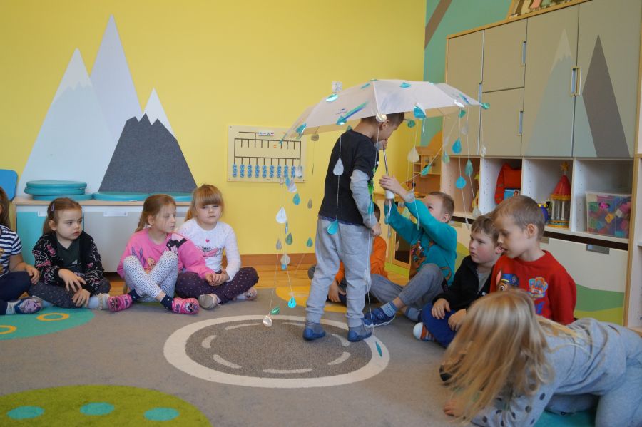 Polska jesień bywa kapryśna, czasem bardzo mokra, innym razem mieniąca się kolorami, bogata w różne dary przyrody. Obie grupy dzieci mogły doświadczyć różnych jej oblicz podczas zabaw oraz spaceru.