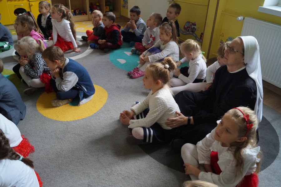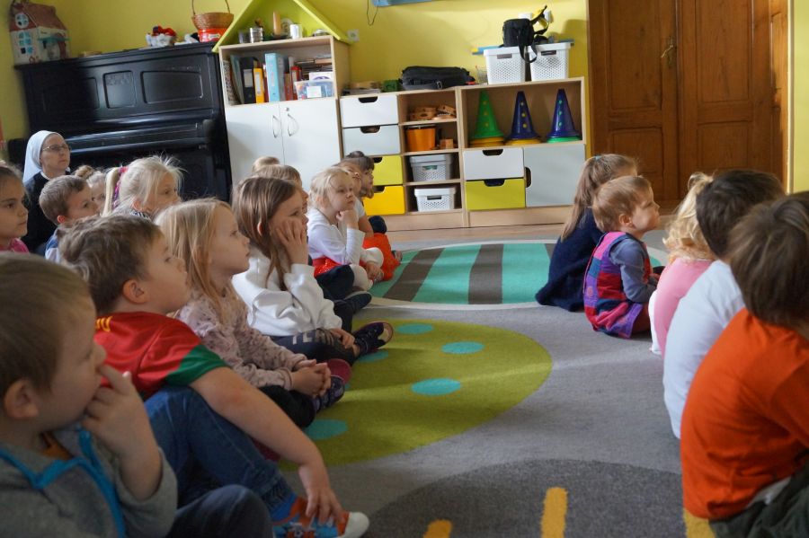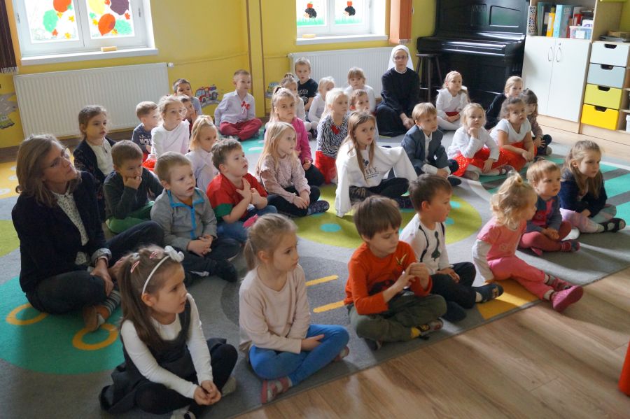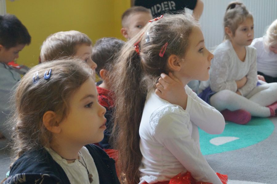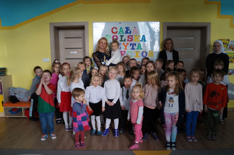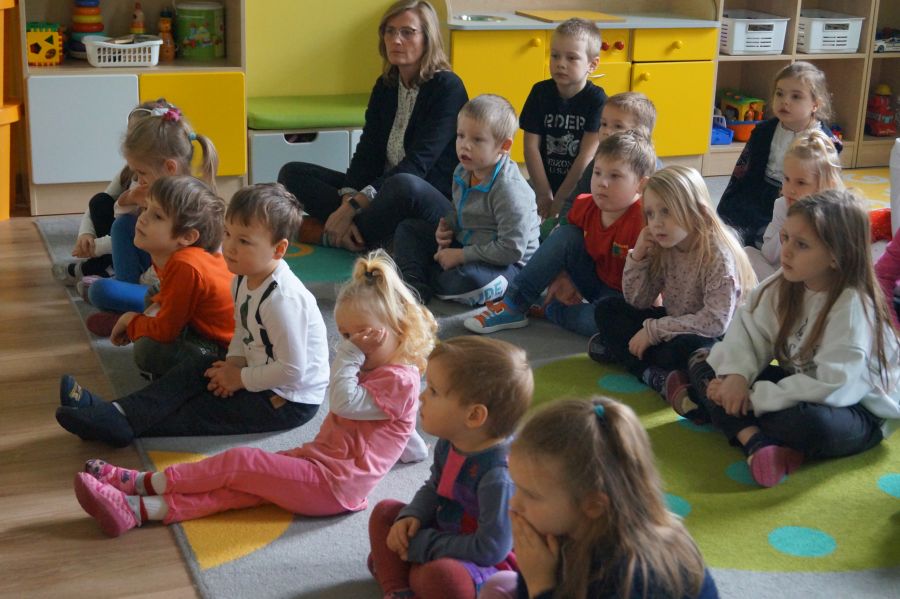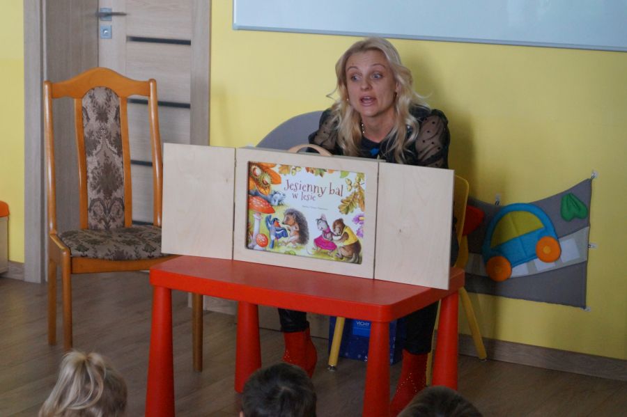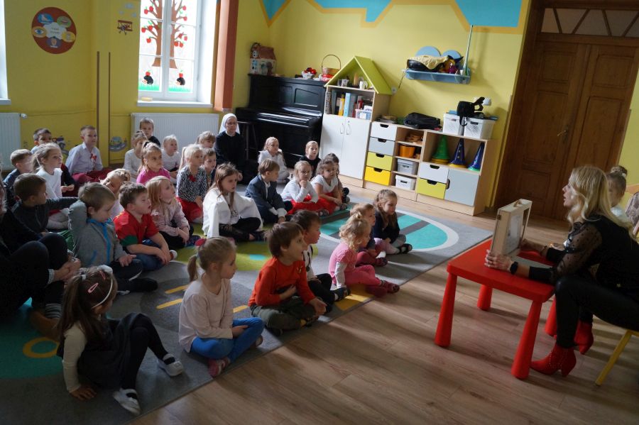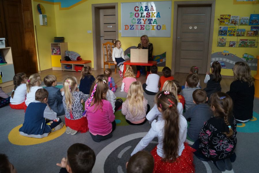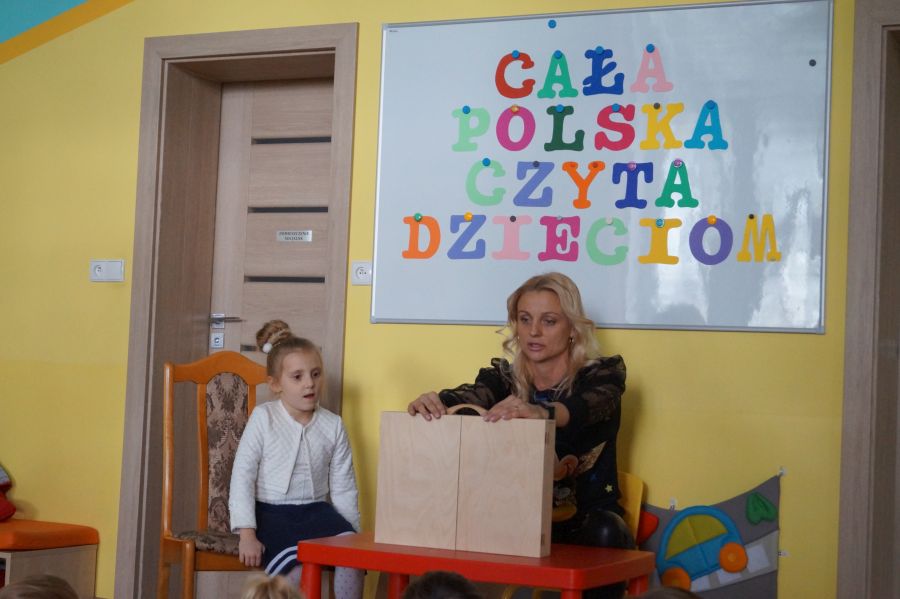 Podczas akcji „Cała Polska czyta dzieciom” gościliśmy mamę Orianki, panią Aleksandrę, która zrobiła dzieciom niespodziankę. Mogliśmy usłyszeć/ zobaczyć Kamishibai czyli wywodzącą się z Japonii technikę czytania i prezentacji książki obrazkowej – teatr obrazkowy lub inaczej teatr ilustracji. Jest to technika opowiadania, czytania, wykorzystując plansze z obrazkami i tekstem oraz drewnianą skrzynkę (butai), – drewniany teatrzyk – w której przedstawiane są kolejne fragmenty bajki, opowiadania.