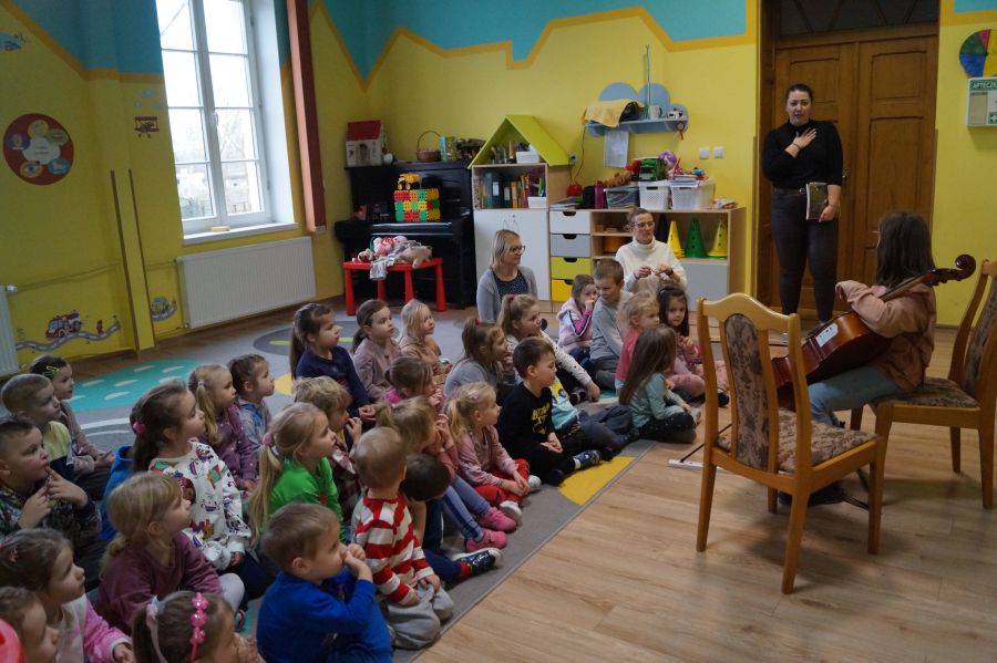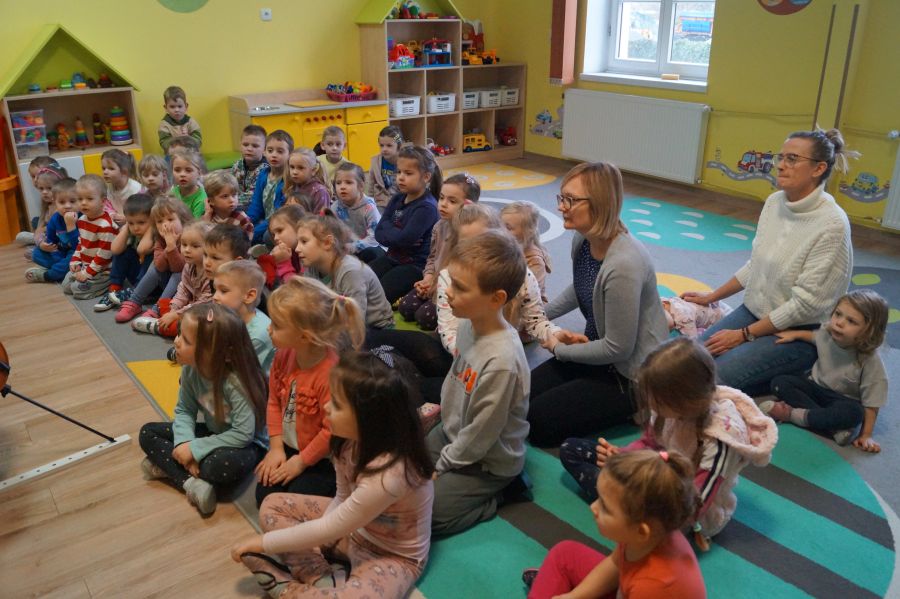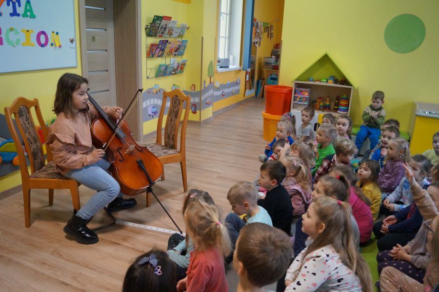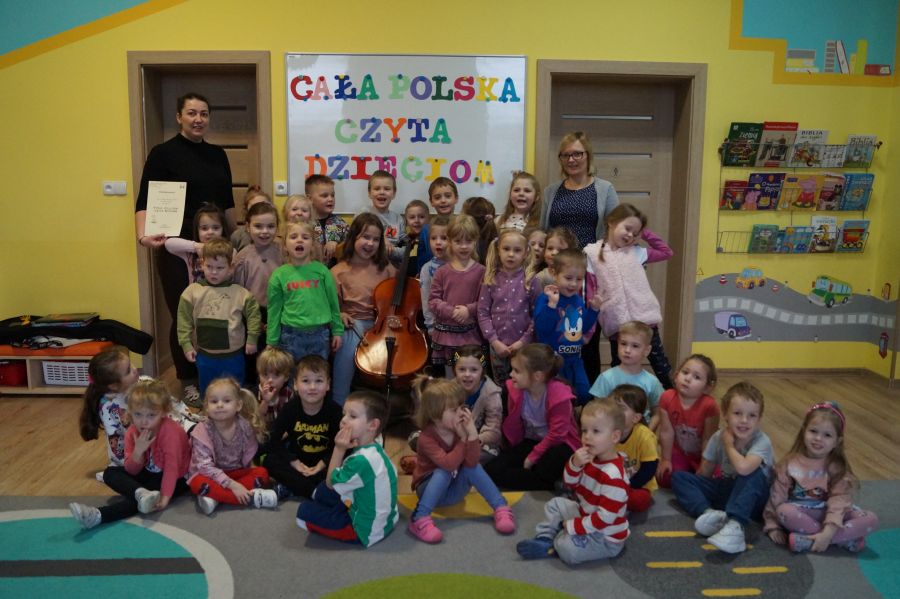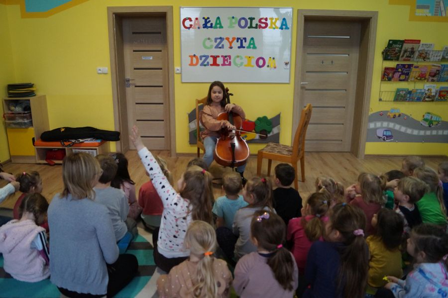 W tym miesiącu goście akcji „Cała Polska czyta dzieciom.” sprawili nam niespodziankę i połączyli czytanie bajki z edukacją muzyczną. Dziękujemy pani Ewelinie i Zosi za miłe i pouczające spotkanie, podczas którego dowiedzieliśmy się wielu ciekawostek o wiolonczeli.