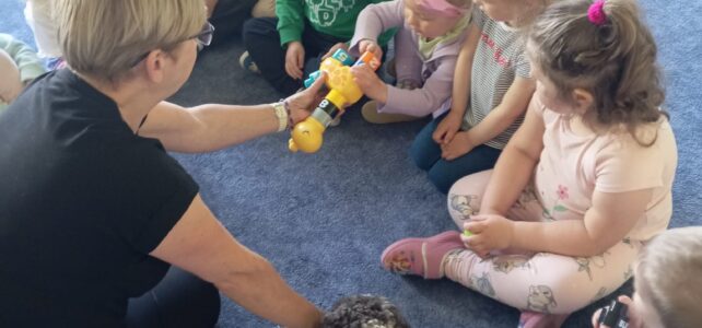 Niektóre dzieci młodsze miały okazje po raz pierwszy zapoznać się z instrumentarium różnych krajów/ kontynentów. Poznaliśmy min. instrumenty takie jak: kalimba, jemba, darabuka, kij deszczowy…. Dzieci chętnie brały udział w proponowanych zabawach.