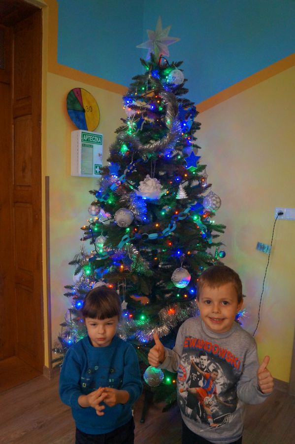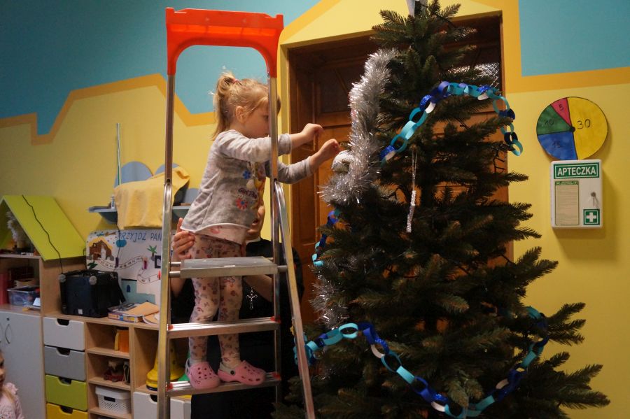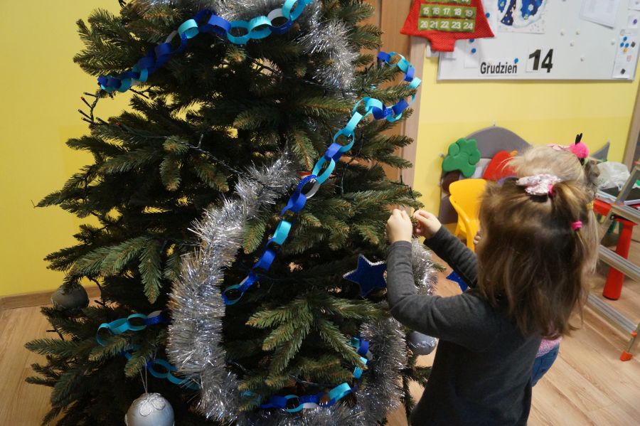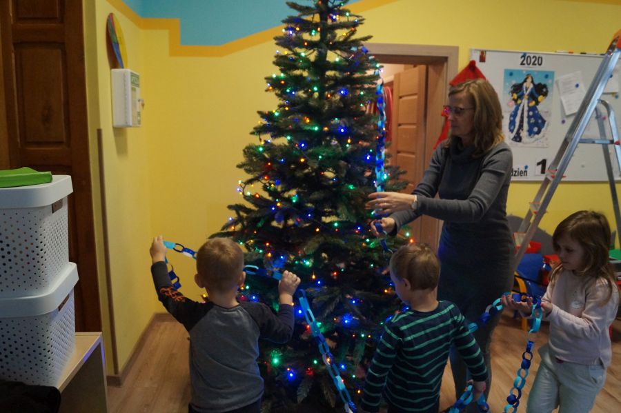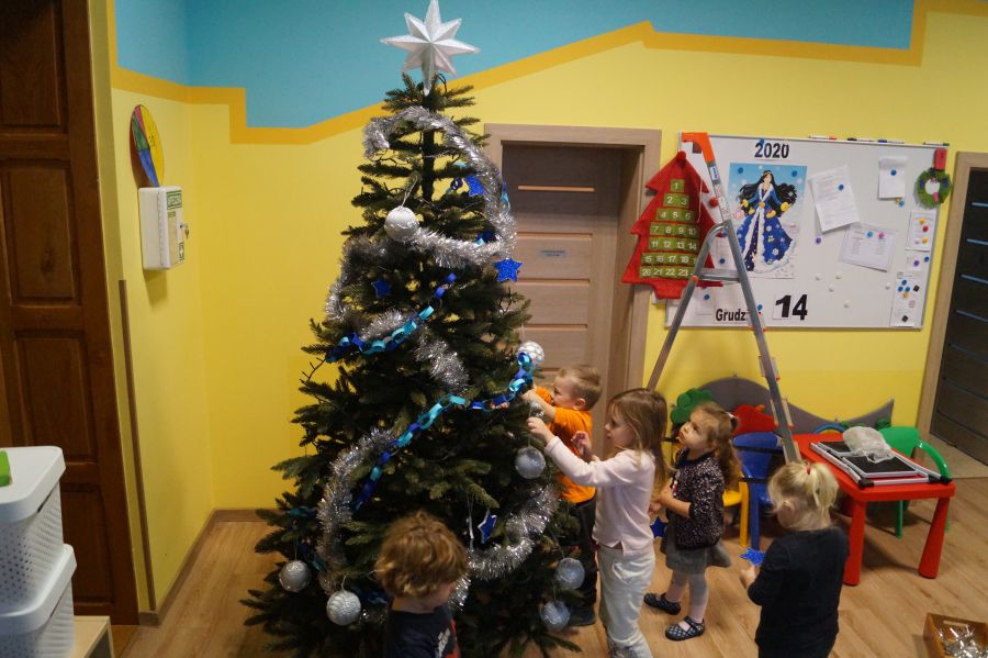 Dzieci od samego rana były bardzo podekscytowane ponieważ w salach pojawiły się choinki. Dużo radości sprawiło nam ich ubieranie, zwłaszcza maluchom, które mogły wspiąć się na drabinę.