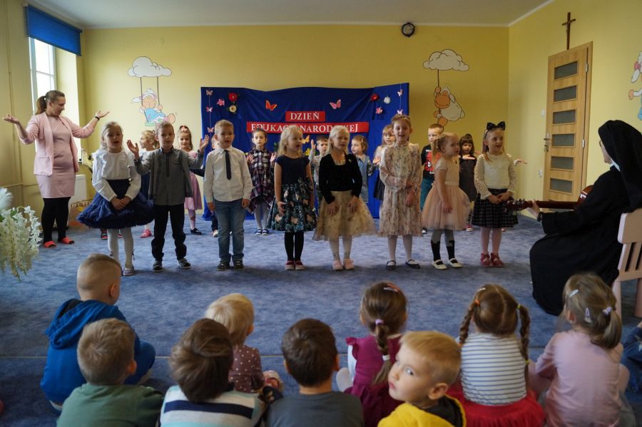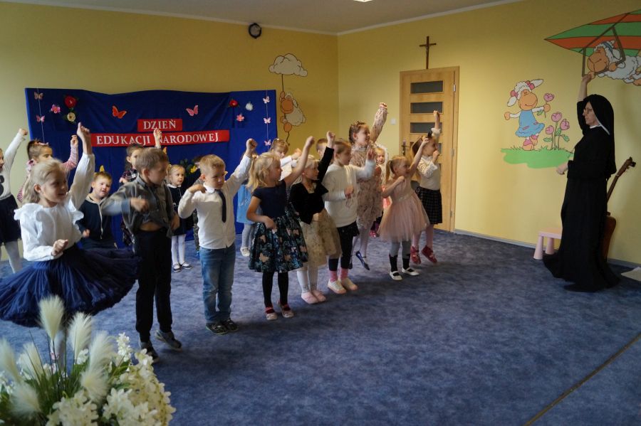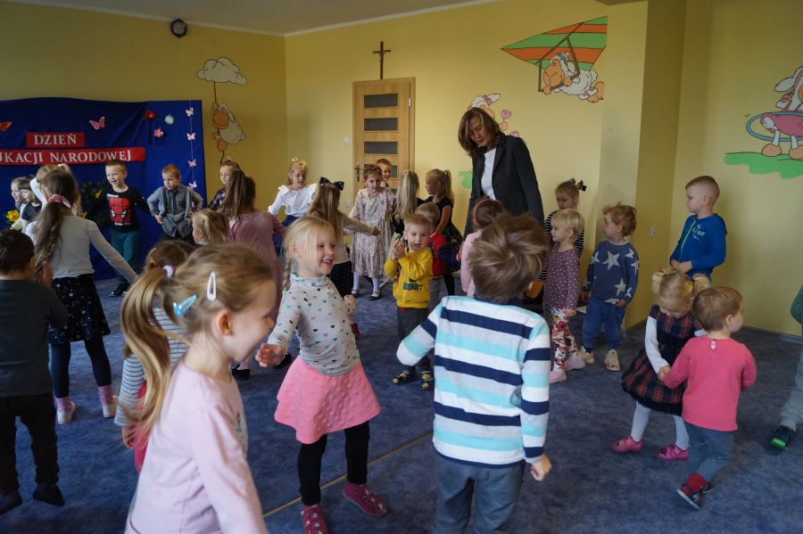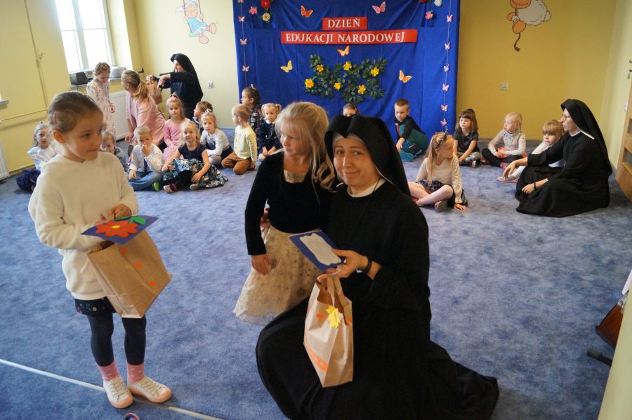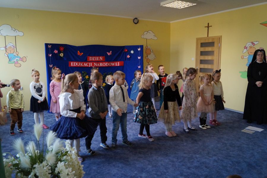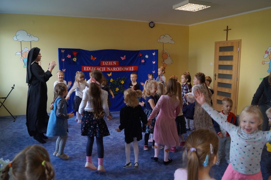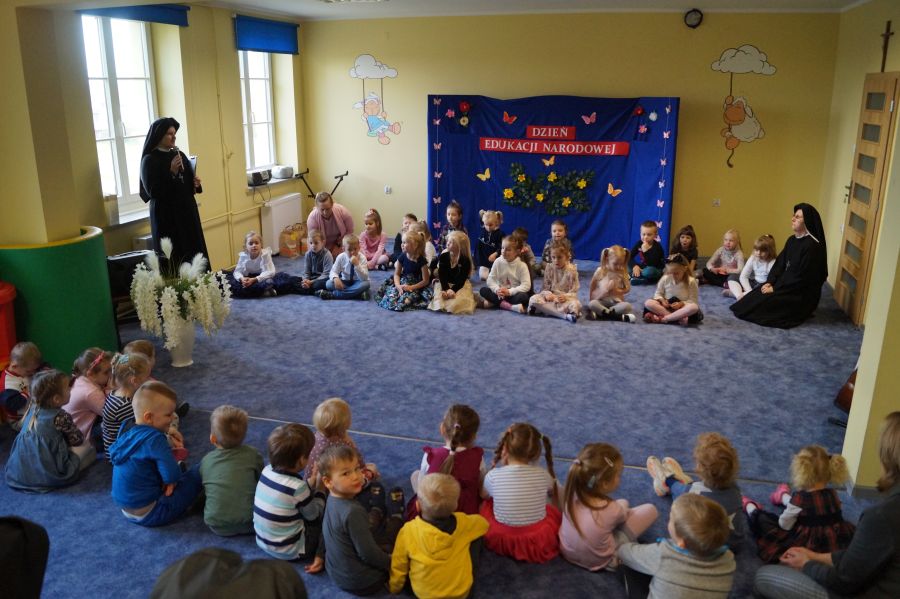 Tradycyjnie cała nasza przedszkolna społeczność spotkała się, aby uczcić Dzień Edukacji Narodowej. Grupa starsza przygotowała pod kierunkiem s. Katarzyny i pani Michaliny montaż słowno- muzyczny. W ten sposób dzieci wyraziły swoją wdzięczność wszystkim pracownikom przedszkola. S. Dyrektor dołączyła się do życzeń dzieci, dziękując pracownikom za codzienną troskę i zaangażowanie wkładane w wychowanie, i nauczanie przedszkolaków.