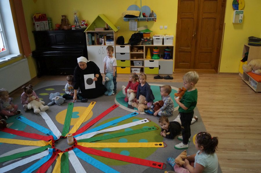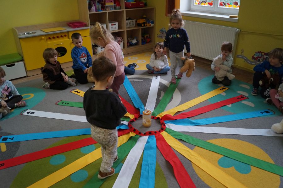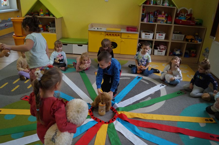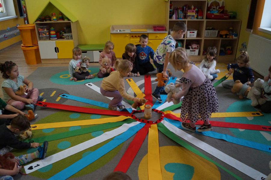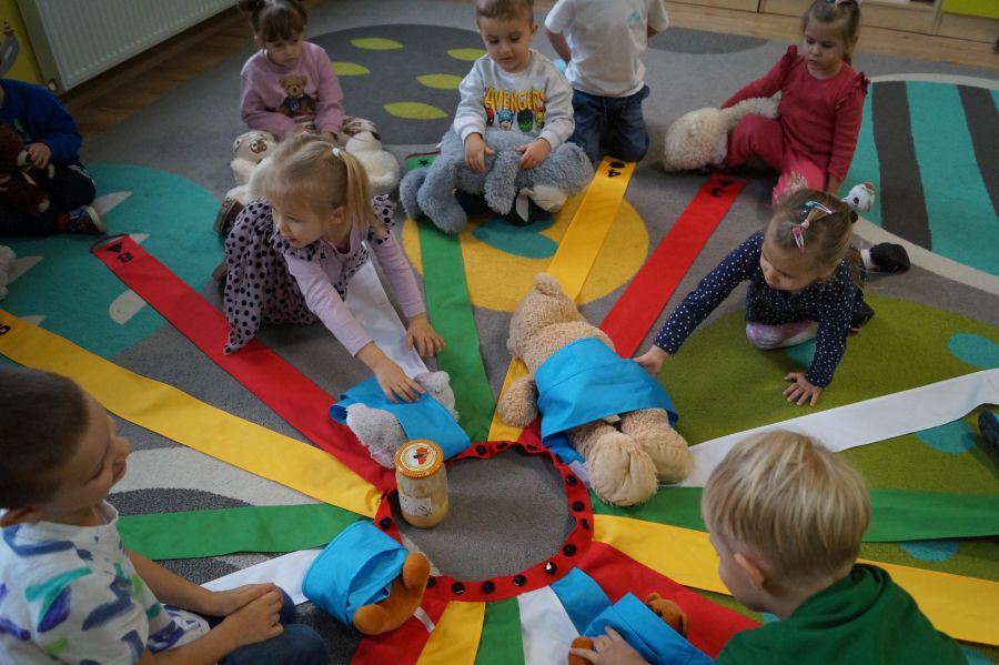 Dzieci młodsze przywitały swoje misie nowa piosenką, wspólnie zastanawiały się czym by tu misie nakarmić- zgodnie stwierdziły, że świeże owoce będą najlepsze ;). Następnie wspólnie z misiami dzieci wykonywały zadania z wykorzystaniem „Wiatraka Matematycznego”- ćwicząc między innymi orientacje w przestrzeni, rozróżnianie kolorów i figur..