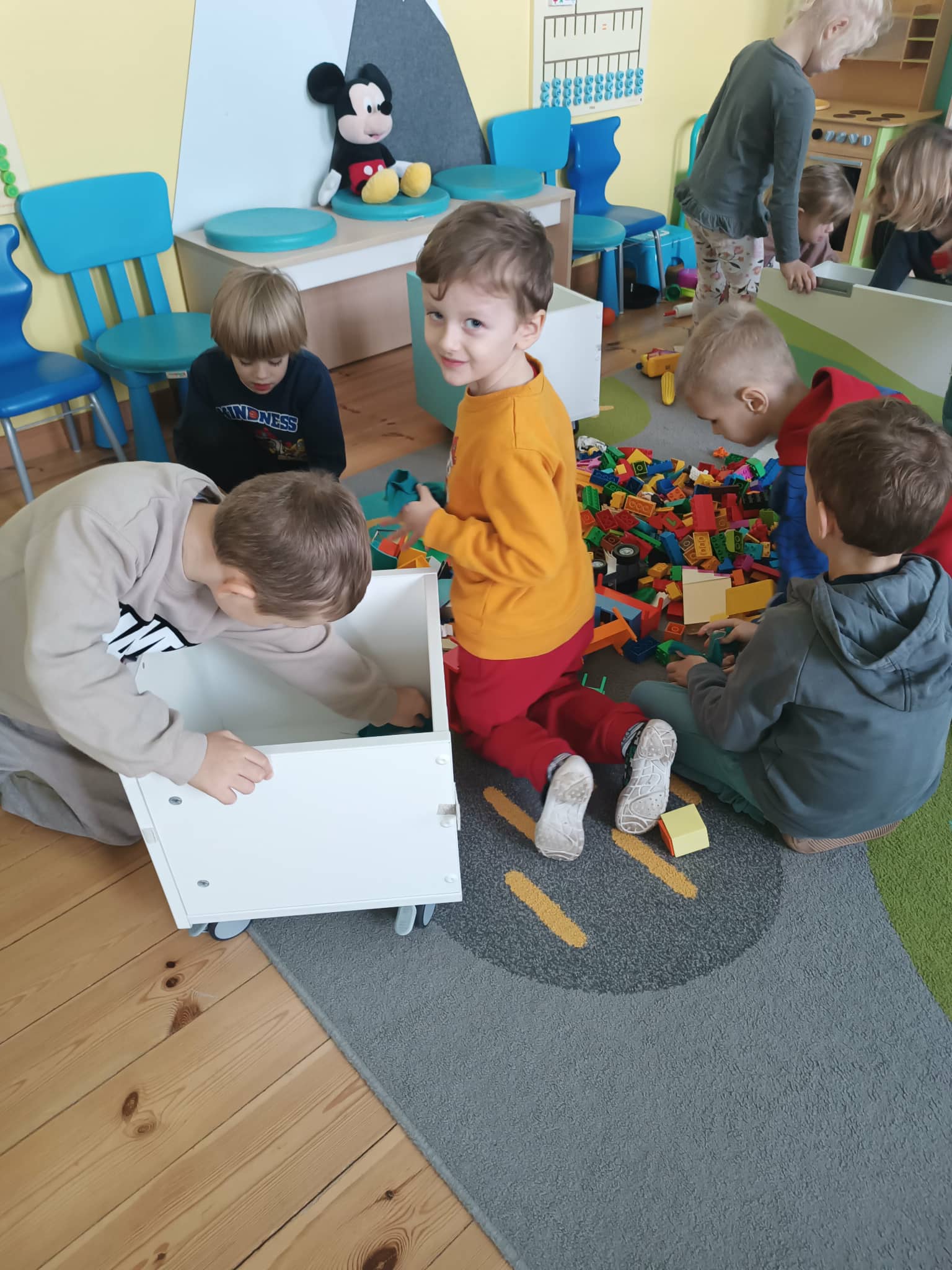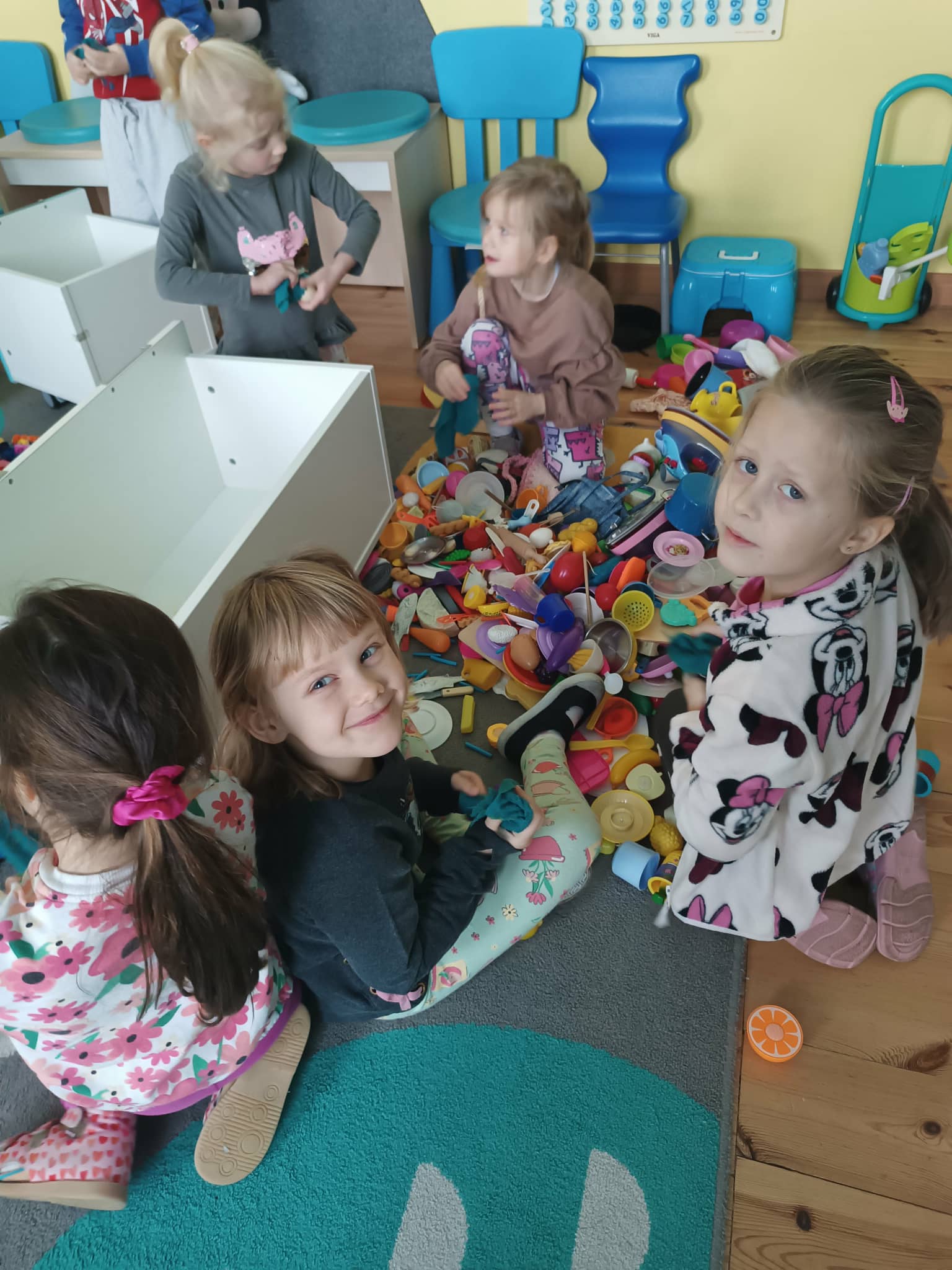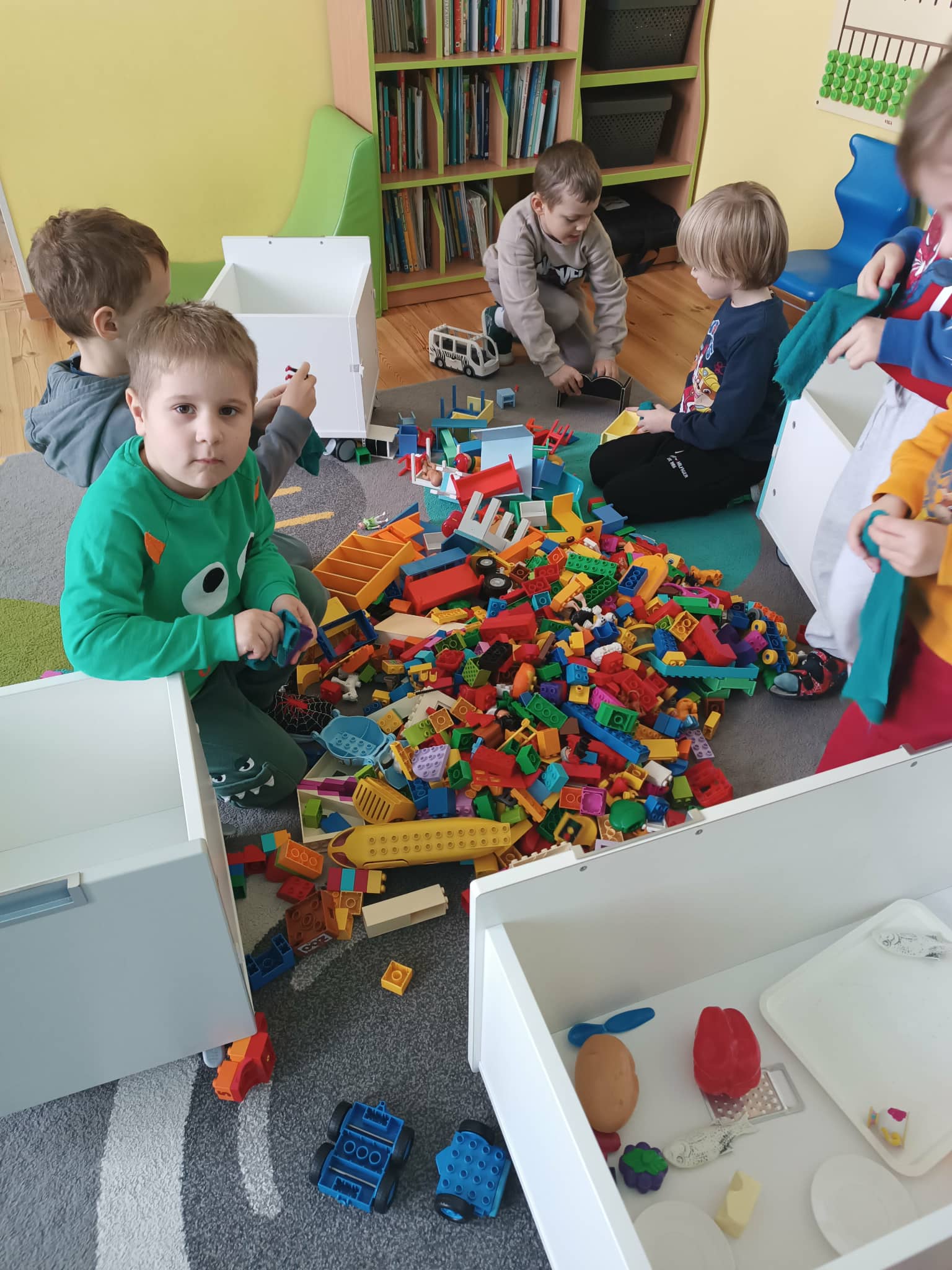 Grupa starszaków w swoim „dniu pracusia” oprócz czynności higieniczno- porządkowych, ćwiczy także klasyfikowanie, segregowanie oraz wiele innych społecznych i komunikacyjnych umiejętności.