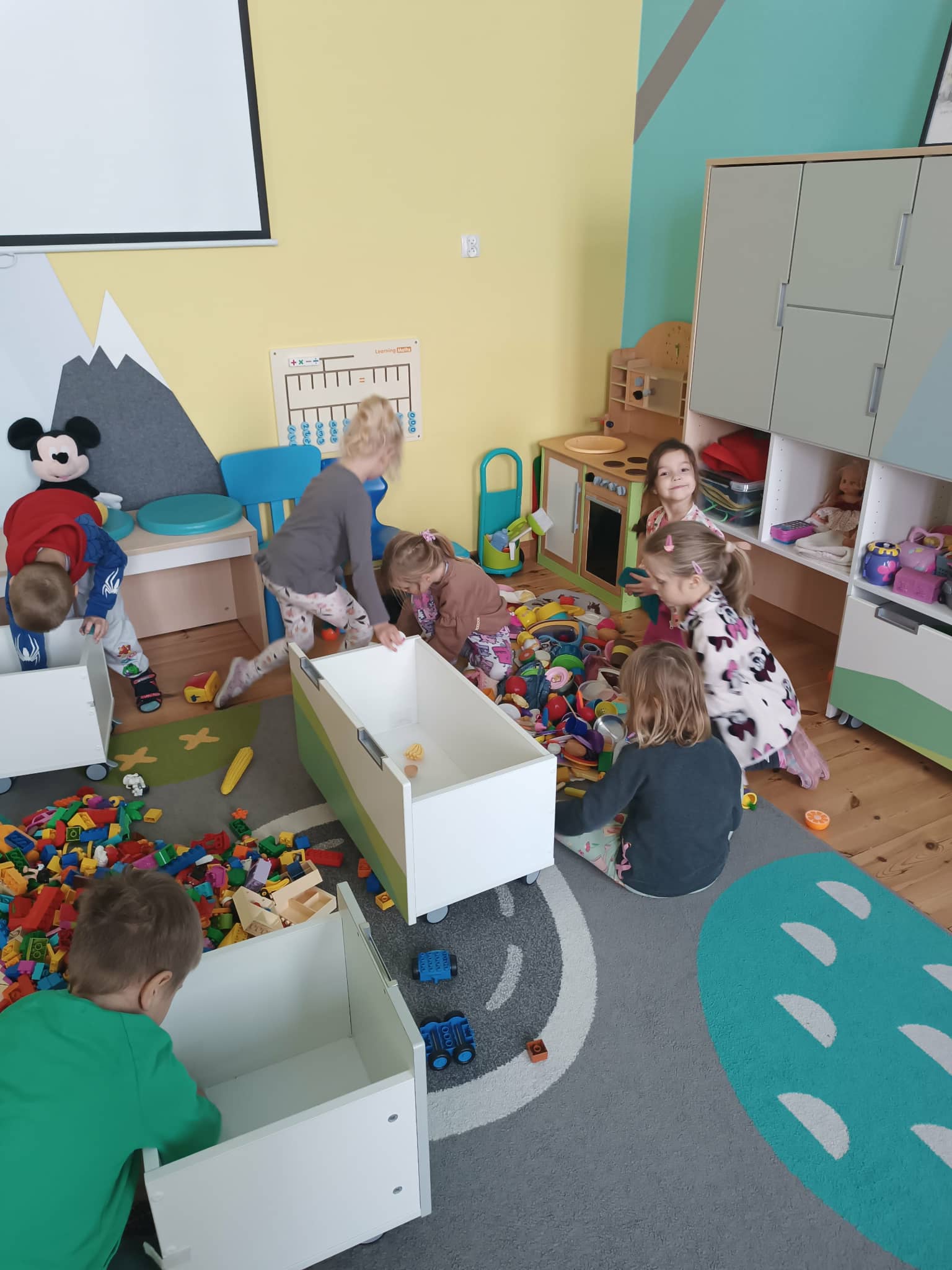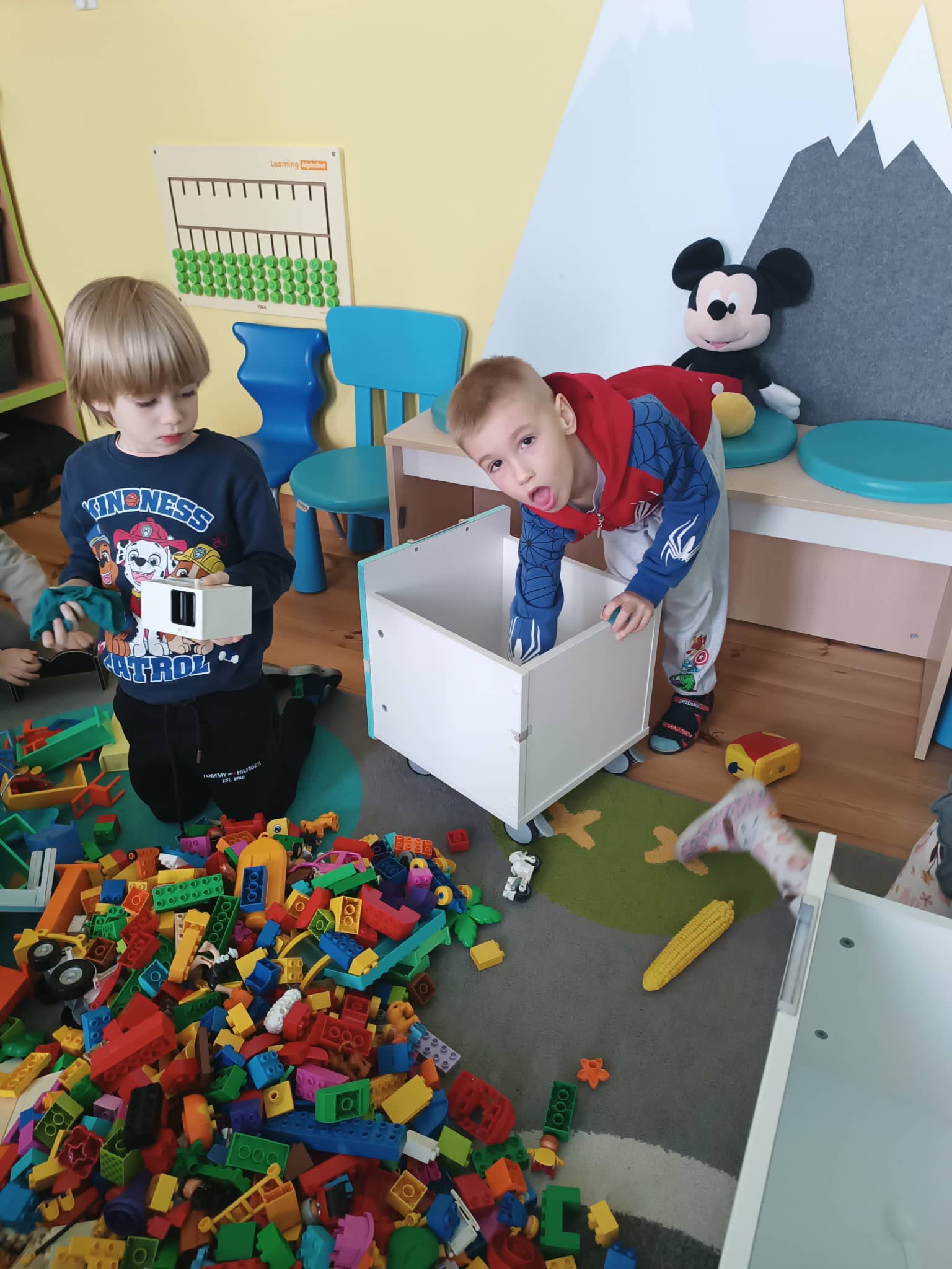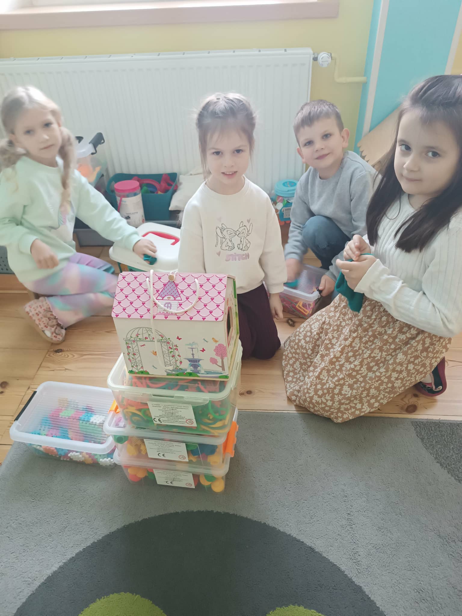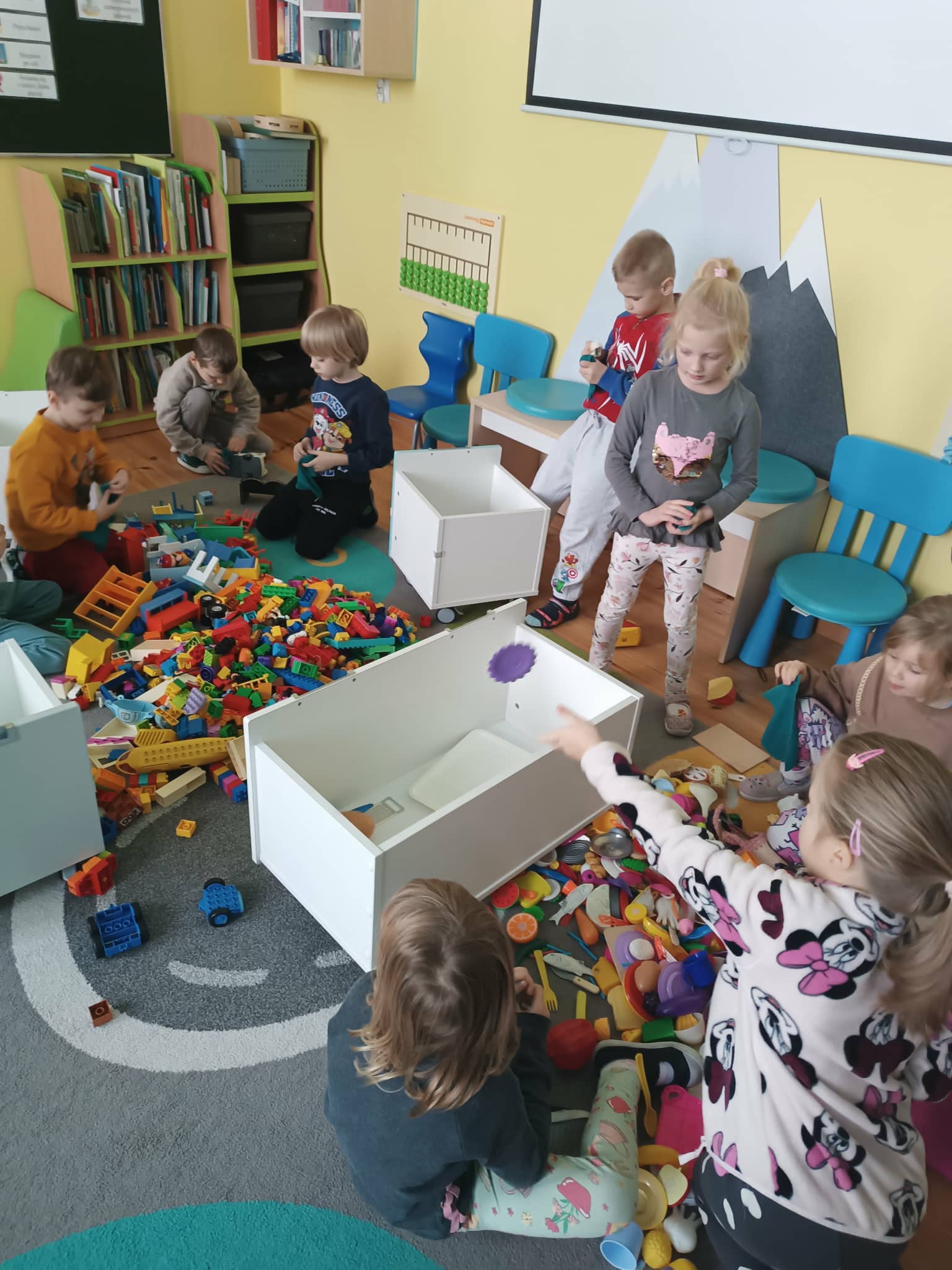 Grupa starszaków w swoim „dniu pracusia” oprócz czynności higieniczno- porządkowych, ćwiczy także klasyfikowanie, segregowanie oraz wiele innych społecznych i komunikacyjnych umiejętności.
