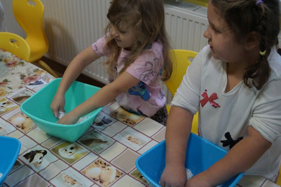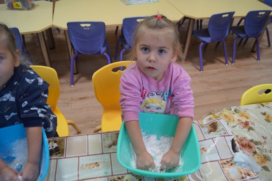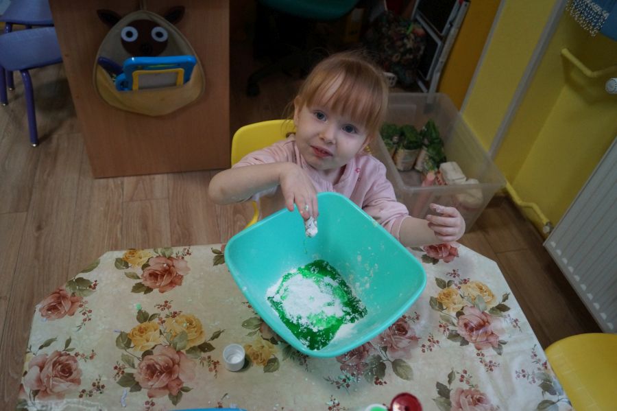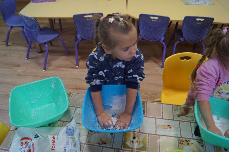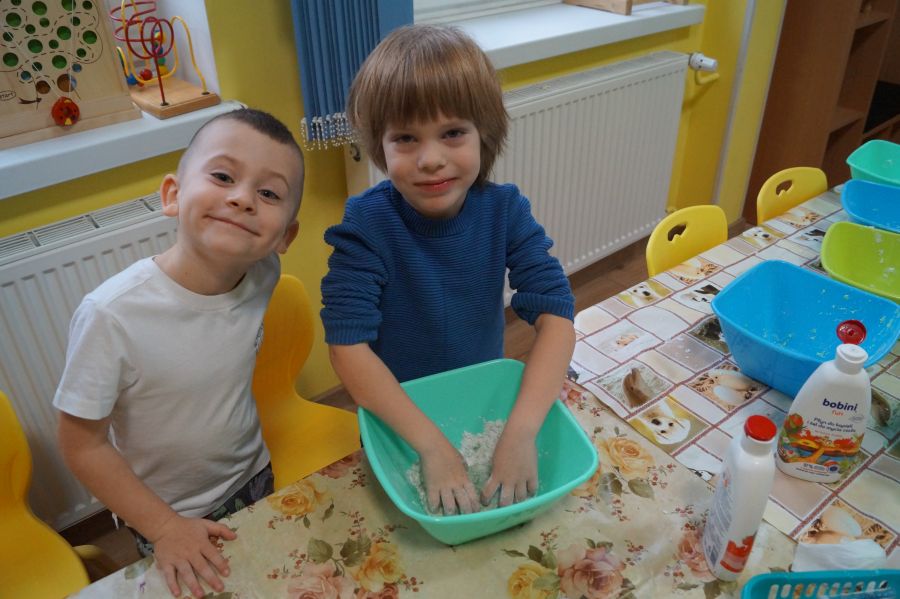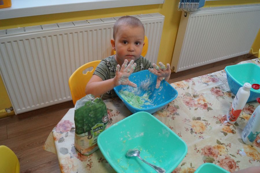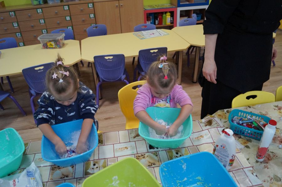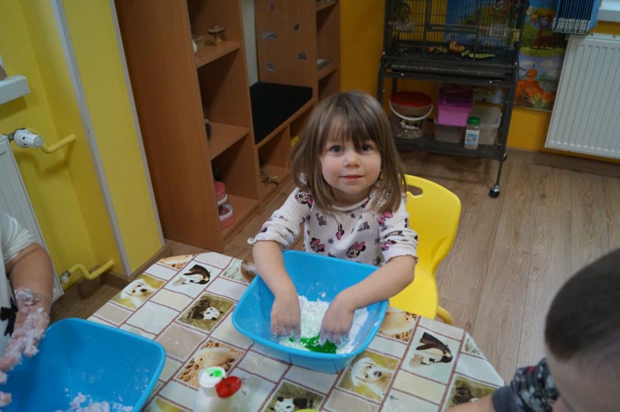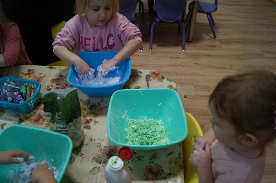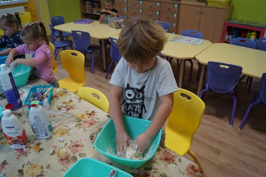 W ramach programu własnego „Dzień zabaw kreatywnych” dzieci młodsze zrobiły własną ciastolinę. Przepis rzeczywiście dziecinnie prosty ;)- mąka ziemniaczana, mydło dla dzieci- pięknie pachnące, kolorowe- oraz brokat.