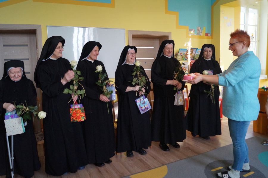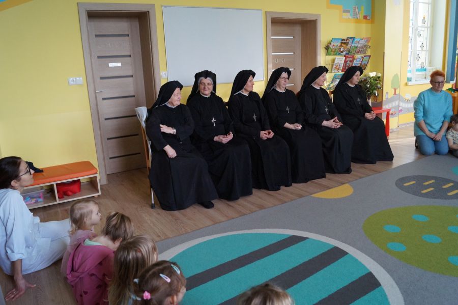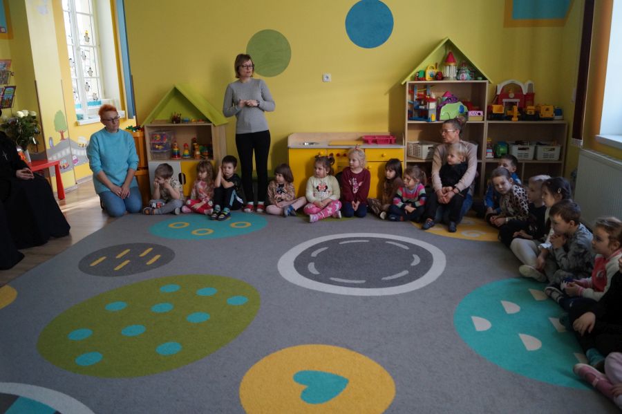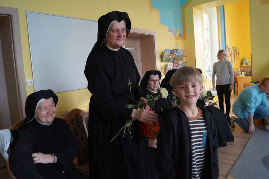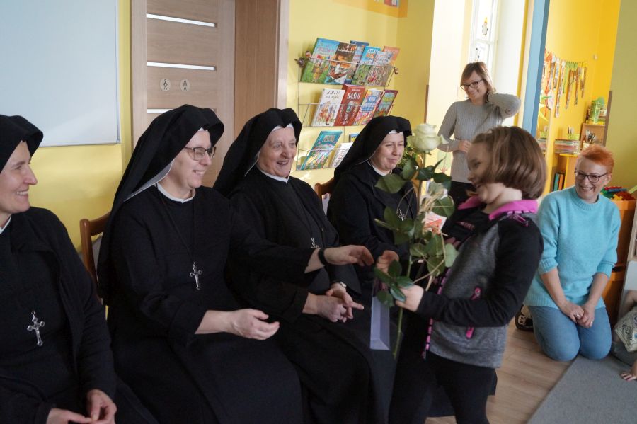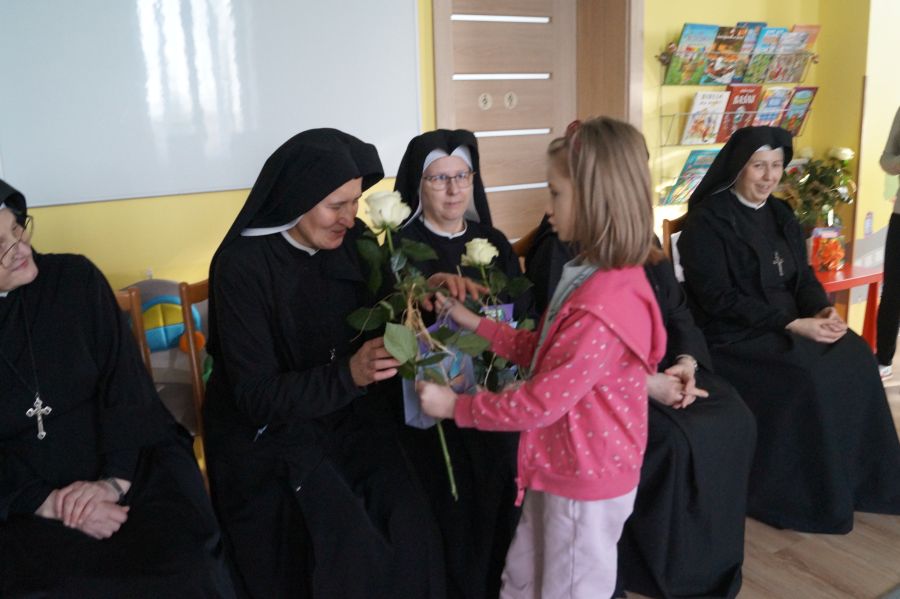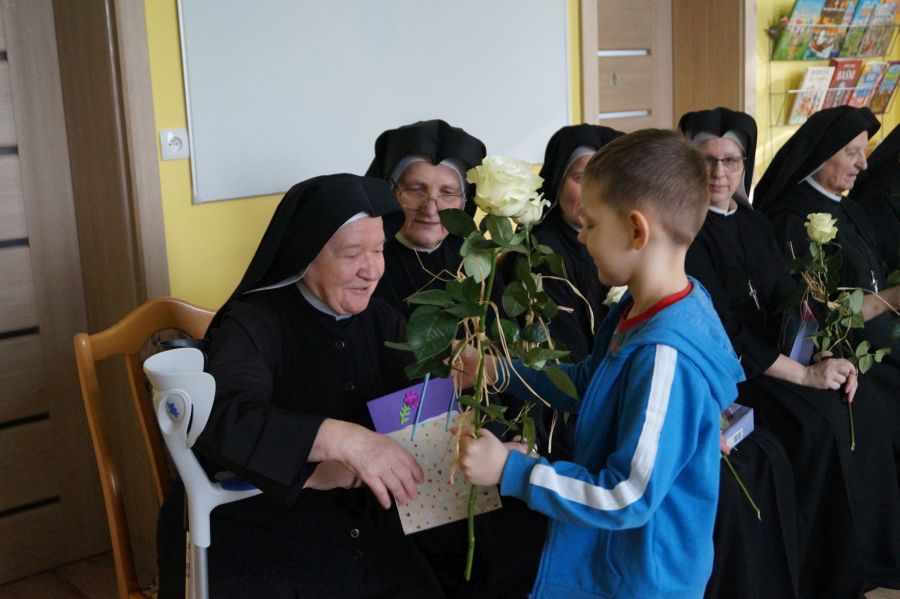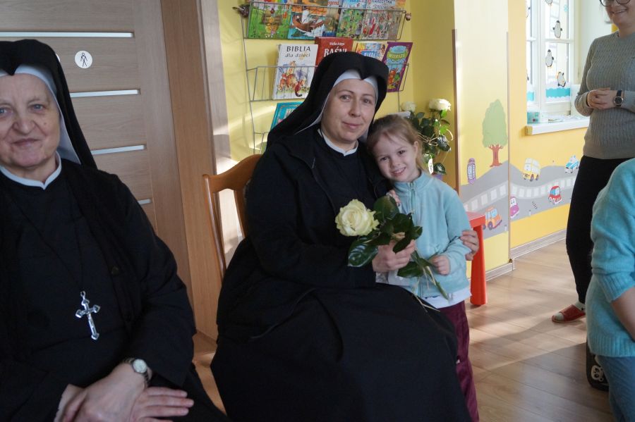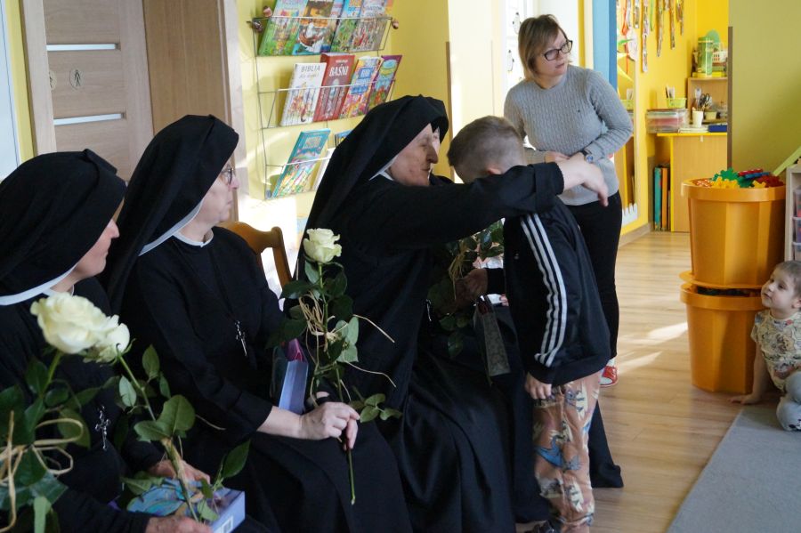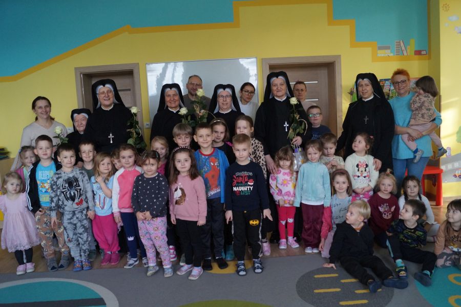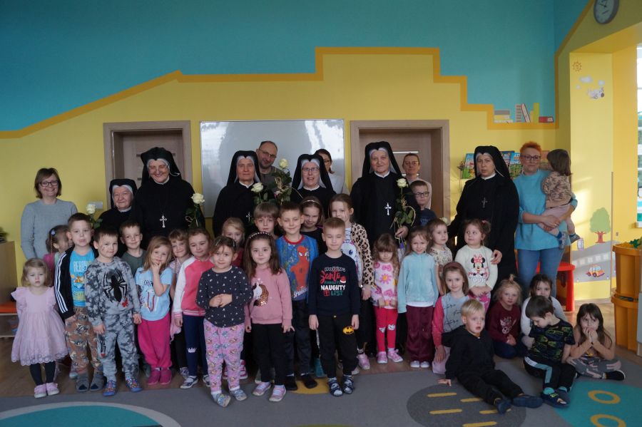 Organem prowadzącym nasze przedszkole jest Zgromadzenie Sióstr Pasterek od Opatrzności Bożej. Dzieci cieszą się codzienną troską pracowników świeckich oraz sióstr- nie tylko tych bezpośrednio zatrudnionych w przedszkolu, ale też pozostałych ze wspólnoty żołędowskiej. Przedszkolacy pamiętali ( oczywiście z inicjatywy dorosłych;)) że w niedzielę obchodzone będzie święto Ofiarowania Pańskiego i nasze siostry będą obchodzić swoje święto. Cała społeczność zebrała się zatem razem, aby złożyć siostrom życzenia i podziękować za trud wkładany w pracę na rzecz przedszkola.