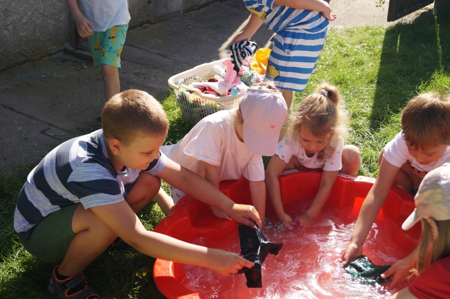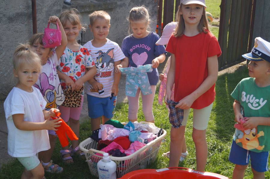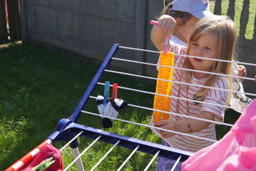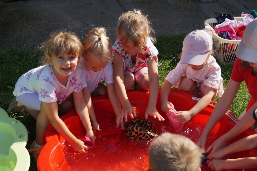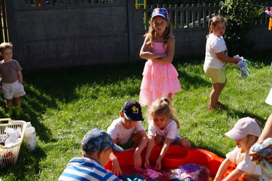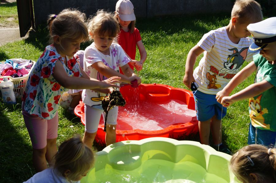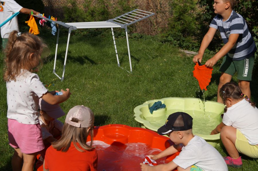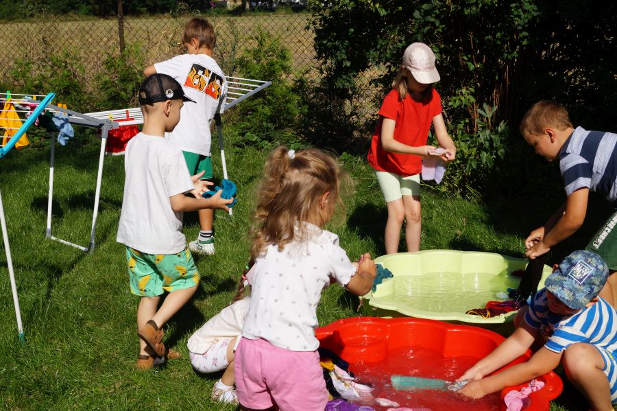 Wakacje sprzyjają alternatywnym zabawom w przedszkolu. Dlatego też korzystając z pięknej pogody, dzieci urządziły pranie ubranek dla lalek. Świetna zabawa ćwicząca wiele funkcji motorycznych oraz nieco praktycznych umiejętności.