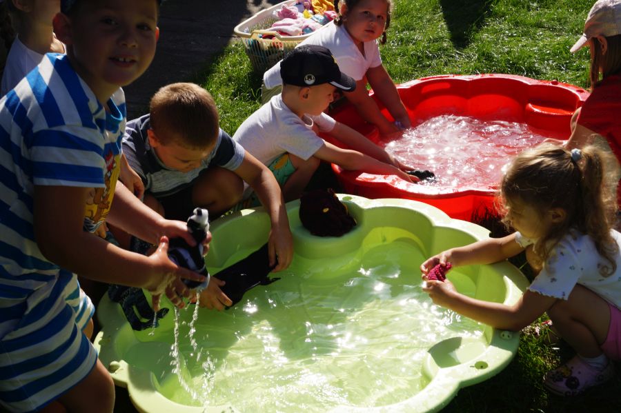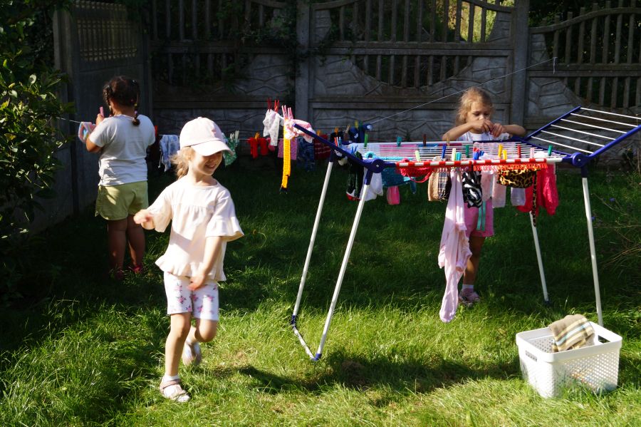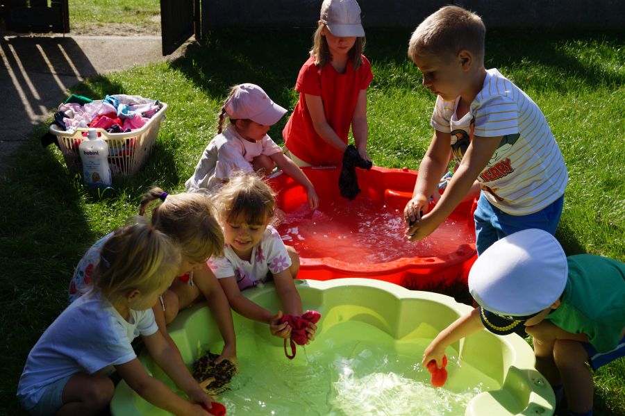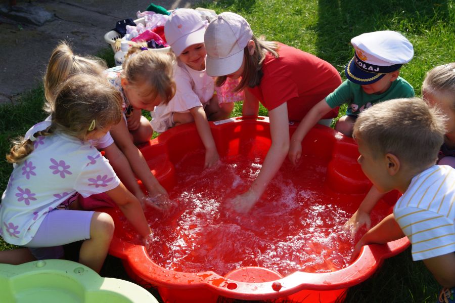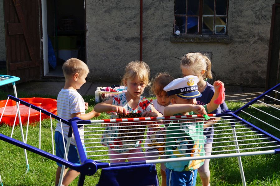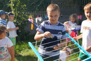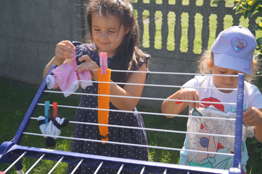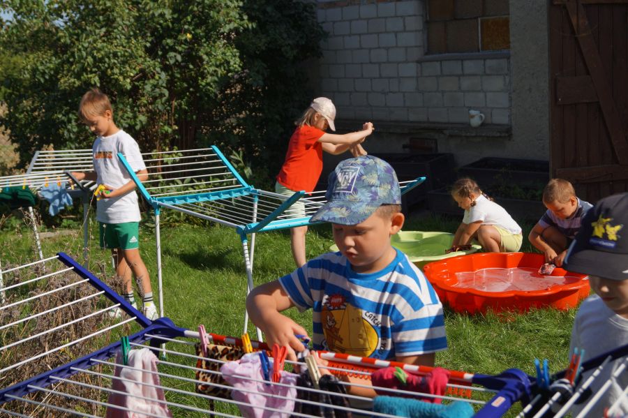 Wakacje sprzyjają alternatywnym zabawom w przedszkolu. Dlatego też korzystając z pięknej pogody, dzieci urządziły pranie ubranek dla lalek. Świetna zabawa ćwicząca wiele funkcji motorycznych oraz nieco praktycznych umiejętności.