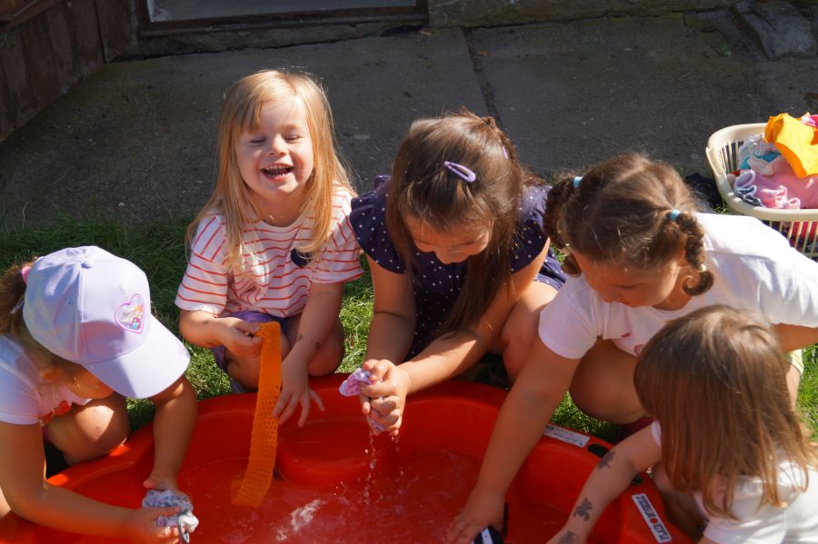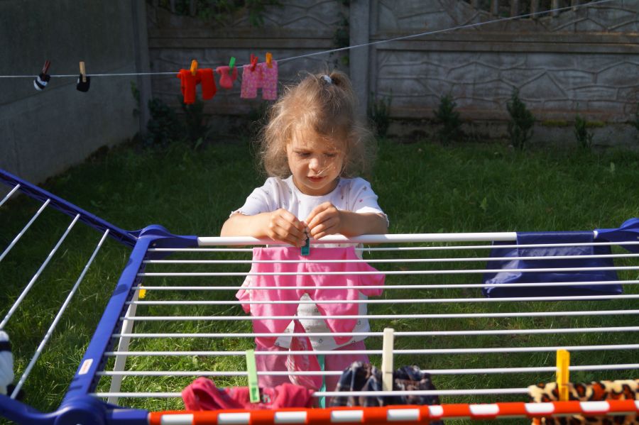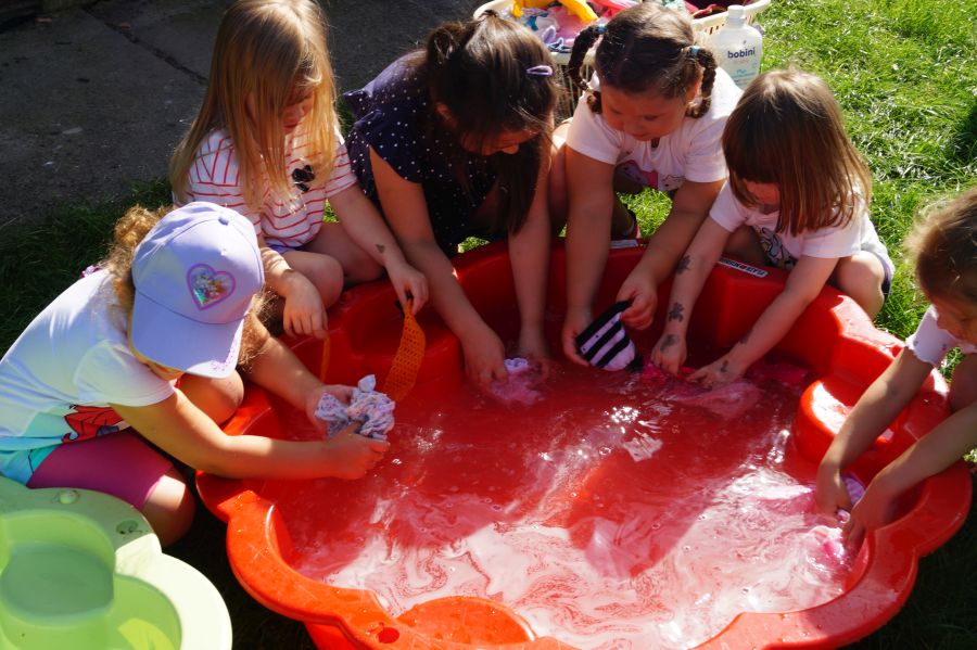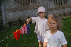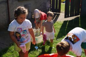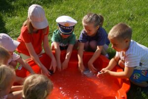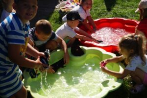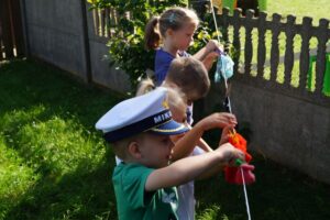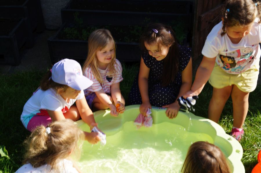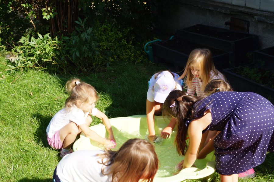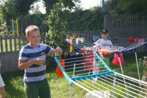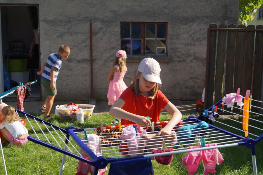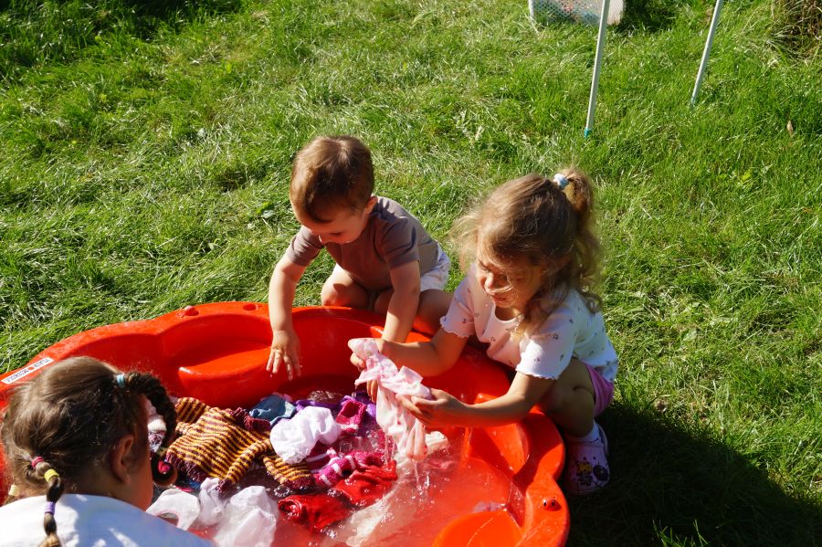 Wakacje sprzyjają alternatywnym zabawom w przedszkolu. Dlatego też korzystając z pięknej pogody, dzieci urządziły pranie ubranek dla lalek. Świetna zabawa ćwicząca wiele funkcji motorycznych oraz nieco praktycznych umiejętności.