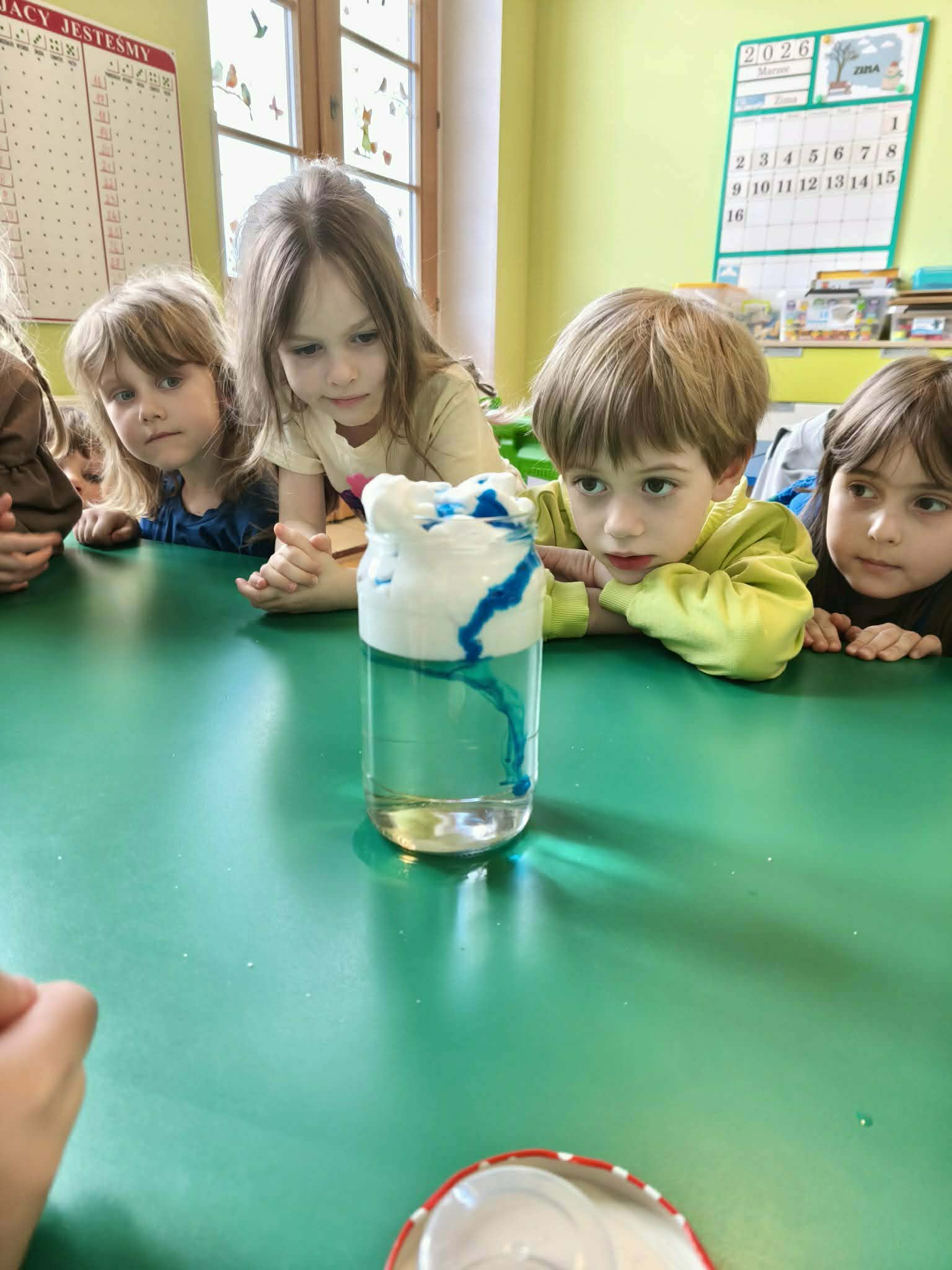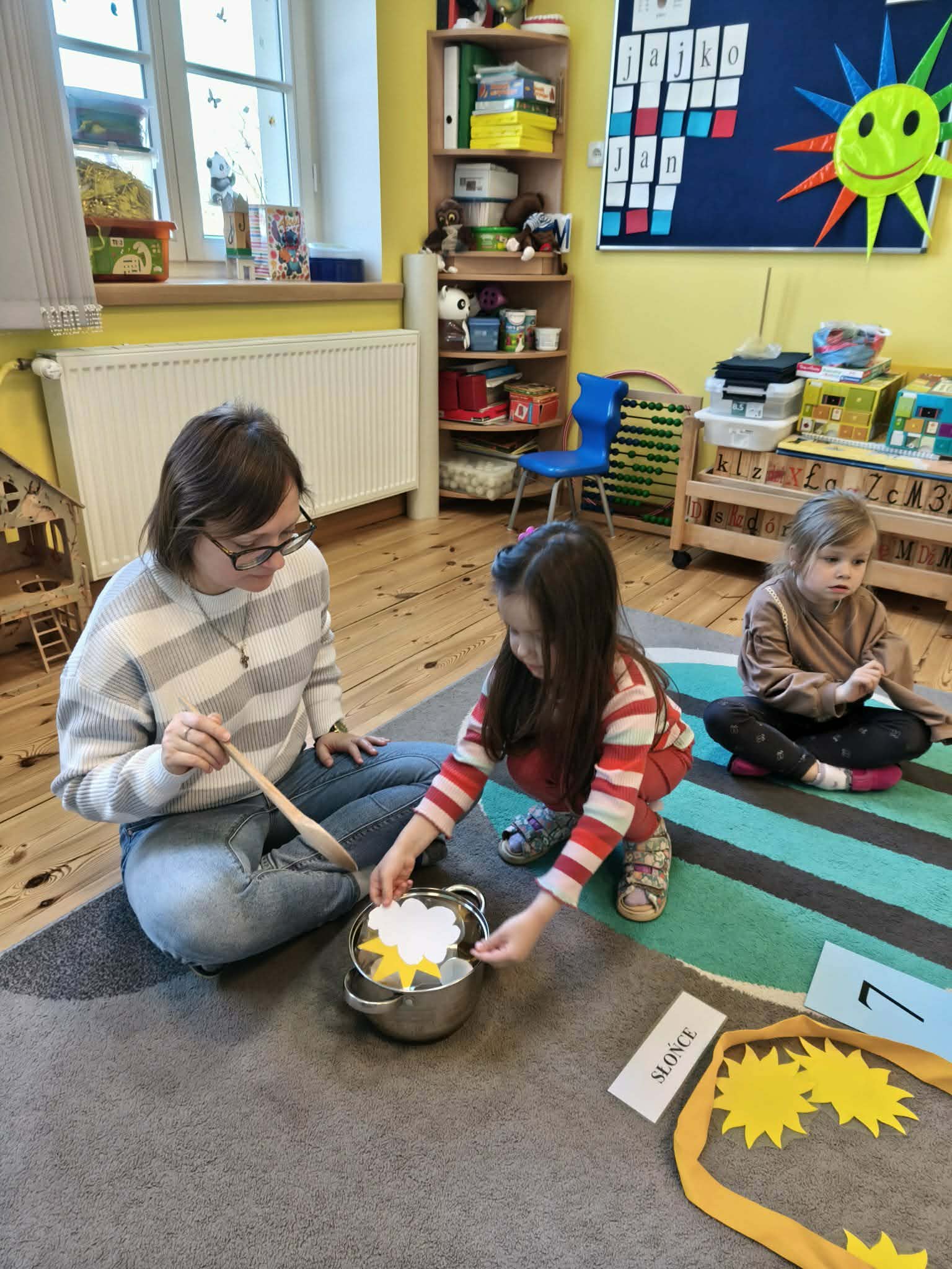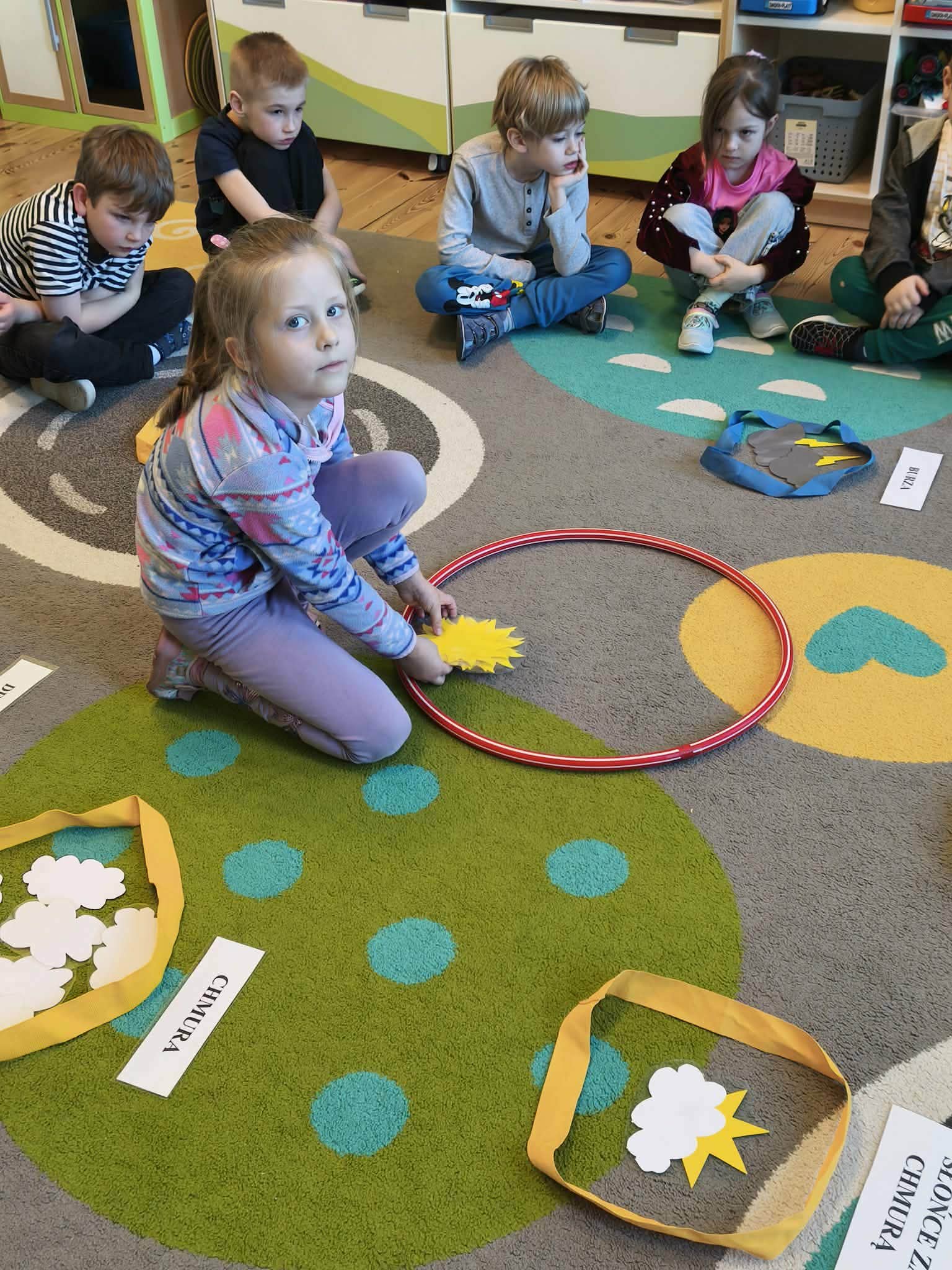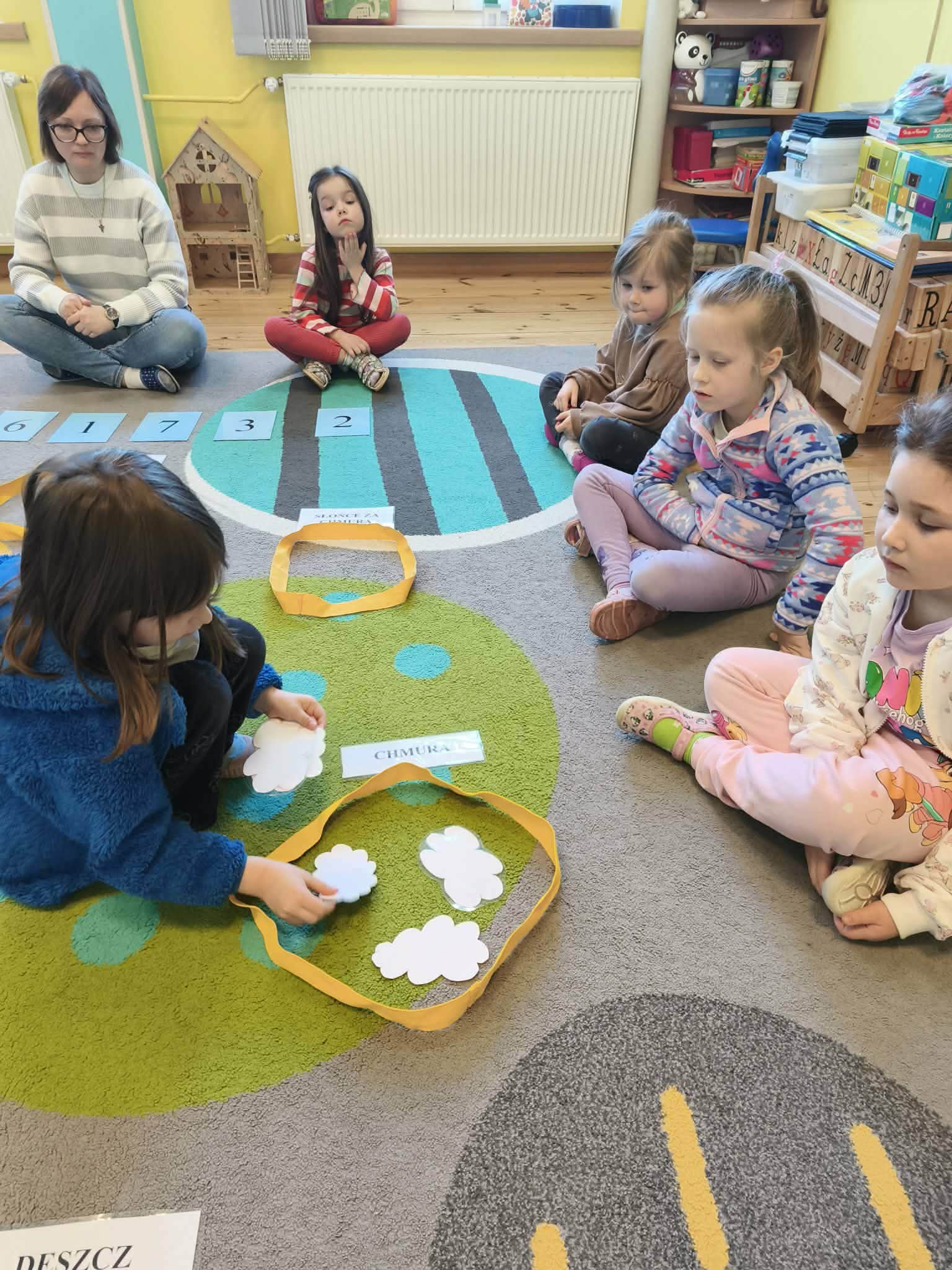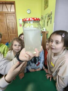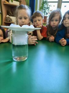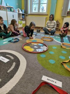 Grupa starsza podczas zajęć poznała znaczenie przysłowia „W marcu jak w garncu”. Dzieci wspólnie opracowały przepis na marcową pogodę z zastosowaniem zabaw matematycznych: segregowały, przeliczały. Ponadto wzięły udział w pogodowych eksperymentach.