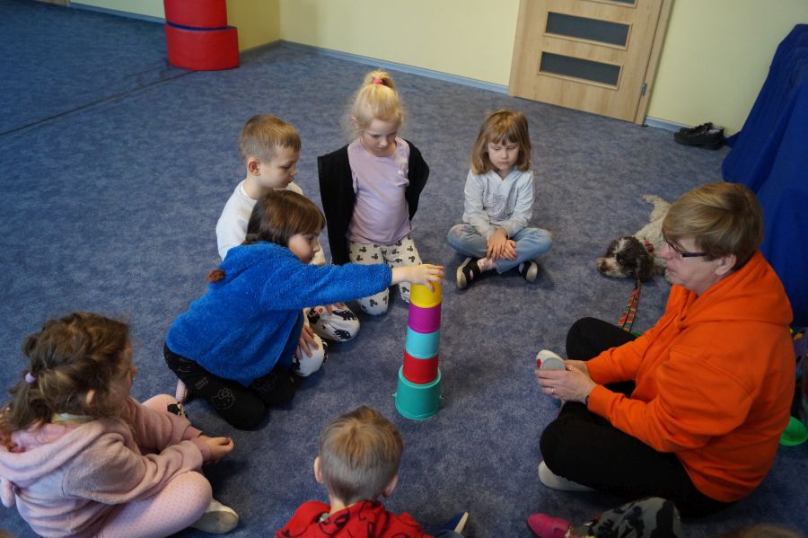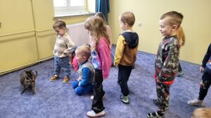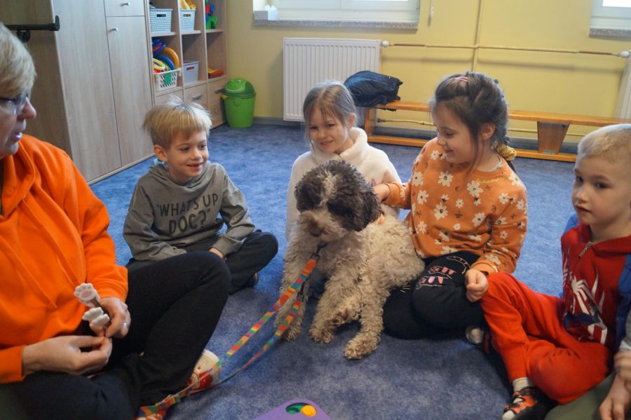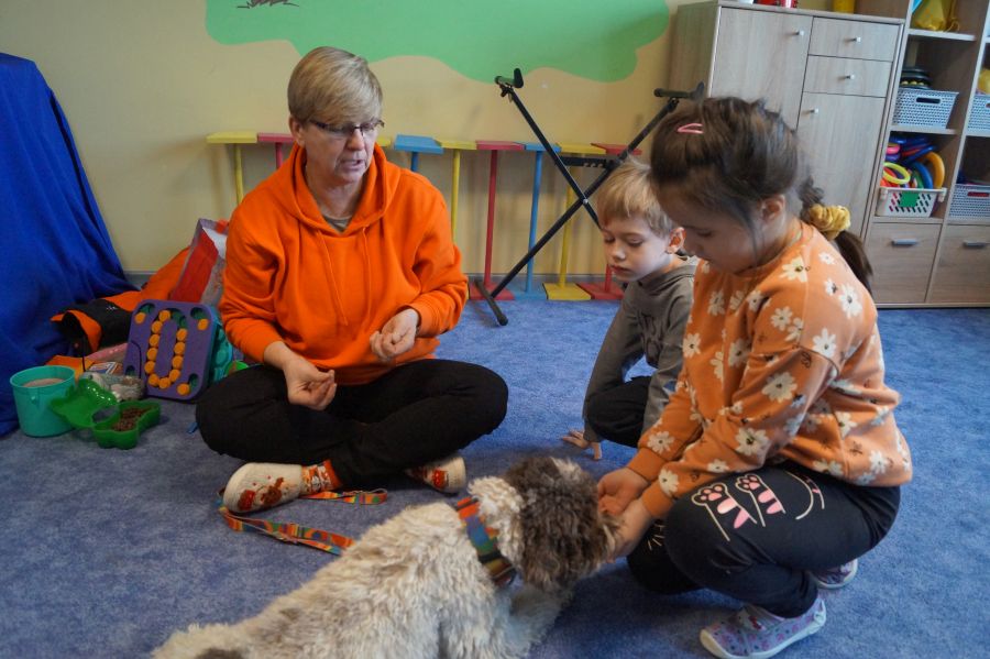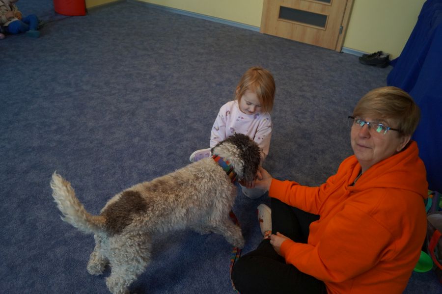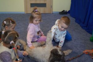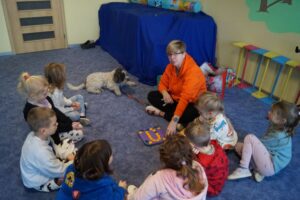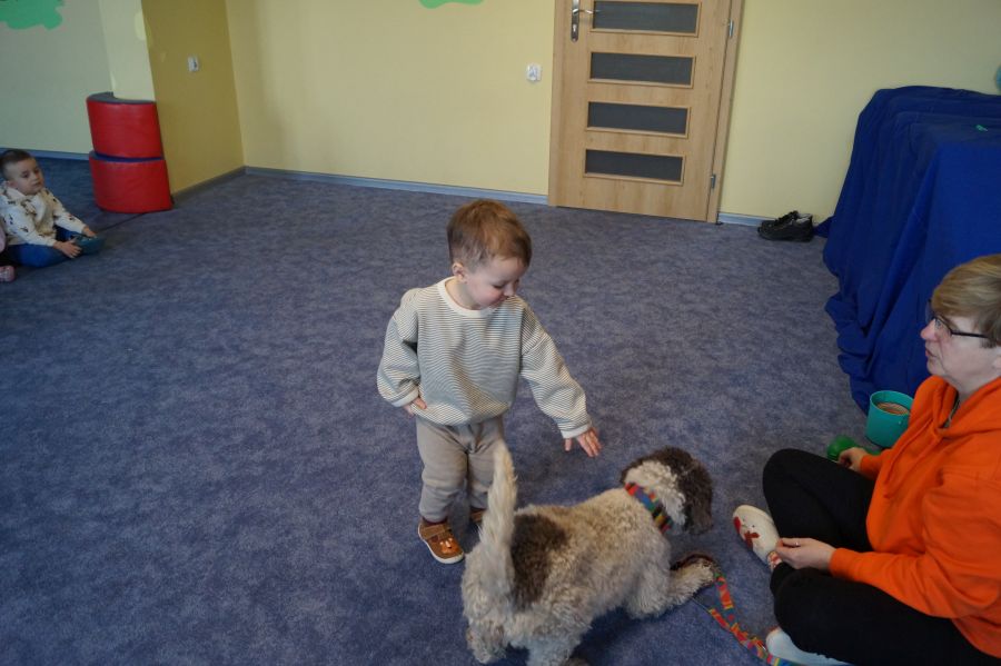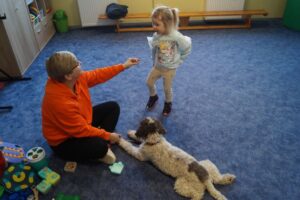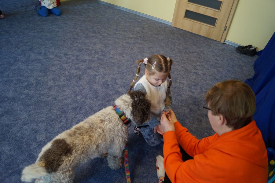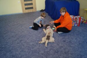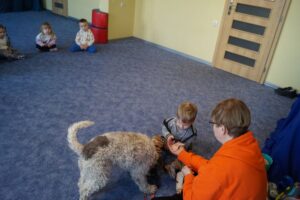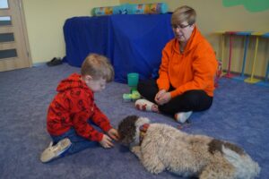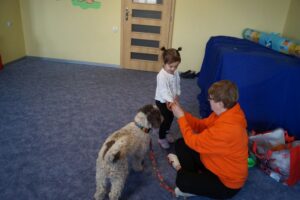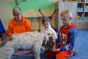 Co miesiąc nasze dzieci maja okazję brać udział w zajęciach z psem. Jest to świetna okazja do nabycia odporności emocjonalnej, nauka postępowania ze zwierzęciem, przełamywania swoich leków i barier. Dzieci zawsze chętnie biorą udział w tych spotkaniach.