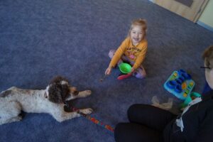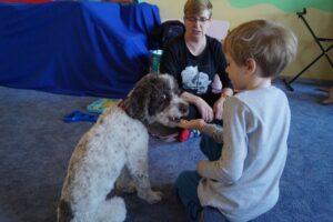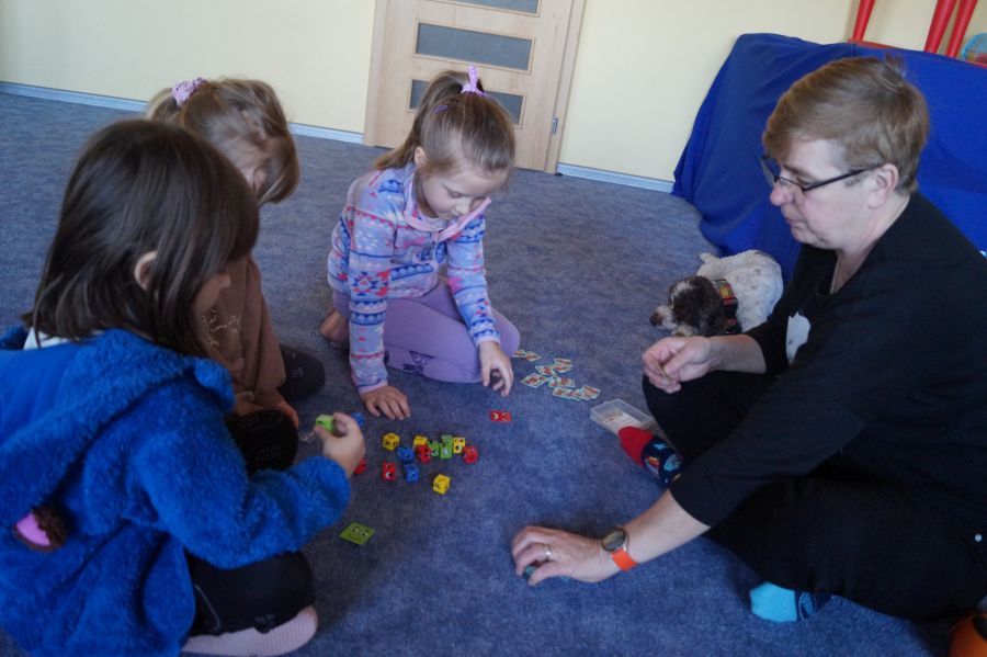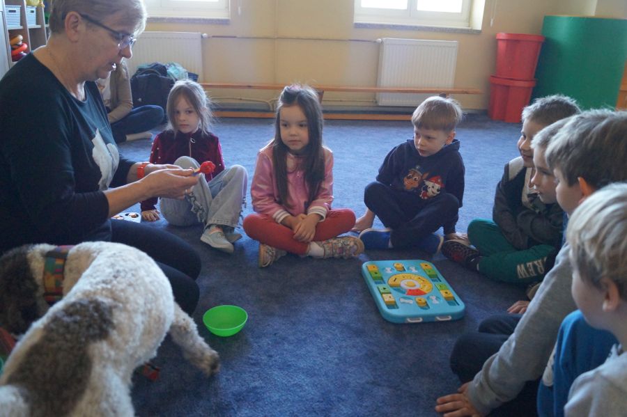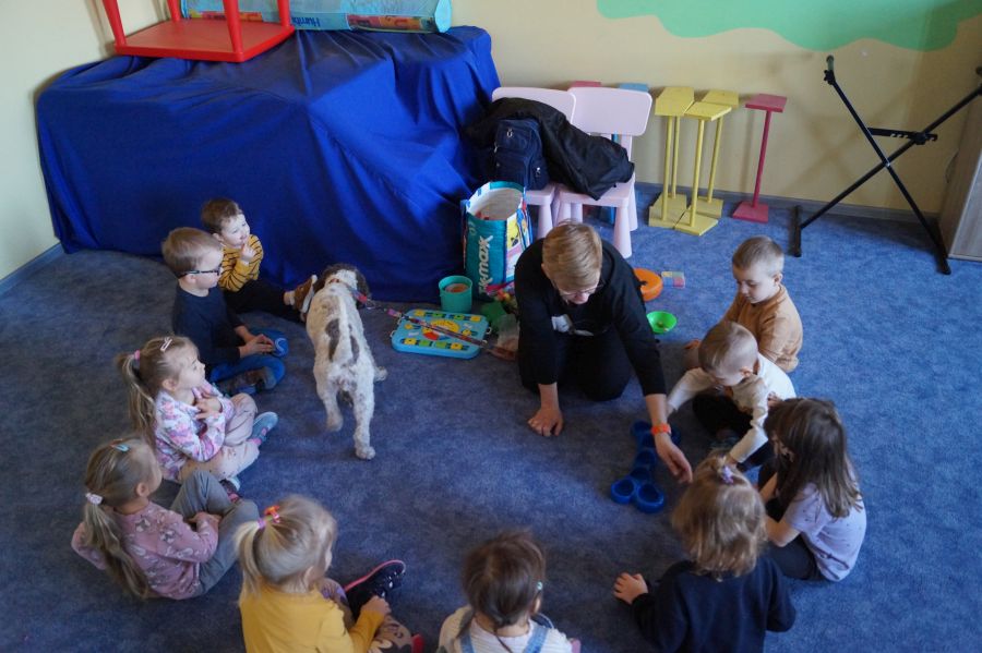 Kolejne zajęcia z psami bardzo ucieszyły dzieci. Zawsze podczas tych spotkań przedszkolacy dowiadują się wielu ciekawych rzeczy na temat czworonogów.