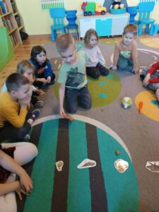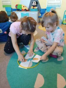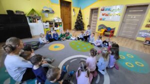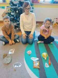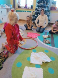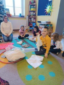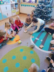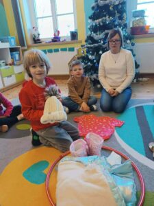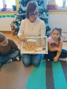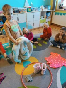 Starszacy w związku z nadejściem nowej pory roku wykonywali różnego rodzaju zadania, m.in. układali puzzle nt. zabaw zimowych, rozwiązywali zagadki związane z zimą, przyporządkowywali garderobę odpowiadającą danej porze roku, a na zakończenie zajęć utrwalili wiedzę o tym, w jaki sposób można pomóc zwierzętom przetrwać zimę.