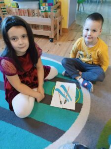 Za oknem marznący deszcz, a więc korzystaliśmy z większej ilości czasu w sali. Dzieci zajęły się techniką malowania sznurkiem- realizując program własny „Dzień zabaw kreatywnych”. zobaczcie jakie piękne kolorowe prace powstały 😉