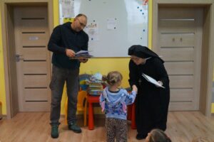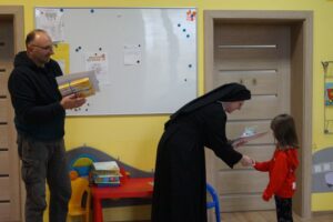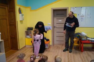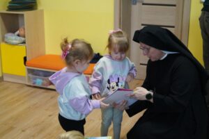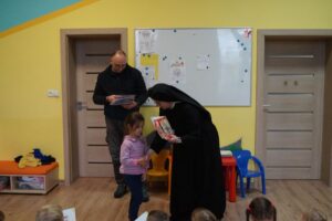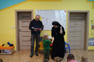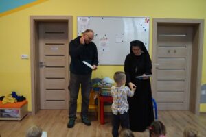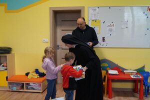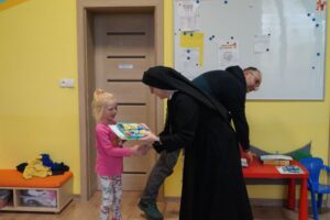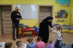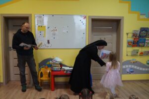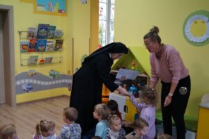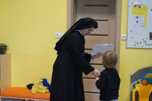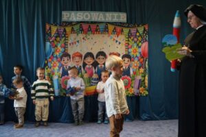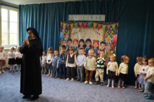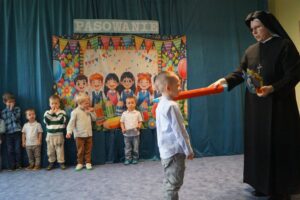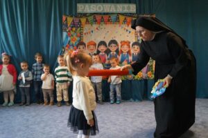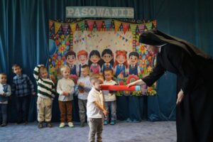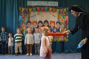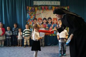 Grupa starsza świętowała dzisiaj pasowanie dzieci na starszaków. Przedszkolacy byli bardzo podekscytowani czekającymi ich zadaniami. Oczywiście dzieci świetnie sobie poradziły i Siostra Dyrektor mogła dokonać aktu pasowania.