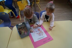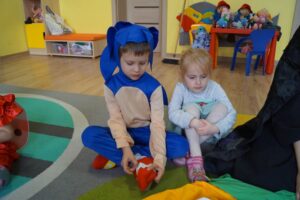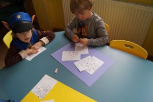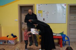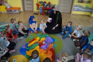 Nasz „Stokrotki” są bardzo odważne. W dniu postaci bajek pomagały złej Babie Jadze, żeby mogła poprawić swoje zachowanie 😉 i już nie niszczyć bajek….w tej konwencji dzieci uczyły się współpracy, ćwiczyły koordynacje wzrokowo- ruchową, utrwalały znajomość tradycyjnych bajek, oceniały postawy bohaterów.