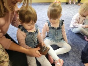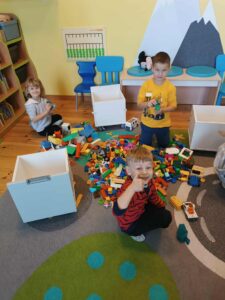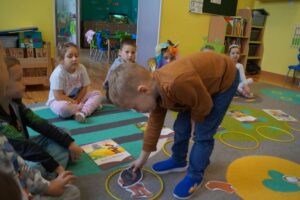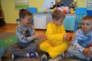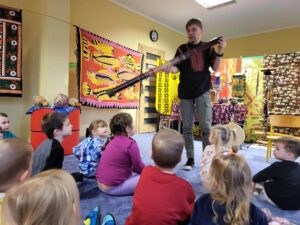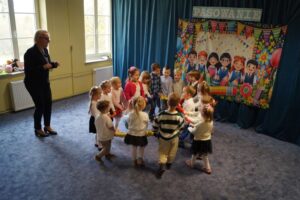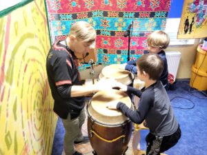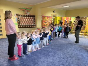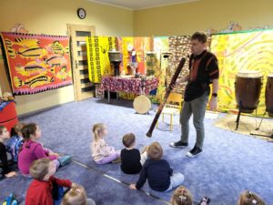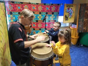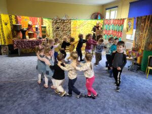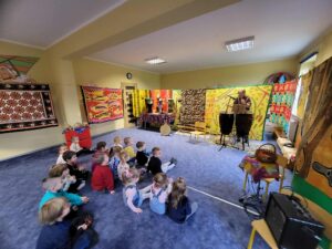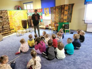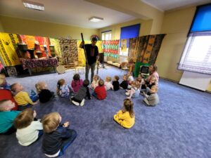 Niektóre dzieci młodsze miały okazje po raz pierwszy zapoznać się z instrumentarium różnych krajów/ kontynentów. Poznaliśmy min. instrumenty takie jak: kalimba, jemba, darabuka, kij deszczowy…. Dzieci chętnie brały udział w proponowanych zabawach.