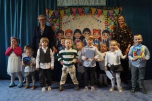 W naszym przedszkolu wielkie święto. Jeden z najważniejszych dni w życiu przedszkolaka czyli pasowanie- oficjalne włączenie dziecka do społeczności przedszkola. Nasze maluchy świetnie się zaprezentowały przed rodzicami, dziadkami i Siostrą Dyrektor, która na zakończenie dokonała uroczystego pasowania.