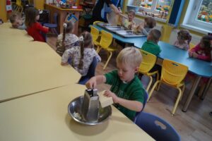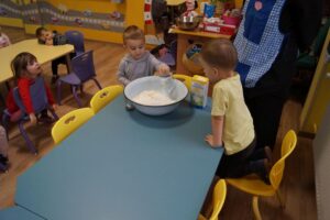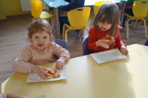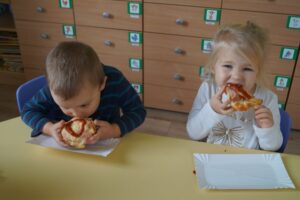 Od samego rana maluchy zabrały się za przygotowanie pizzy. Okazało się, że wszystkie dzieci bardzo chętnie pracują w kuchni, a jeszcze chętniej zjadają przygotowane przez siebie posiłki. Mieliśmy też okazję odbyć małą wycieczkę do kuchni.