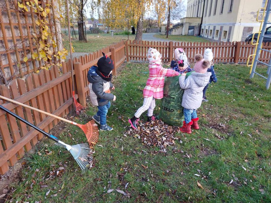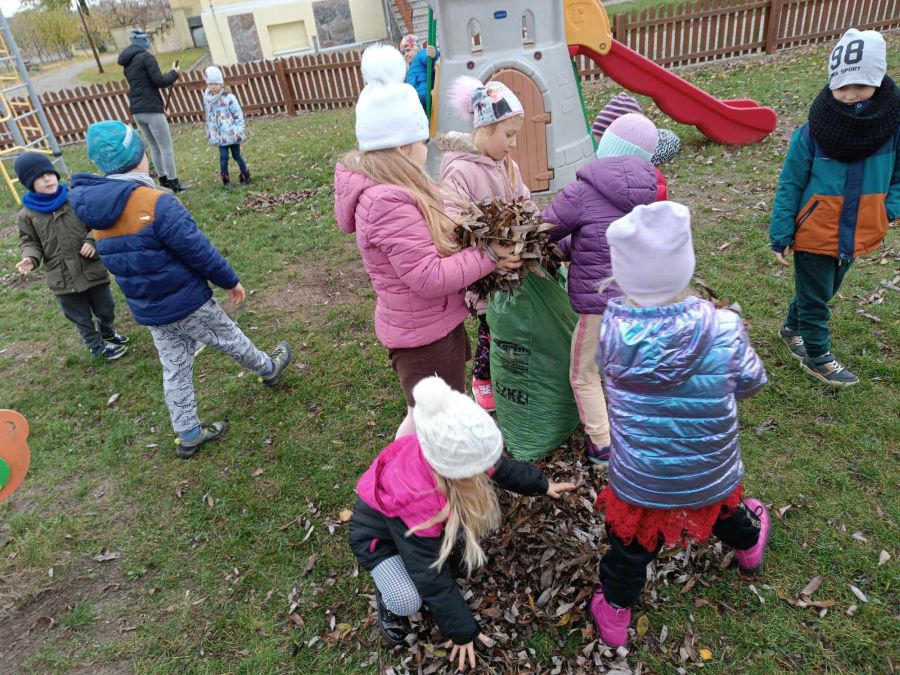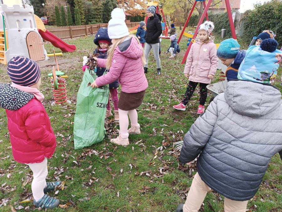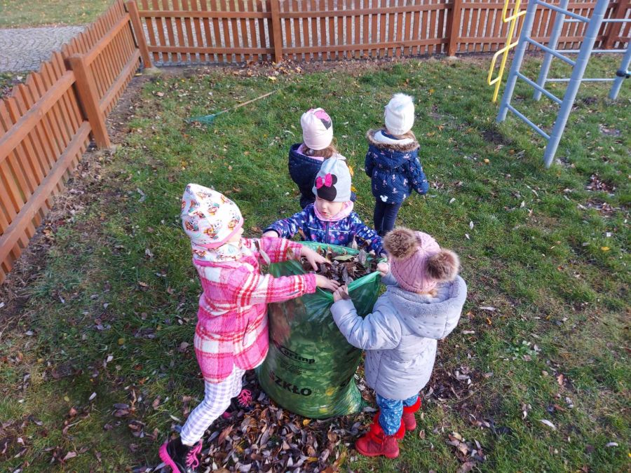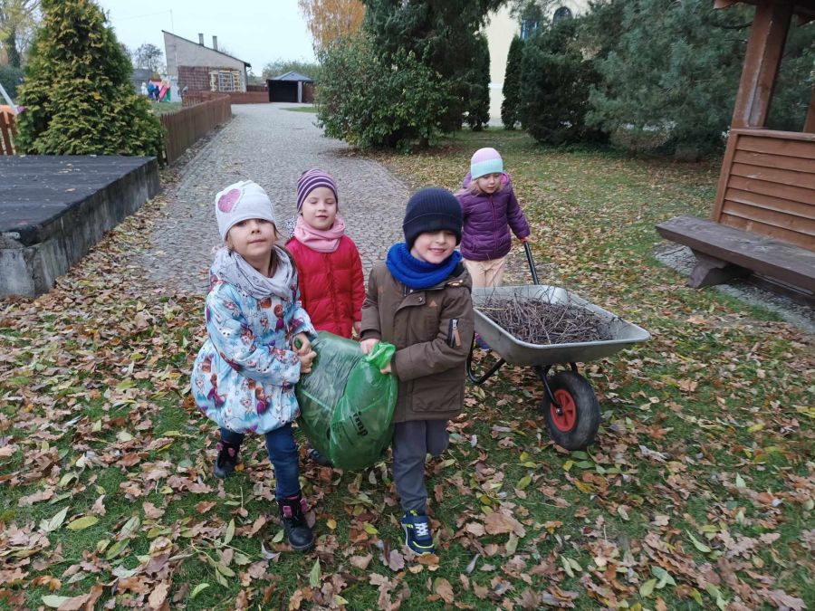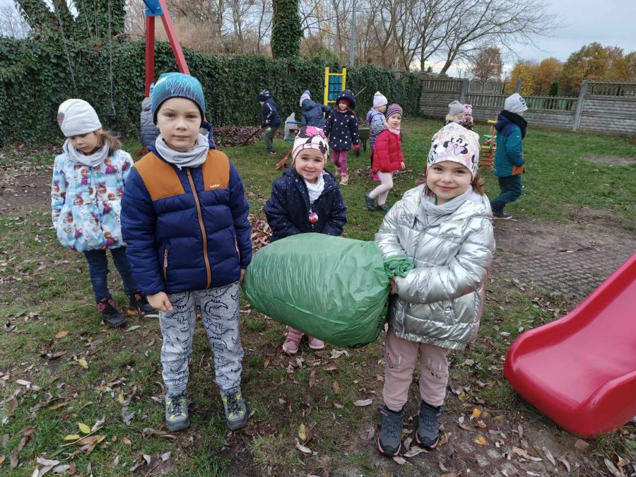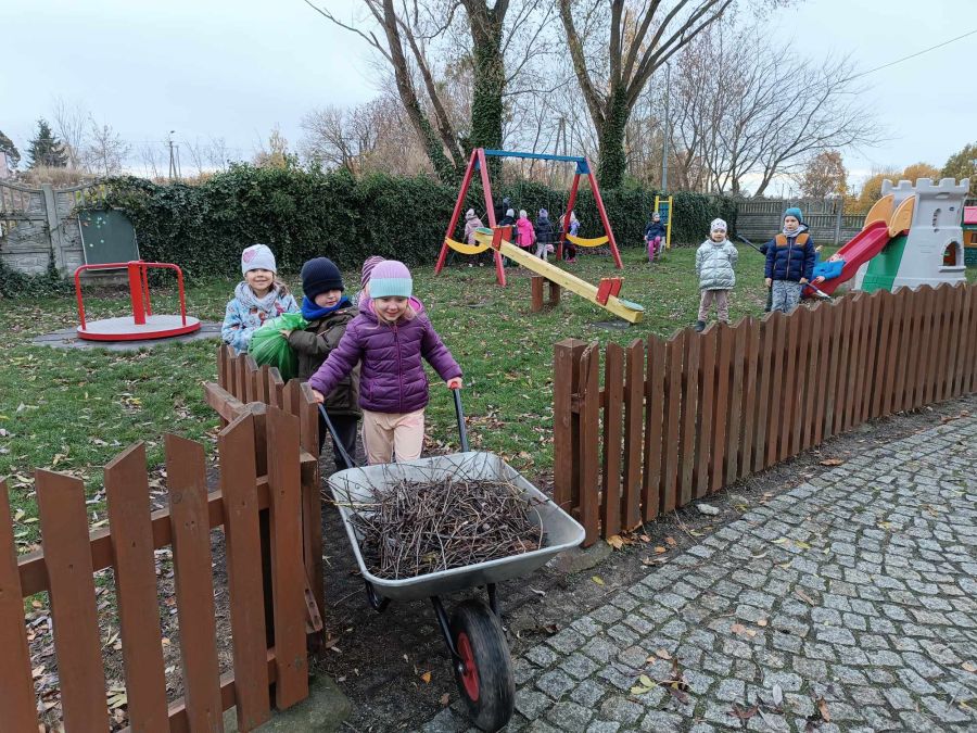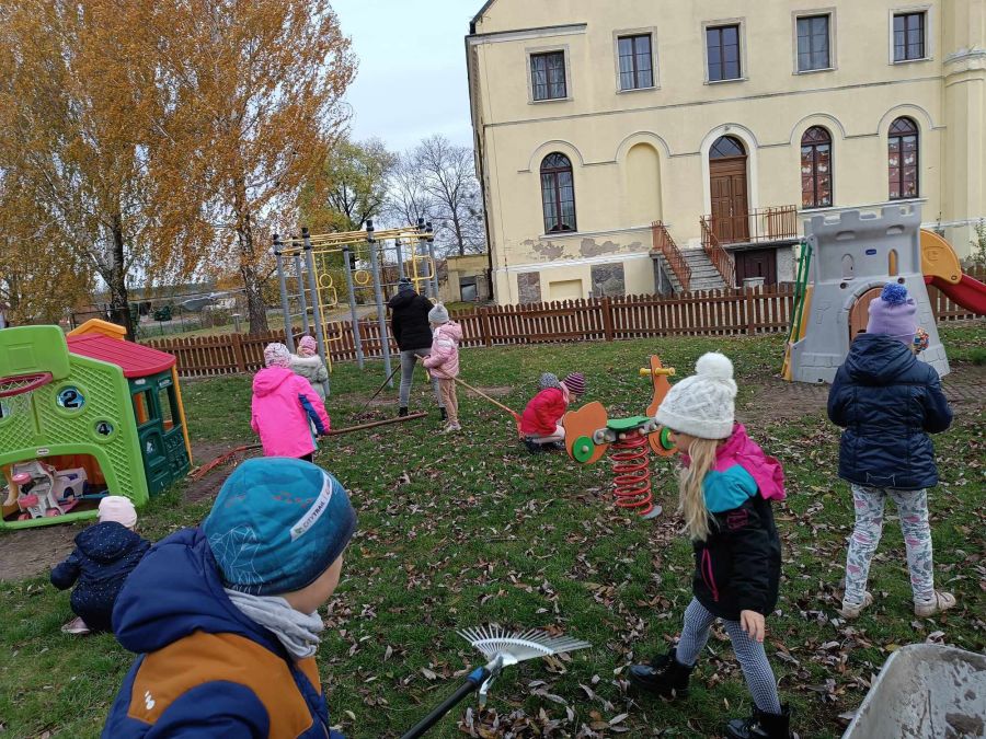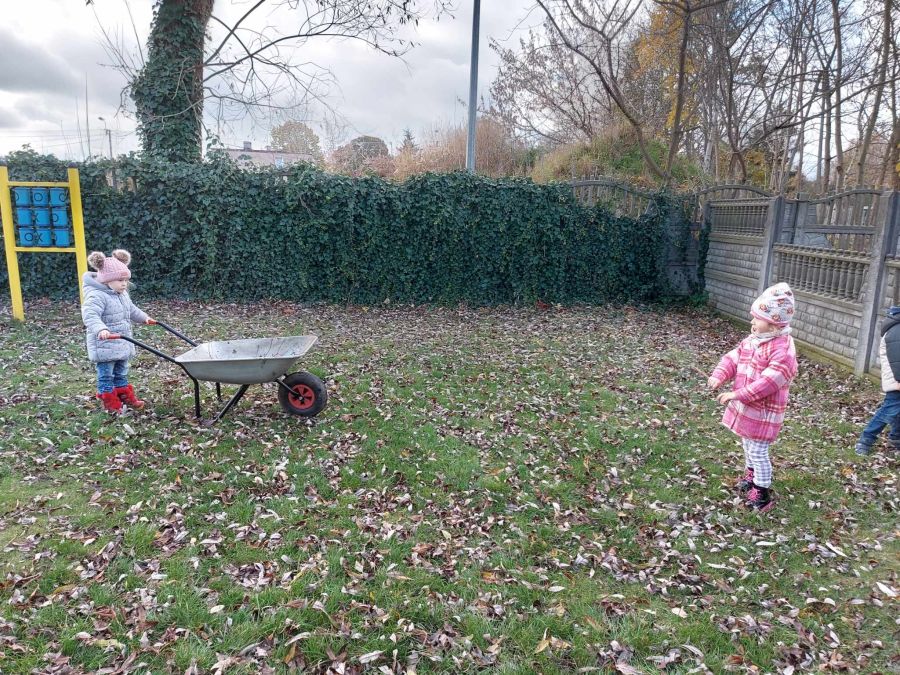 Nasi przedszkolacy żadnej pracy się nie boją ;). Zawsze chętnie bawią się na placu zabaw, a tym razem wzięły się za jesienne porządki.