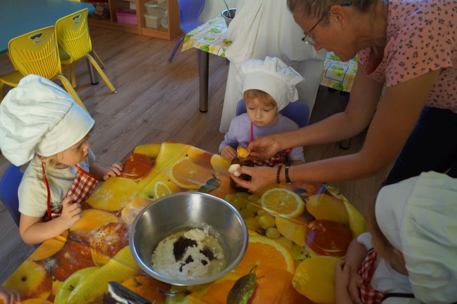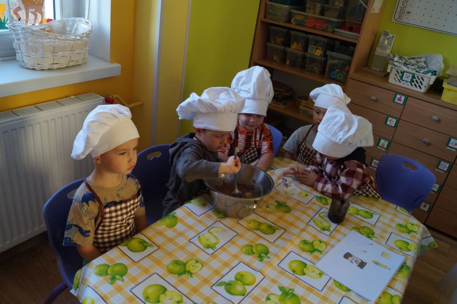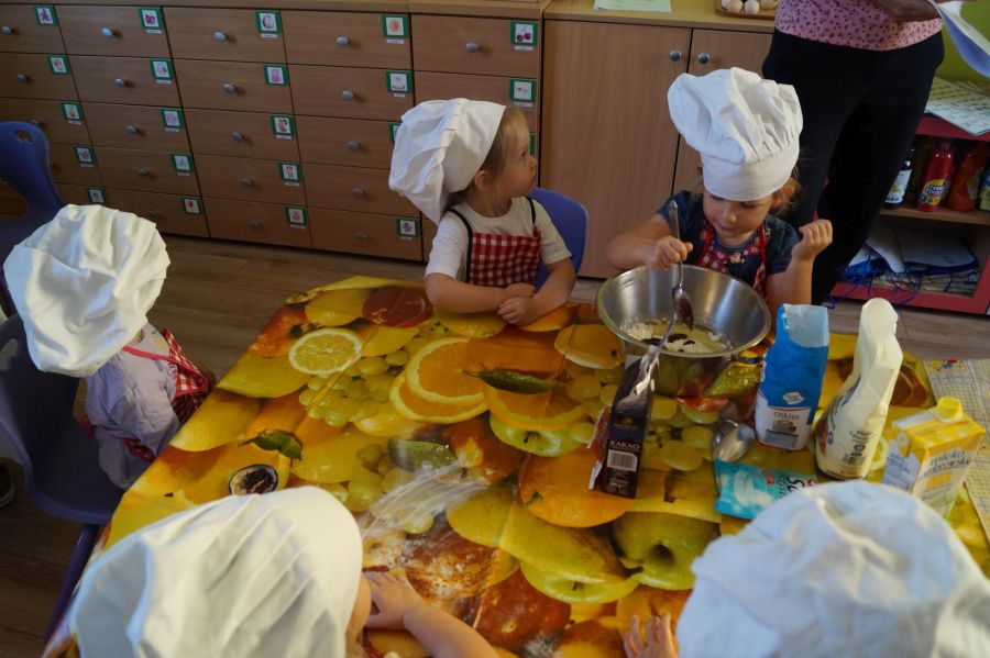 Grupa młodsza chętnie podejmuje różne wyzwania ;). Tym razem dzieci upiekły ciasto z powidłami, odmierzały składniki, mieszały dzielnie, a na koniec wszystko chętnie zjadły.