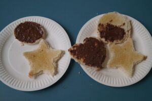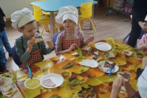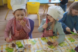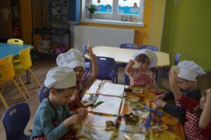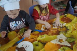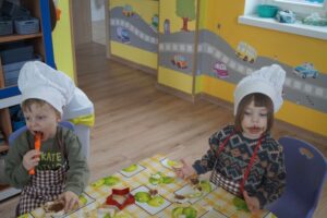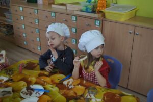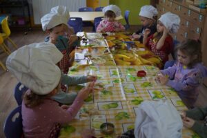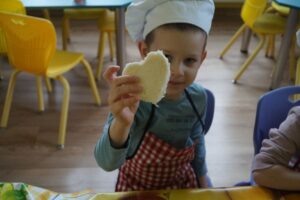 Grupa młodsza próbowała swoich sił przy robieniu „Kosmicznych” kanapek. Musimy przyznać, że robienie ich sprawiło dzieciom największą frajdę i kanapki były przepyszne.