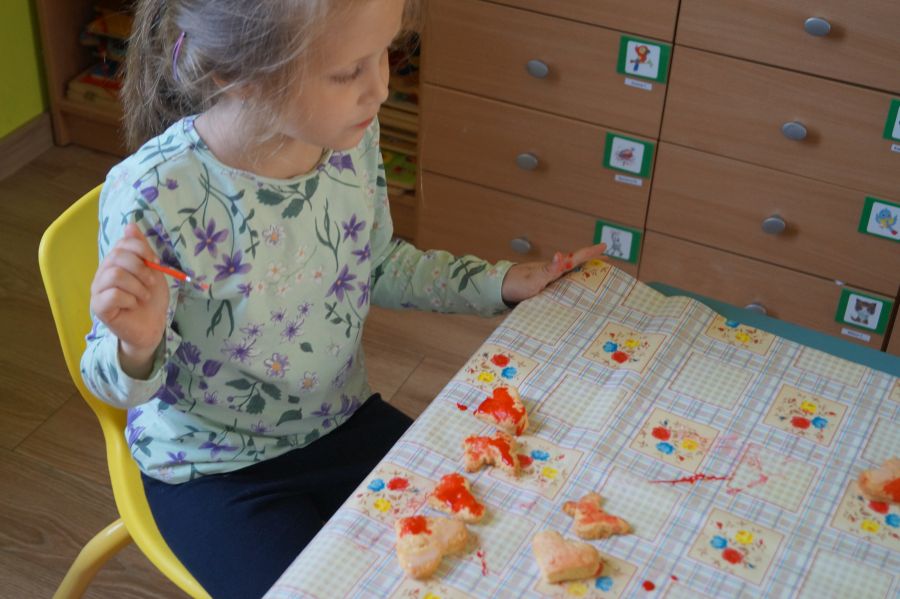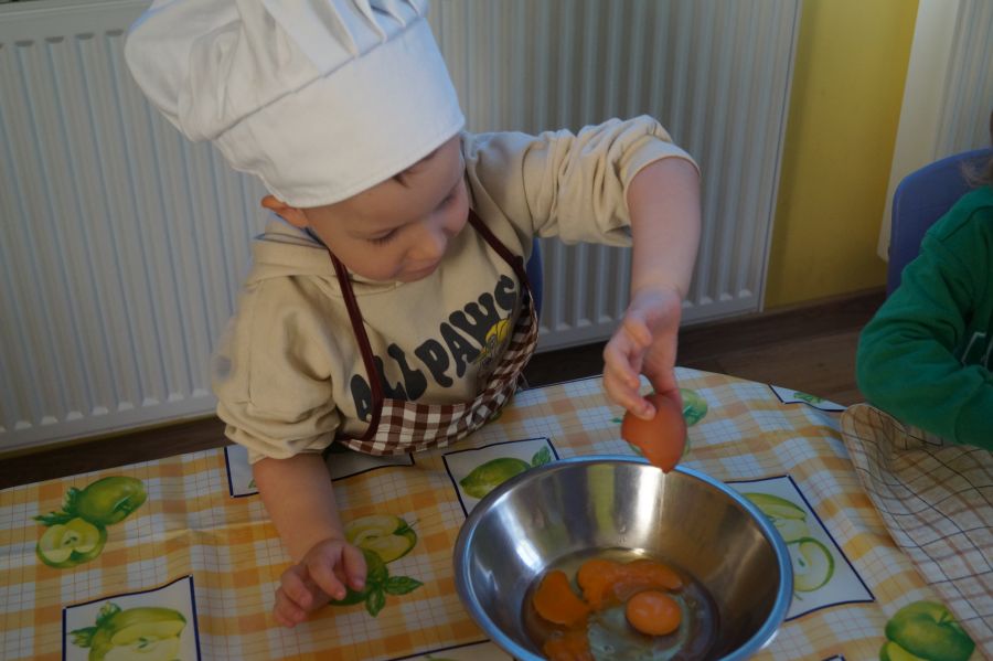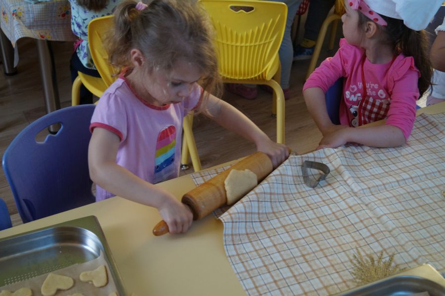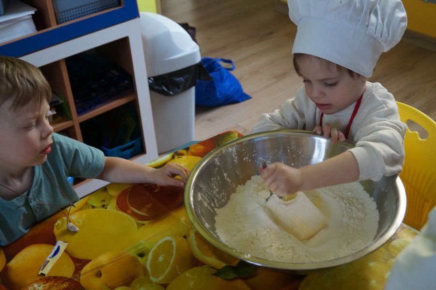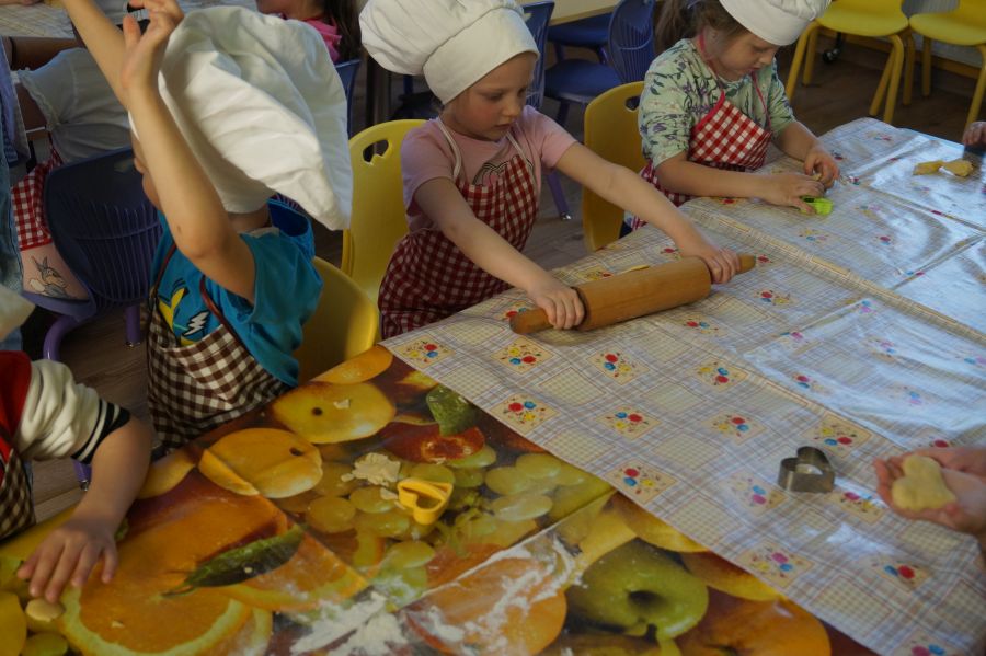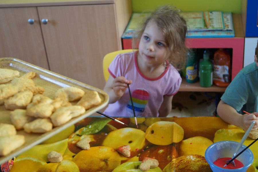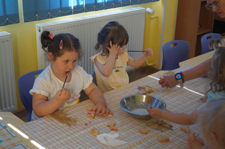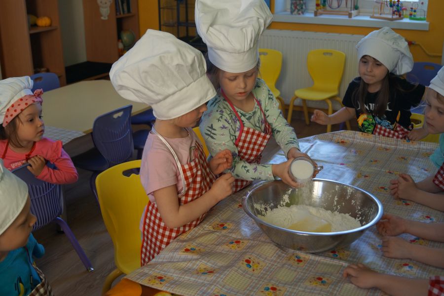 Dzisiaj było u maluszków „Kuchcikowo”. Dzieci wyrabiały ciasto na kruche ciasteczka a po upieczeniu pięknie udekorowały na kolor biało- czerwony. Ciasteczka były pyszne.