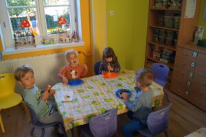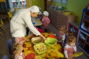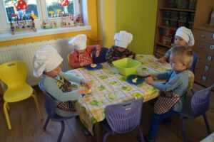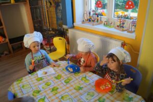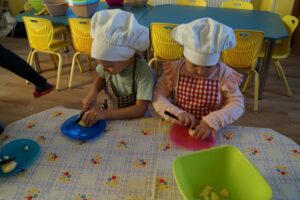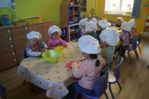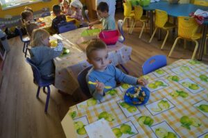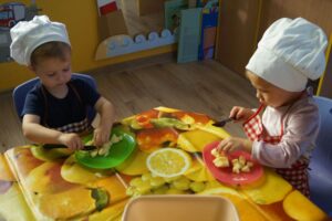 Grupa młodsza ćwiczyła umiejętności samoobsługowe krojąc owoce do sałatki owocowej. Dzieci pokroiły wszystko, a potem wybierały to, co znajdzie się na ich talerzykach.