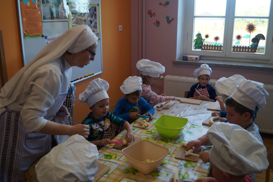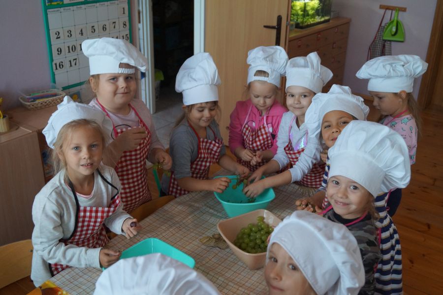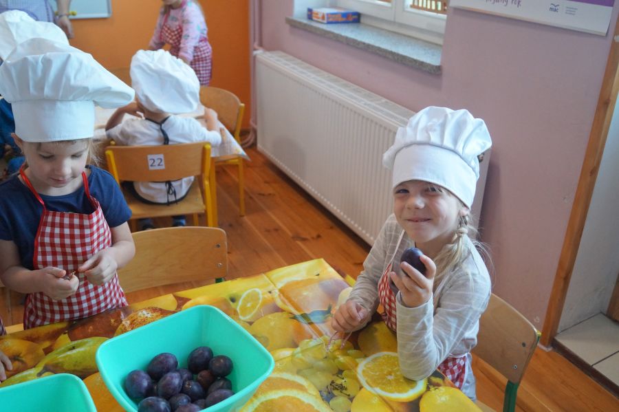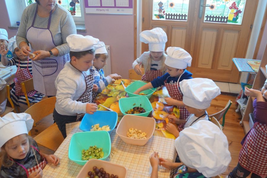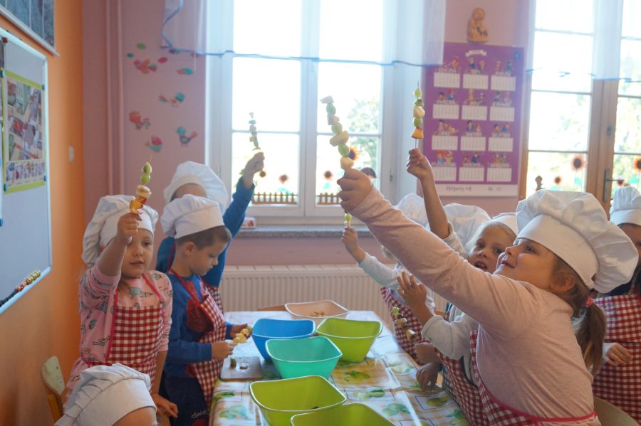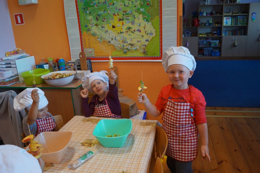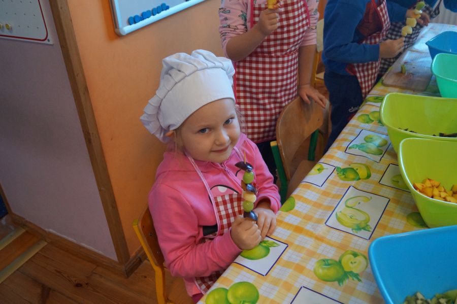 Grupa Bratki zamieniła się dzisiaj w kucharzy i wspólnie z s. Katarzyną przygotowała owocowe szaszłyki, główną rolę grały: banany, winogrona, jabłka, śliwki, kiwi, brzoskwinie.