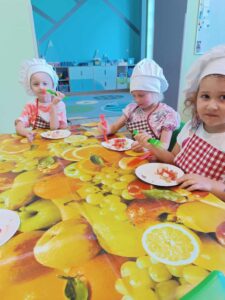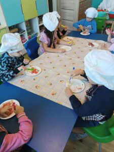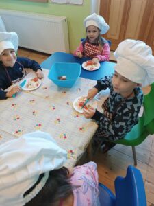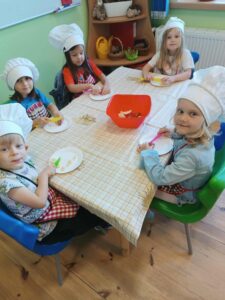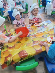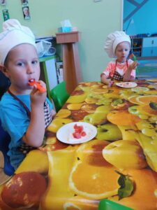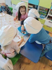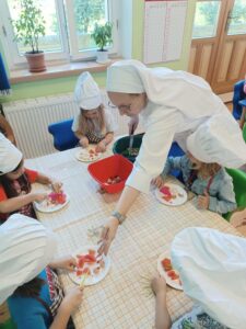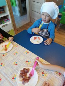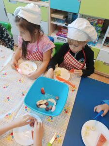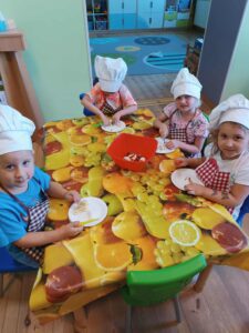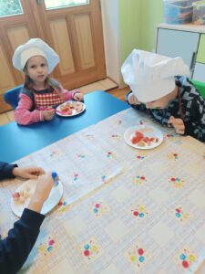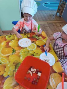 Starsi przedszkolacy nie pr贸偶nuj膮 馃槈 Dzieci razem w wychowawcami przygotowa艂y smaczn膮 i zdrow膮 sa艂atk臋 owocow膮.