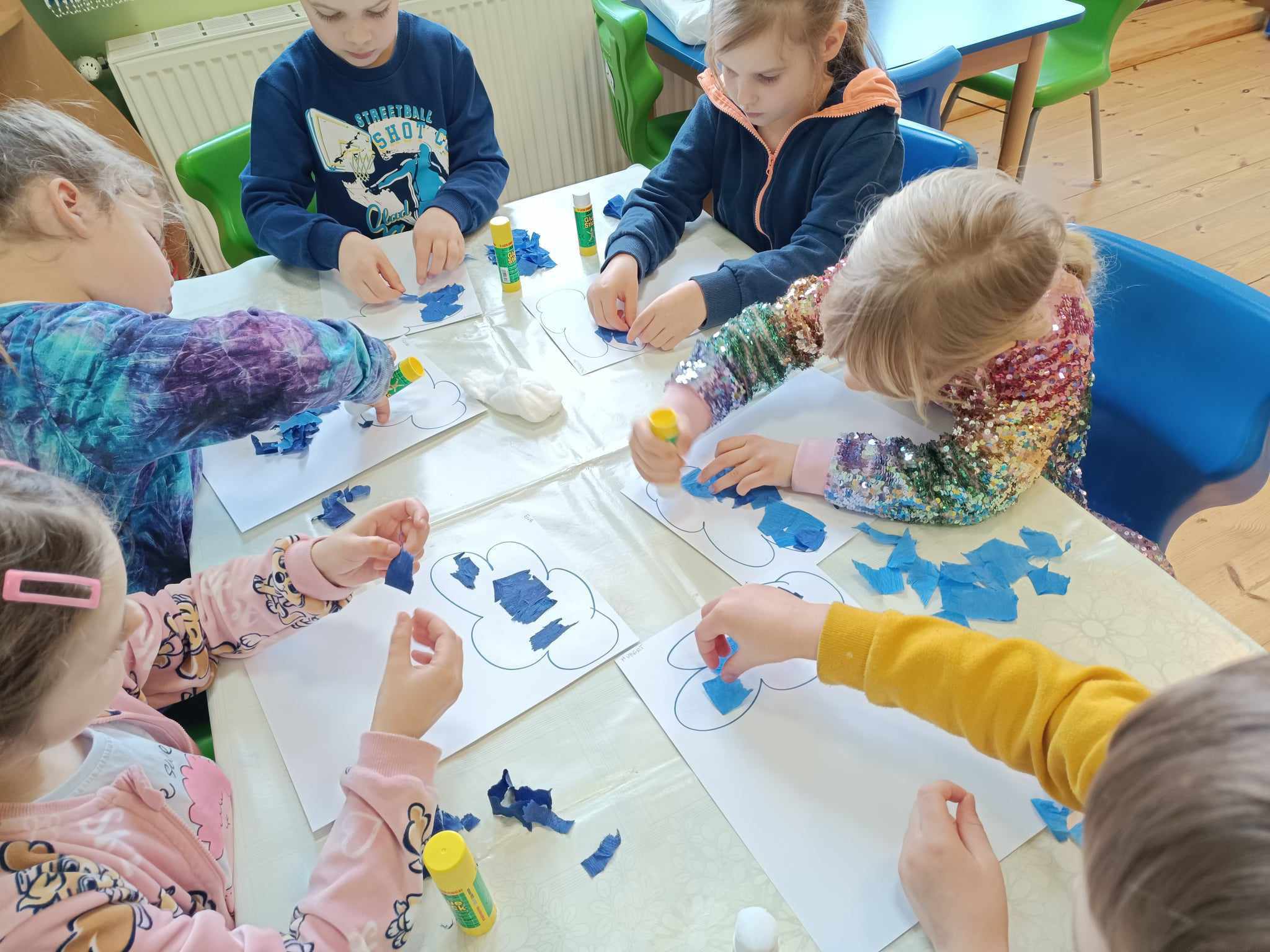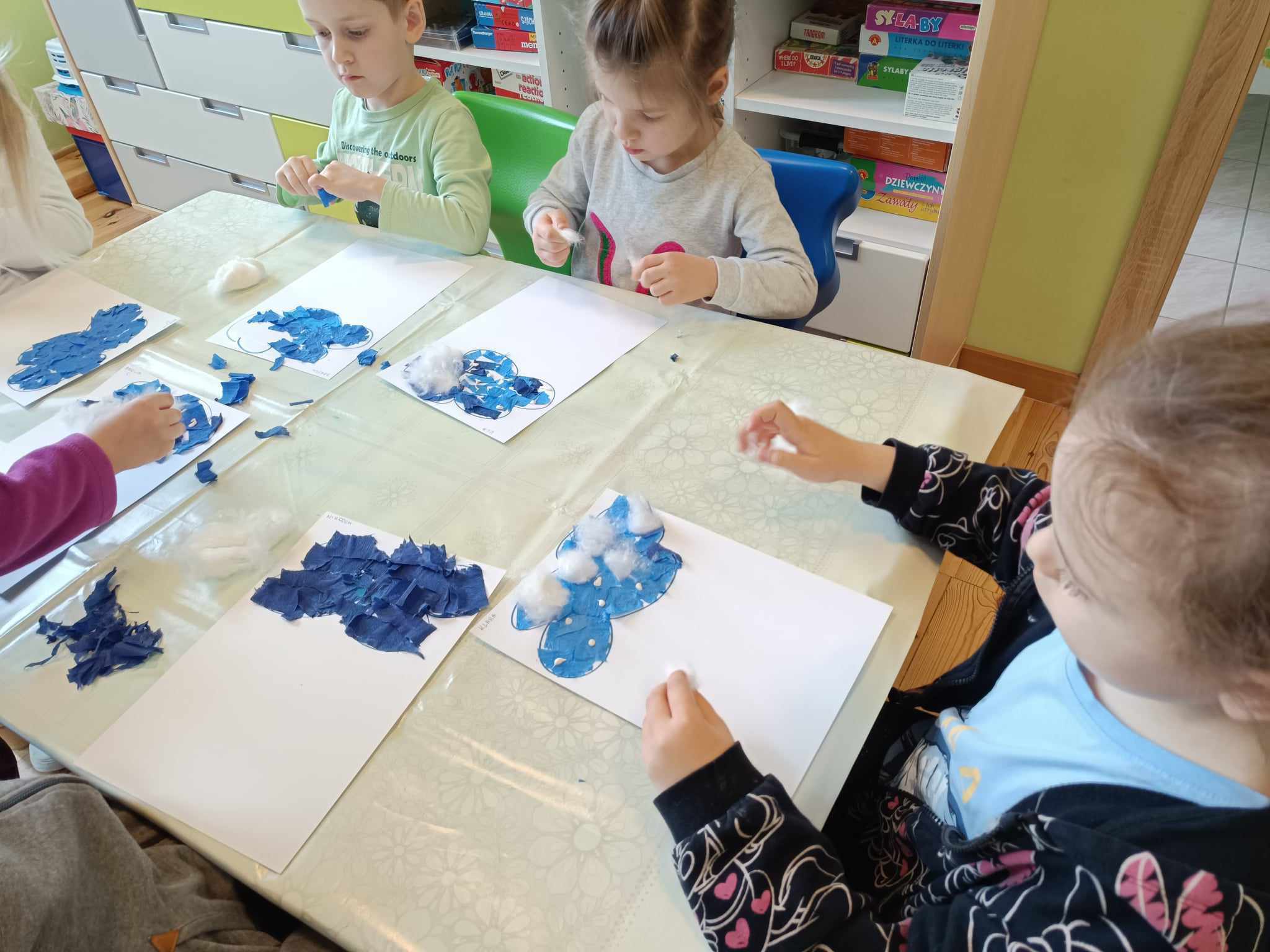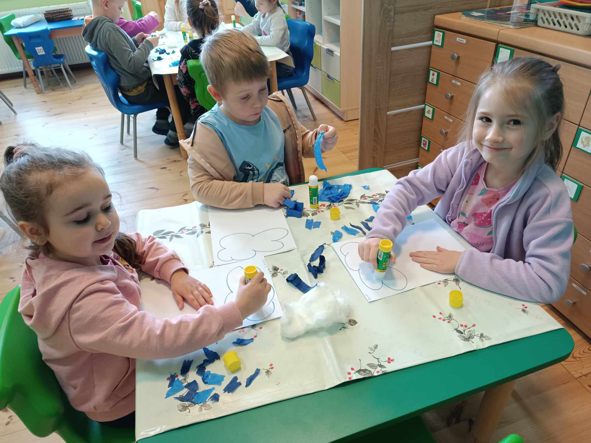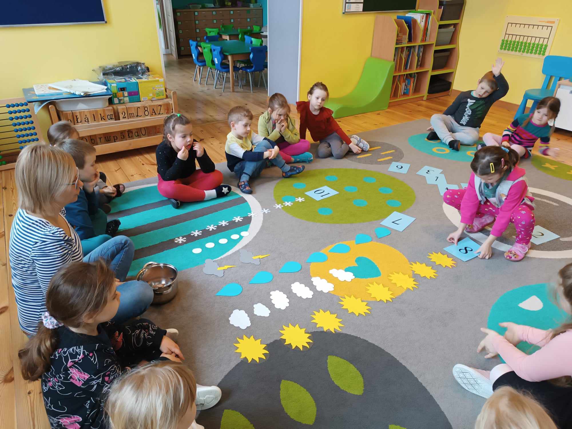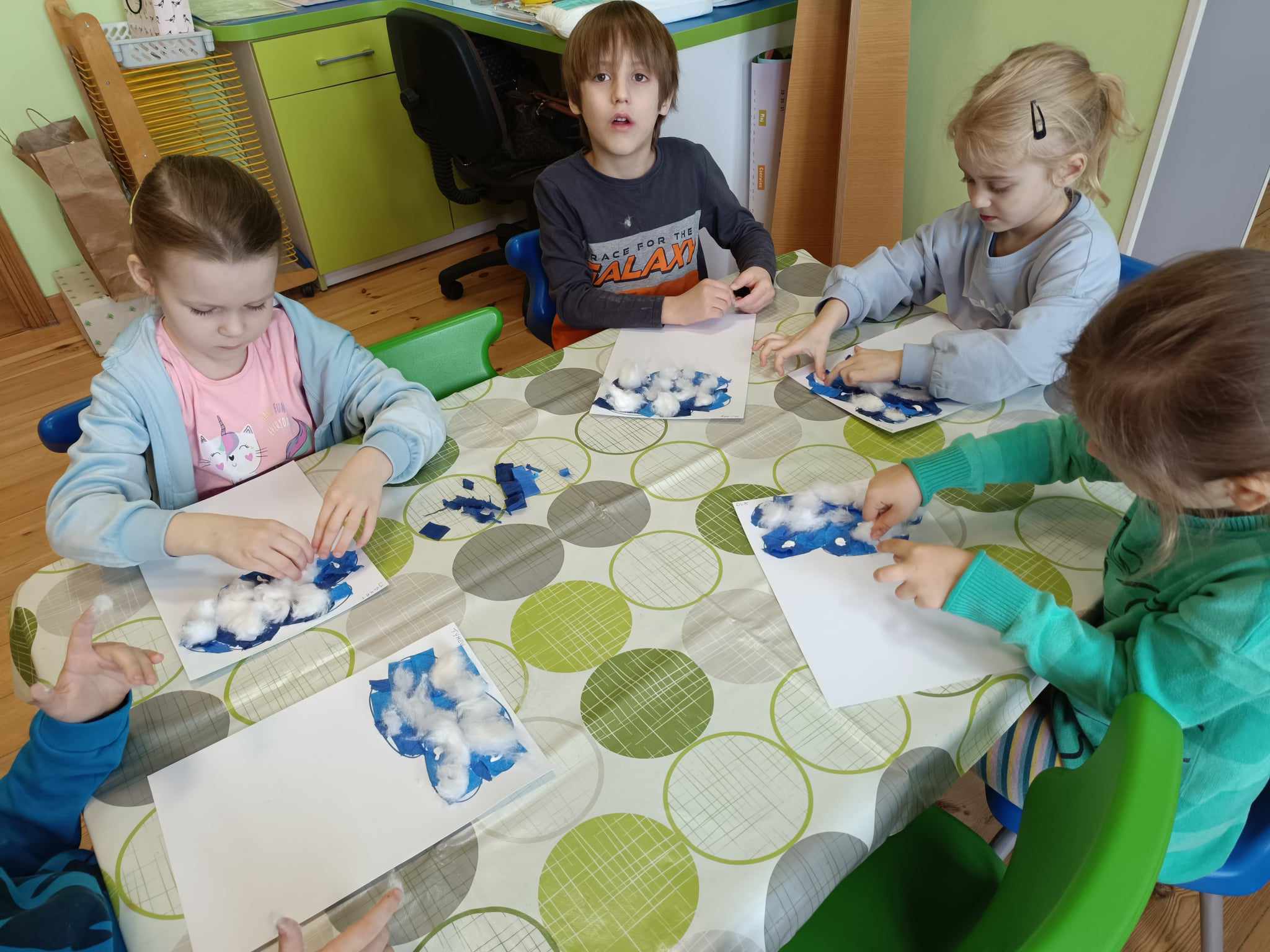 Grupa starsza na dzisiejszych zajęciach poznała znaczenie przysłowia „W marcu jak w garncu”. Dzieci wspólnie opracowały przepis na marcową pogodę z zastosowaniem zabaw matematycznych: utrwaliły liczebniki główne i porządkowe, tworzyły ciągi rytmiczne z trzech sekwencji. Ponadto wzięły udział w zabawie badawczej: „Co pływa a co tonie”. Zwieńczeniem zajęć było wykonanie pracy „Deszczowa chmura”.