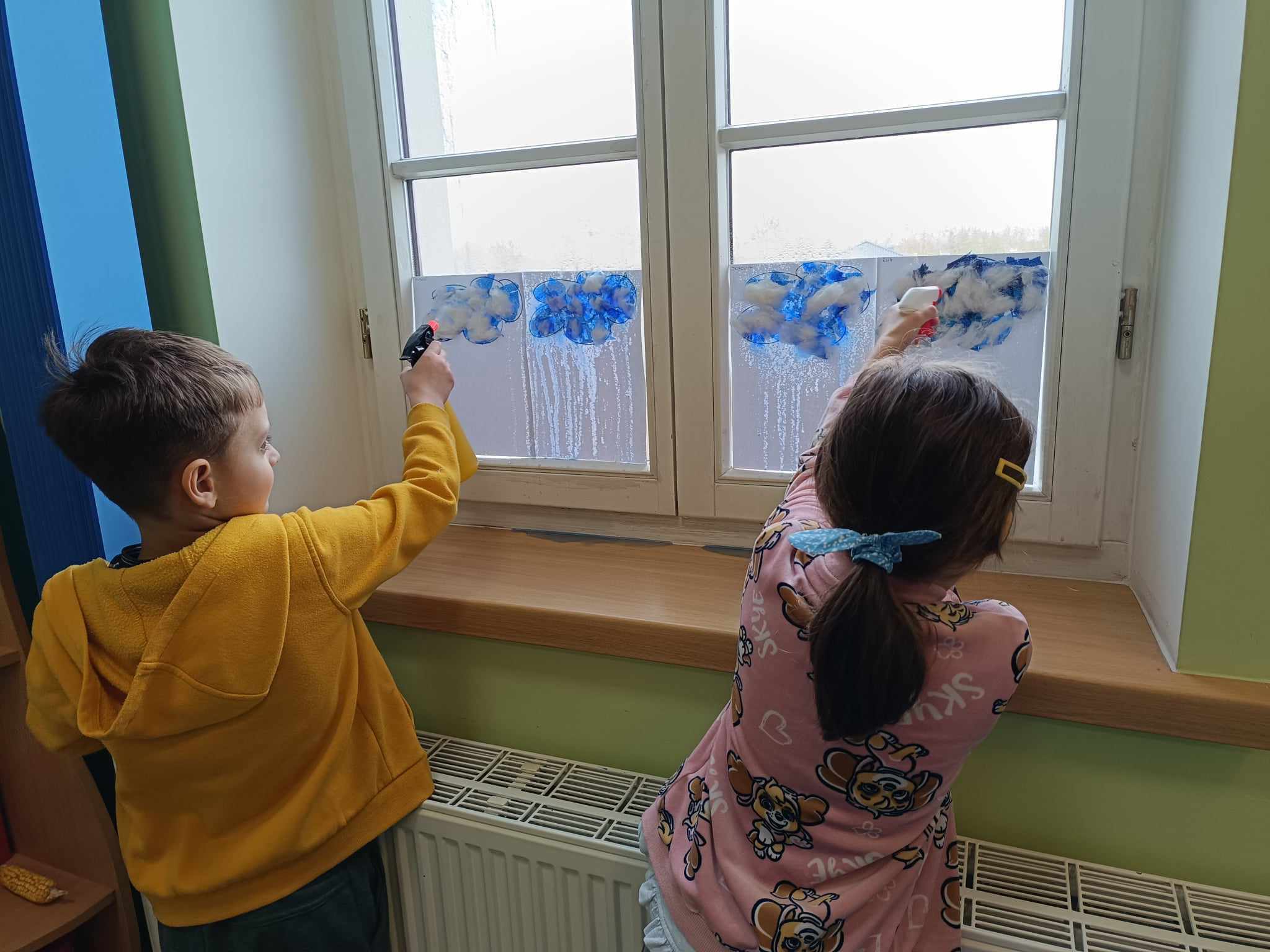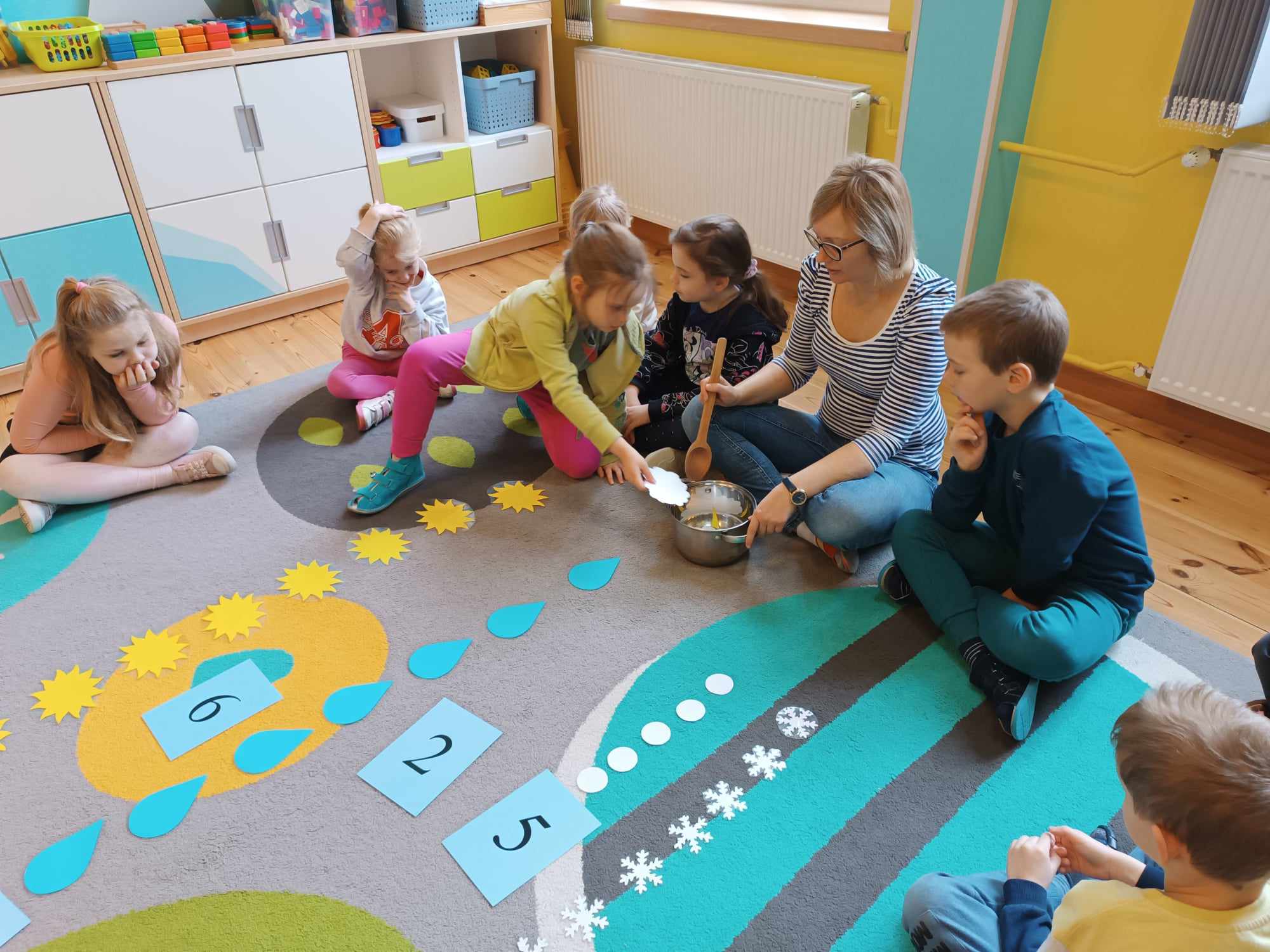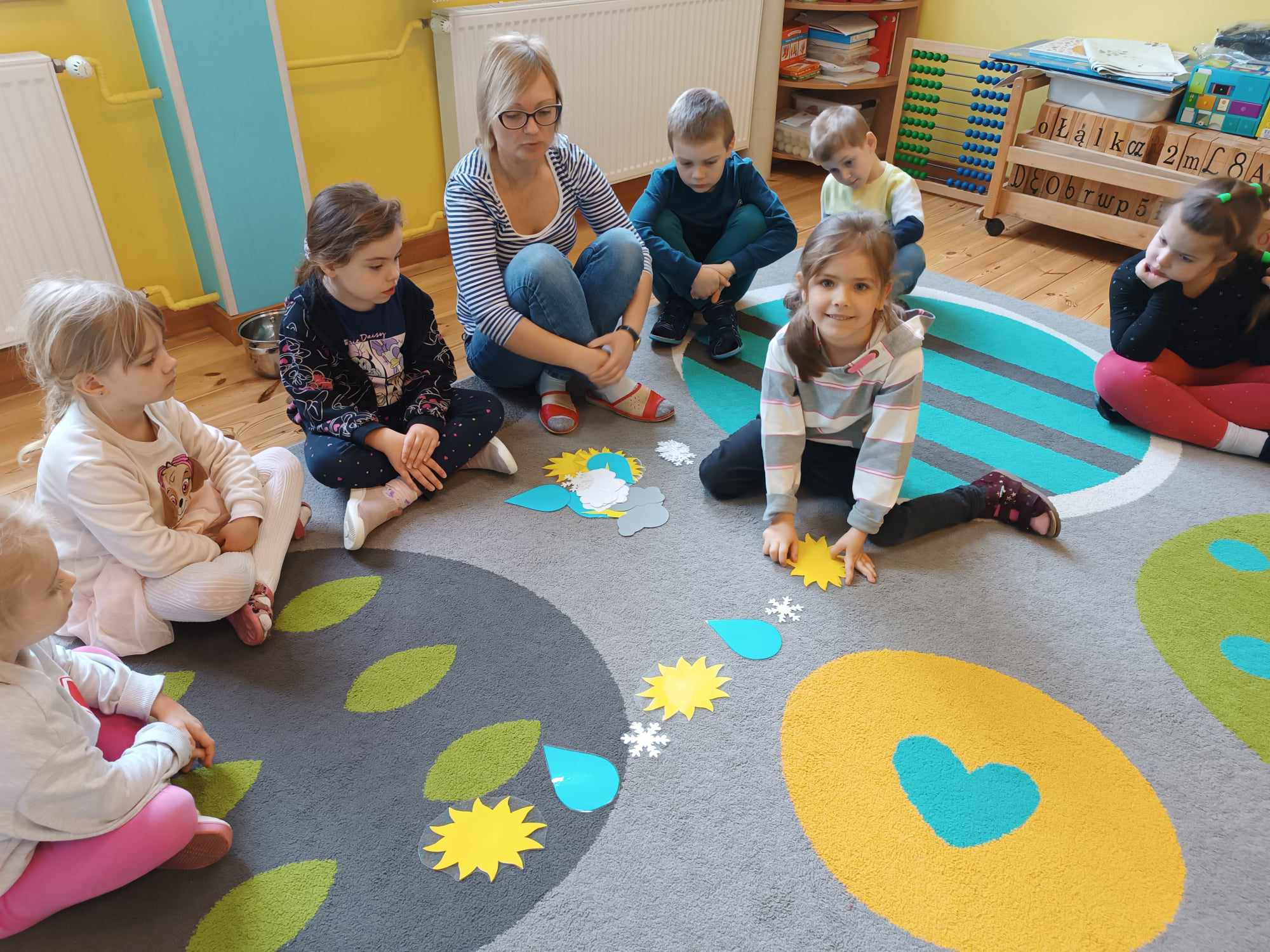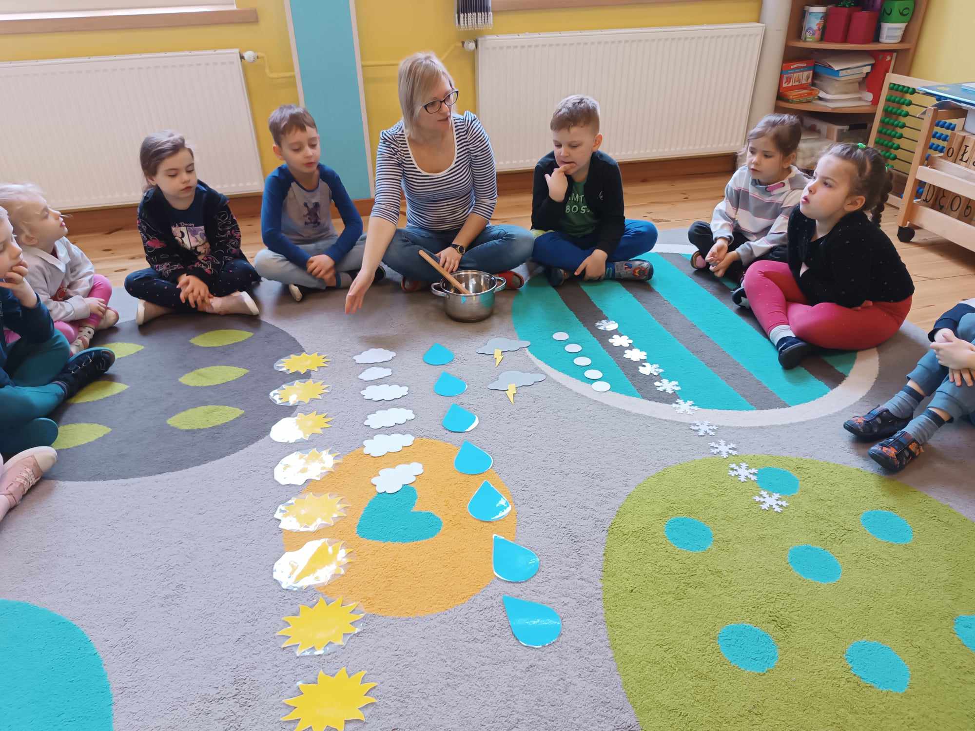 Grupa starsza na dzisiejszych zajęciach poznała znaczenie przysłowia „W marcu jak w garncu”. Dzieci wspólnie opracowały przepis na marcową pogodę z zastosowaniem zabaw matematycznych: utrwaliły liczebniki główne i porządkowe, tworzyły ciągi rytmiczne z trzech sekwencji. Ponadto wzięły udział w zabawie badawczej: „Co pływa a co tonie”. Zwieńczeniem zajęć było wykonanie pracy „Deszczowa chmura”.