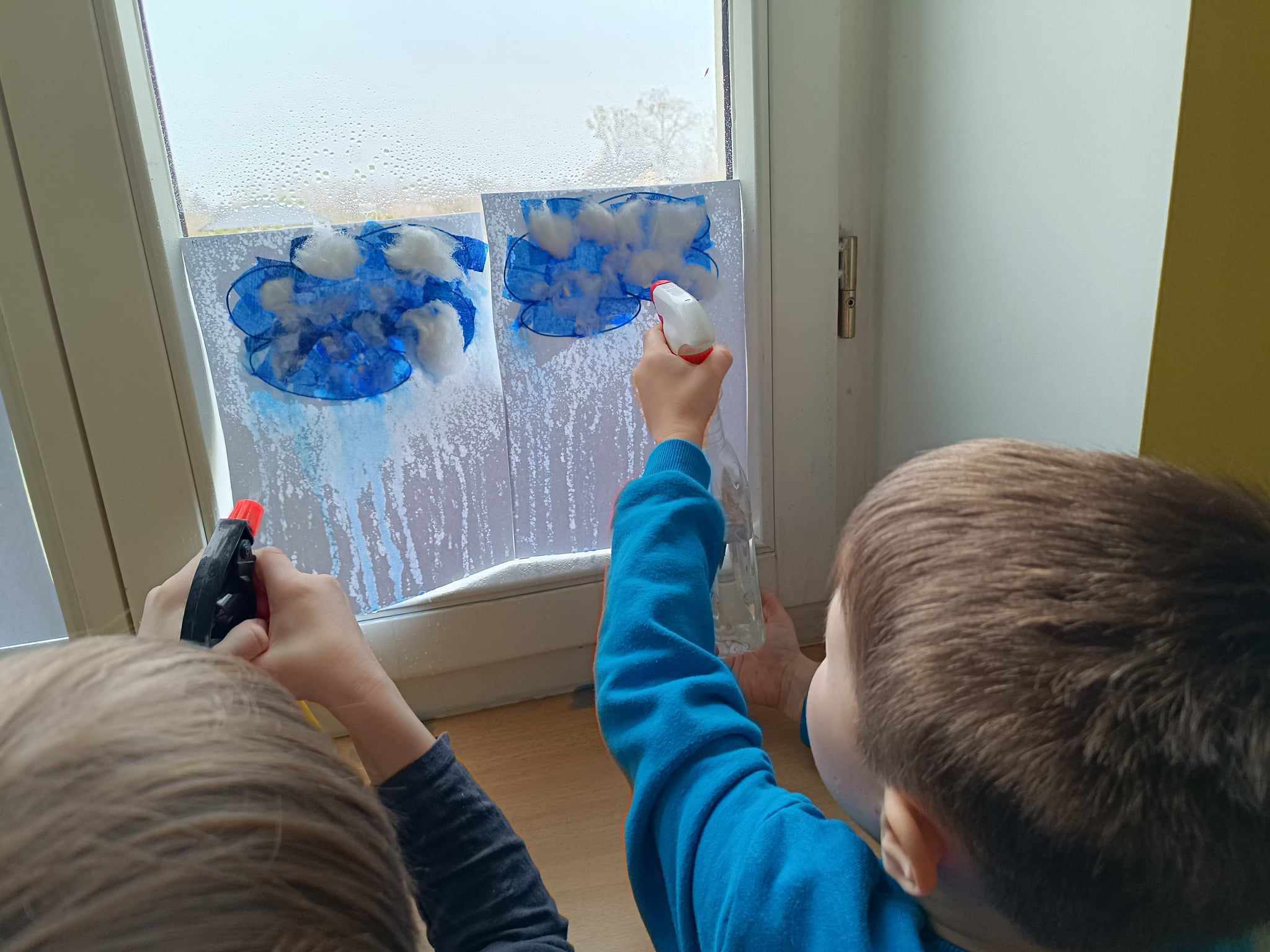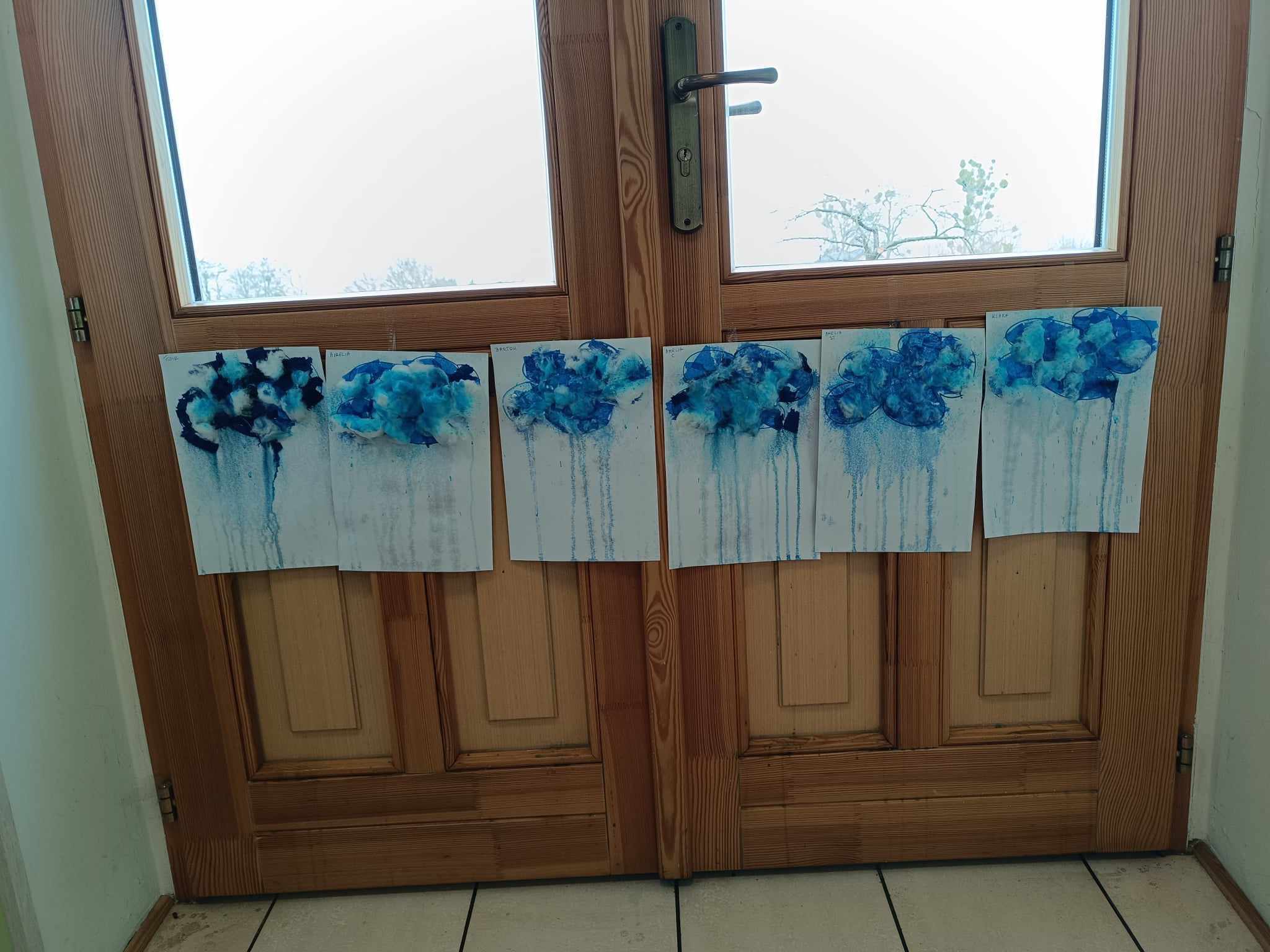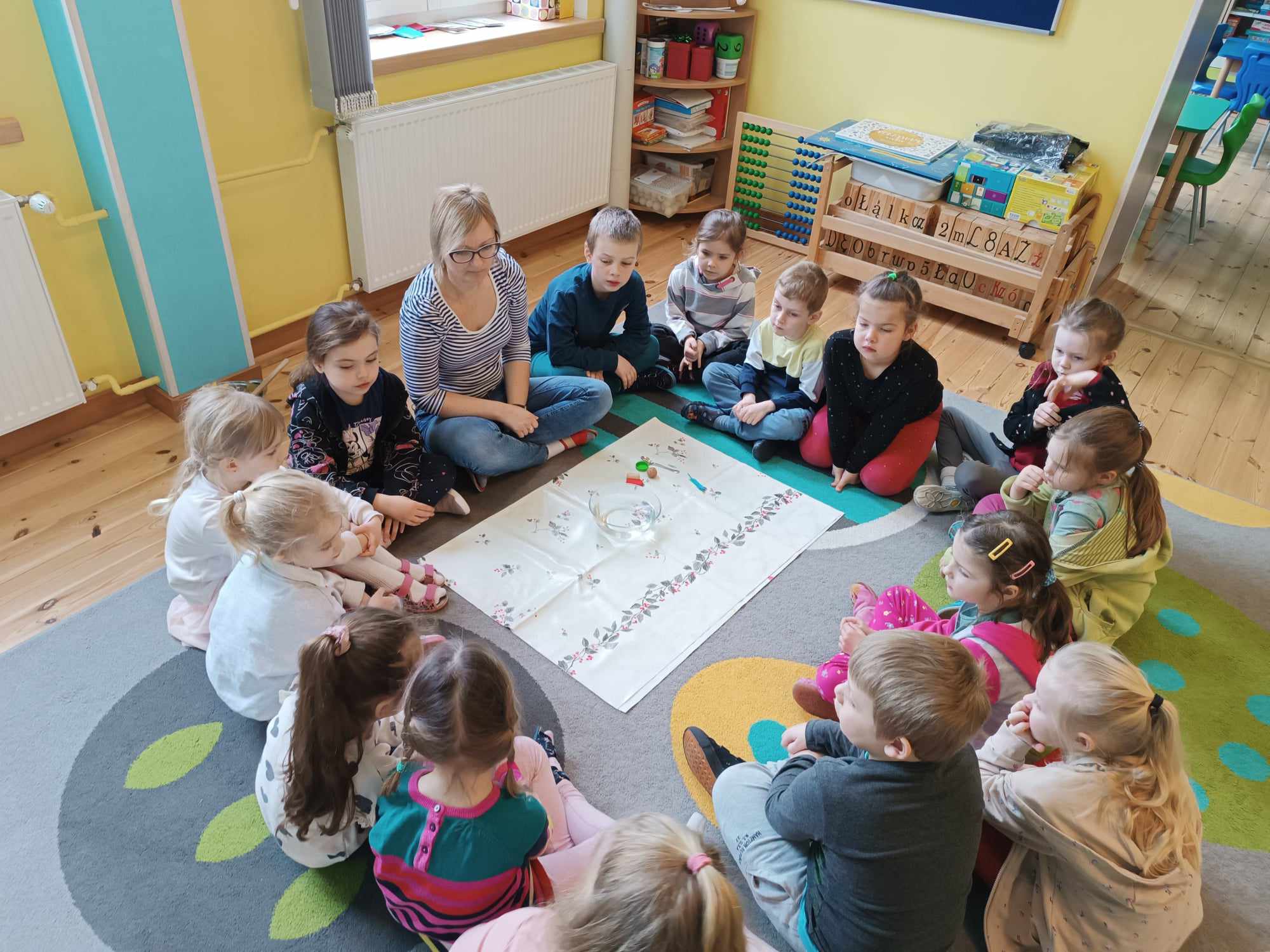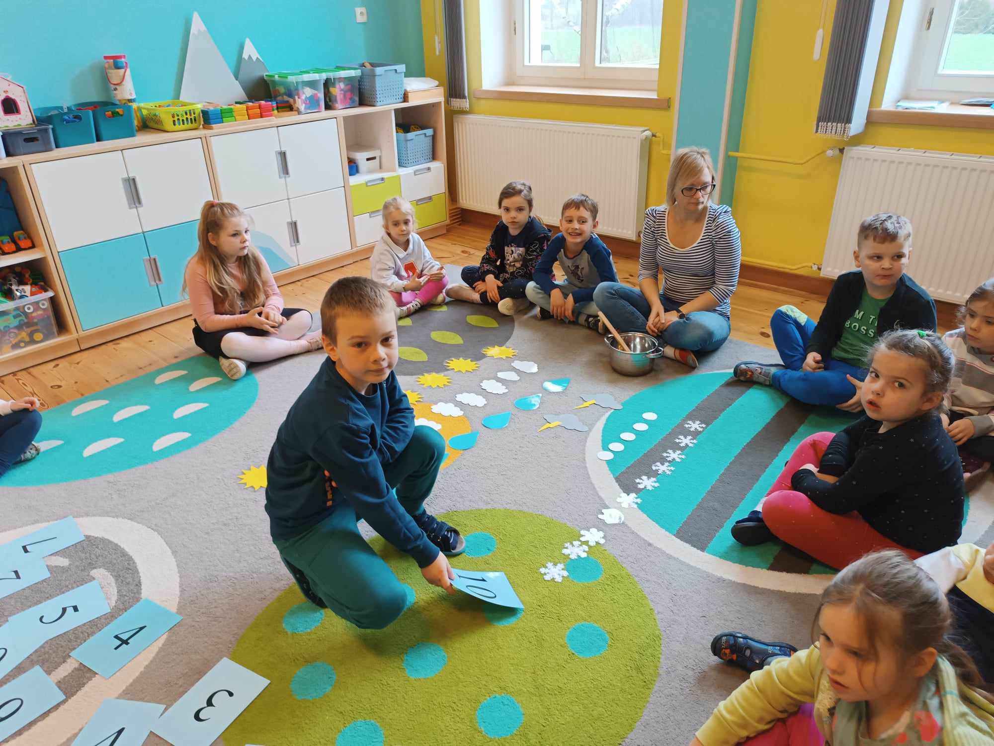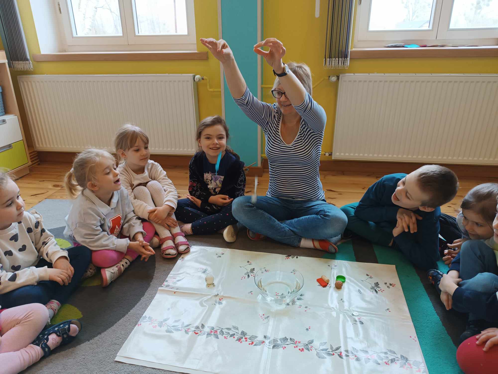 Grupa starsza na dzisiejszych zajęciach poznała znaczenie przysłowia „W marcu jak w garncu”. Dzieci wspólnie opracowały przepis na marcową pogodę z zastosowaniem zabaw matematycznych: utrwaliły liczebniki główne i porządkowe, tworzyły ciągi rytmiczne z trzech sekwencji. Ponadto wzięły udział w zabawie badawczej: „Co pływa a co tonie”. Zwieńczeniem zajęć było wykonanie pracy „Deszczowa chmura”.