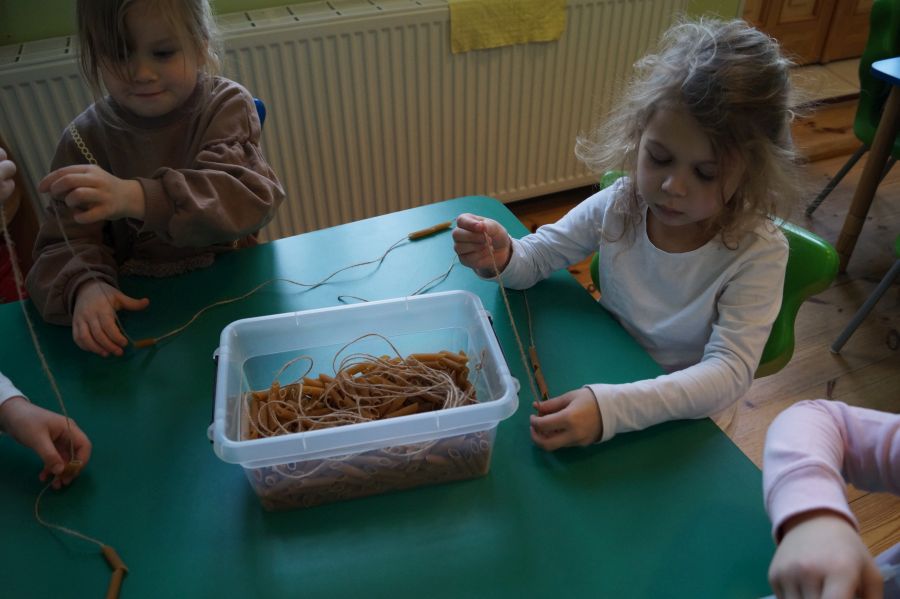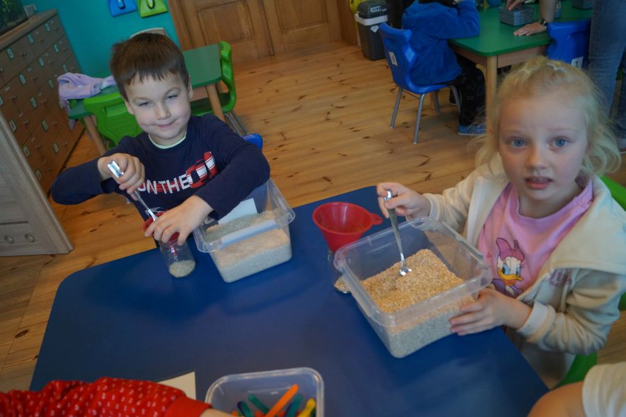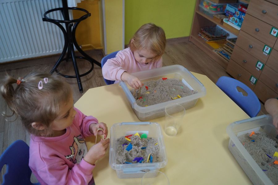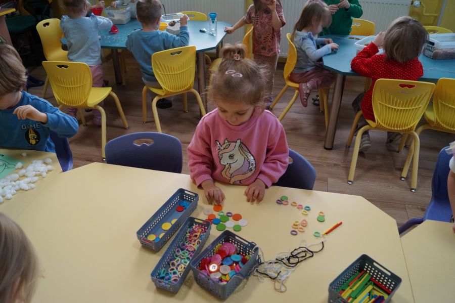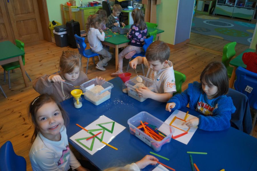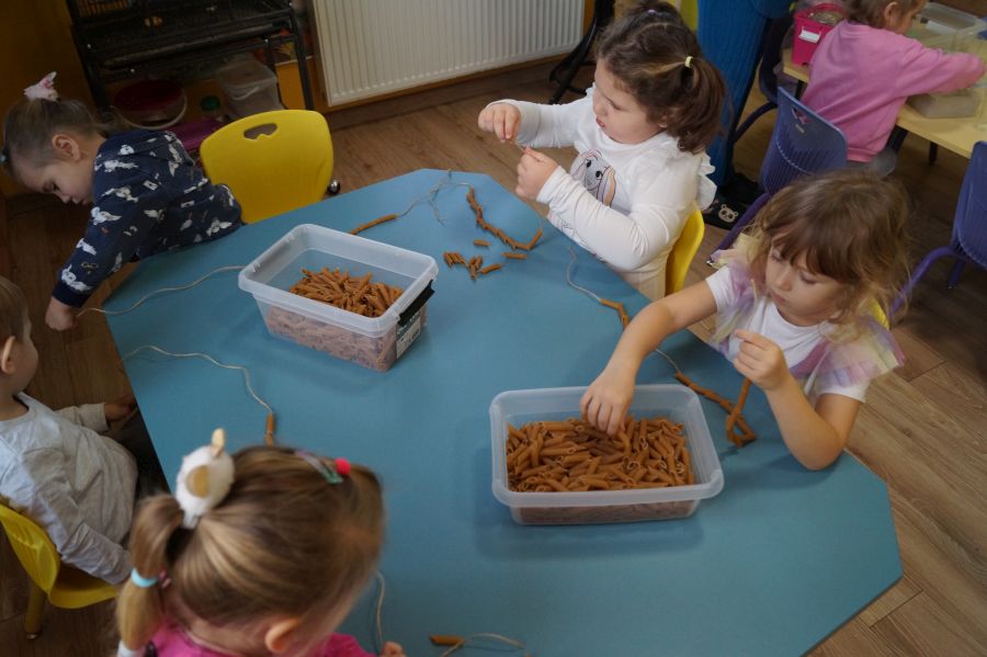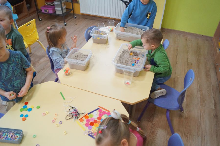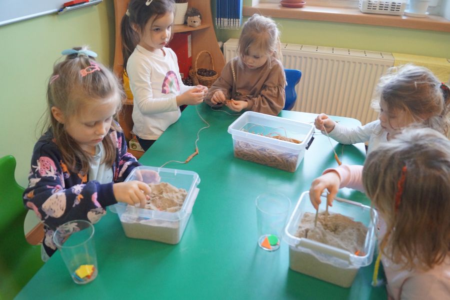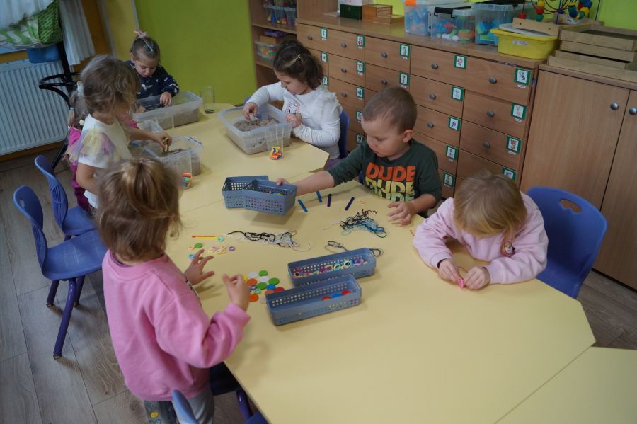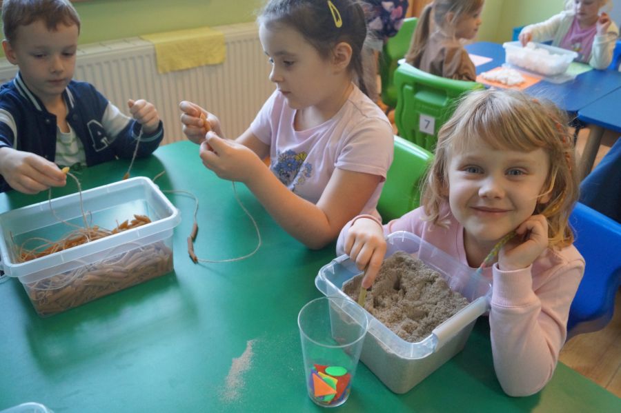 Podczas dzisiejszych zajęć dzieci ze starszej i młodszej grupy przedszkolnej pracowały na kilku stanowiskach rozwijających motorykę małą, koncentrację oraz kreatywność. Wykonywały różnorodne zadania: segregowały kształty ukryte w piasku, tworzyły własne kompozycje z patyczków, guzików i wełny, nawlekały „makaronowe korale”, przesypywały ryż i kaszę, a także układały rytmy z patyczków. Takie aktywności wspierają sprawność dłoni i palców, koordynację wzrokowo–ruchową, logiczne myślenie, a także cierpliwość i samodzielność. Dzieci uczyły się poprzez zabawę, eksperymentowanie i działanie, rozwijając jednocześnie swoją wyobraźnię oraz umiejętność skupienia uwagi.